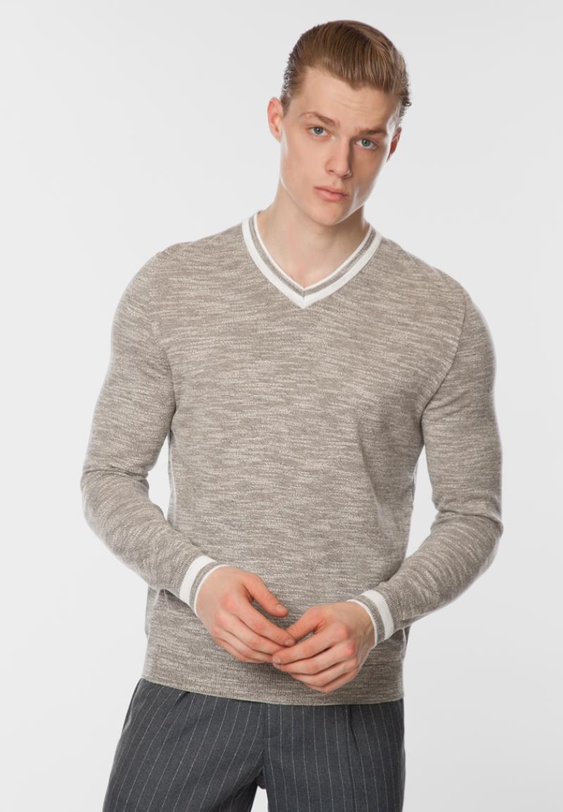 Пуловер чоловічий сірий ARBER з V-подібним вирізом з тонкої меланжевої пряжі на натуральній бавовняній основі. Манжети та лінія низу з набірної резинки декоровані контрастними смугами сірого та білого кольорів.