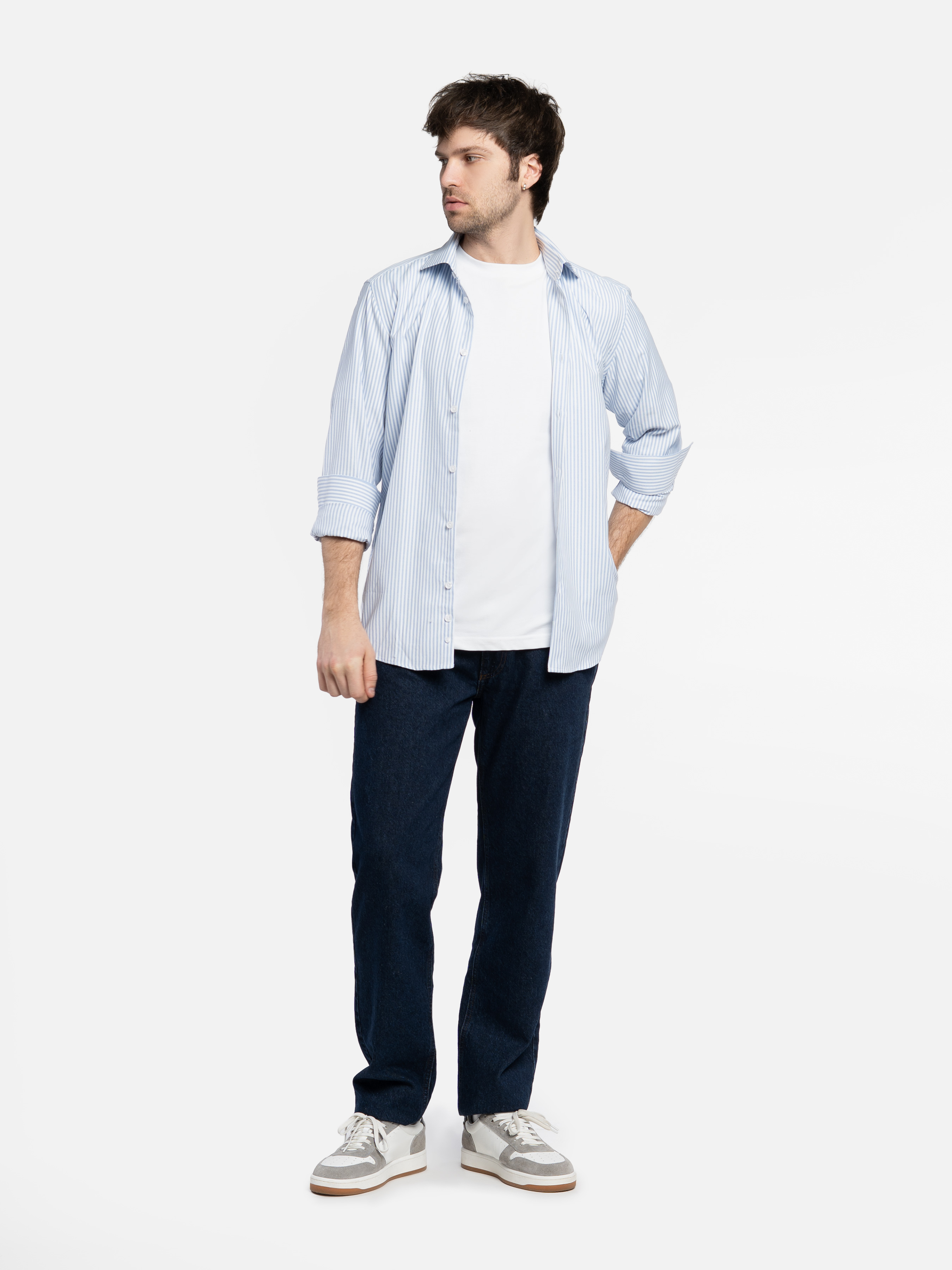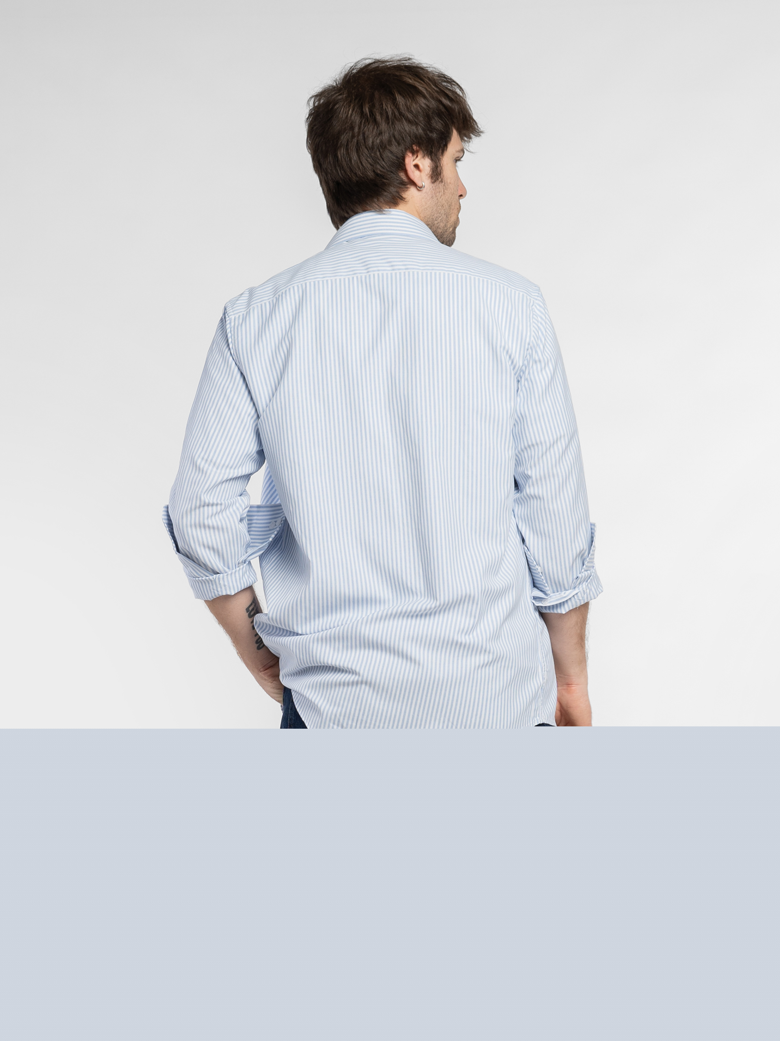 Чоловіча сорочка Arber блакинтного кольору у смужку. Модель напівприлеглого силуету створена з легкої тканини на основі бавовни та льону забезпечує комфорт і повітропроникність упродовж усього дня. Модель з круглим коміром та регульованими манжетами які застібаються на ґудзик, на спинці оброблена подвійна притачна кокетка, лінія низу фігурної форми. Універсальна сорочка у стилі casual ідеально доповнить ваш гардероб, роблячи модель незамінною у теплий сезон. Модель на фото у розмірі 48. Зріст: 183 см. Параметри: 94/90/100