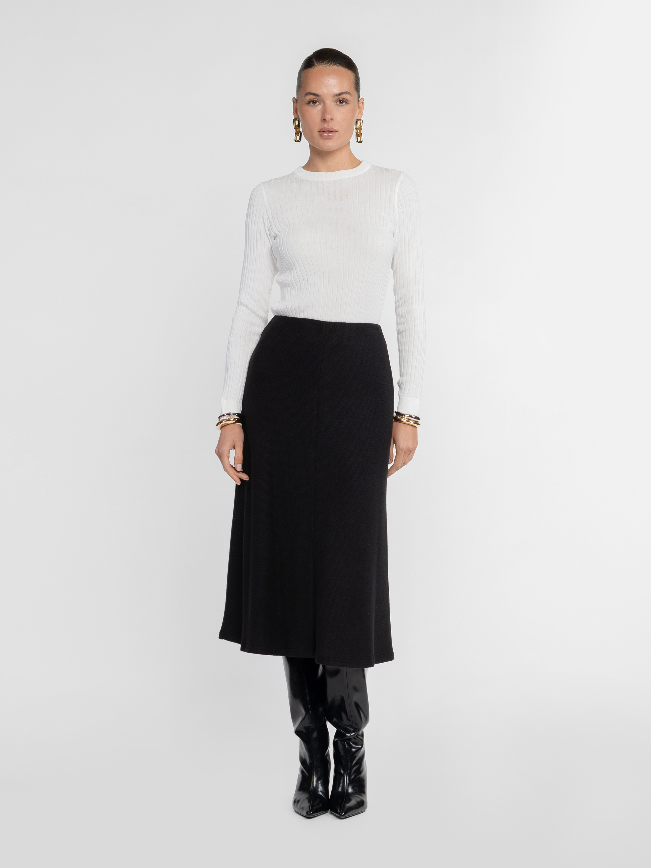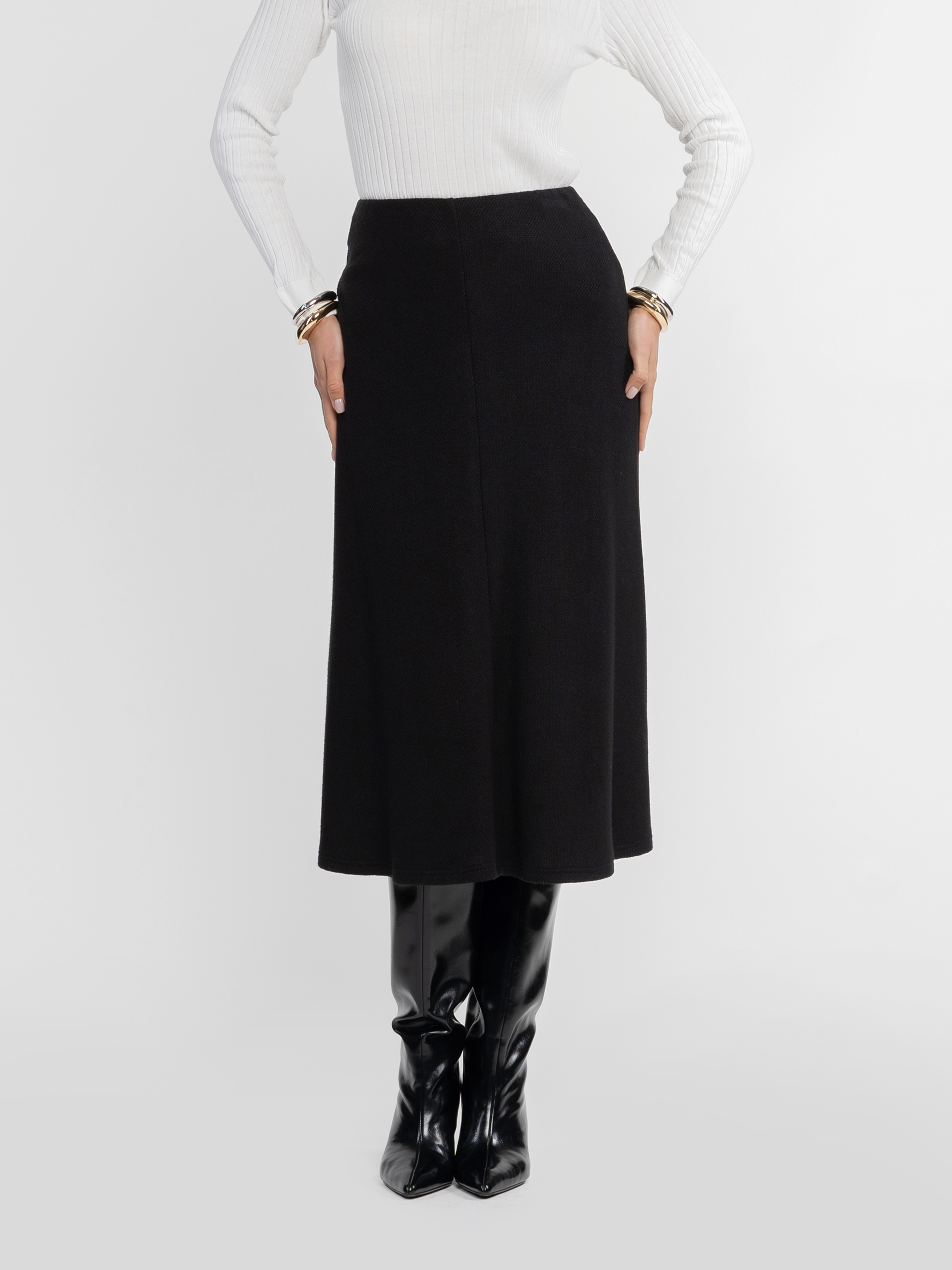 Жіноча трикотажна спідниця Arber чорного кольору створена з м’якої еластичної тканини з ефектом в’язки. Злегка розкльошений силует додає виробу витонченості, а застібка на блискавці забезпечує зручність та бездоганну посадку. Ідеально поєднується з жакетом W02.07.02.535 або W02.08.02.535 із тієї ж тканини, створюючи елегантний total look. Легко стилізується із сорочками чи джемперами — для повсякденних і вечірніх образів. Модель на фото у розмірі 42. Зріст: 168 см. Параметри: 80/62/87
