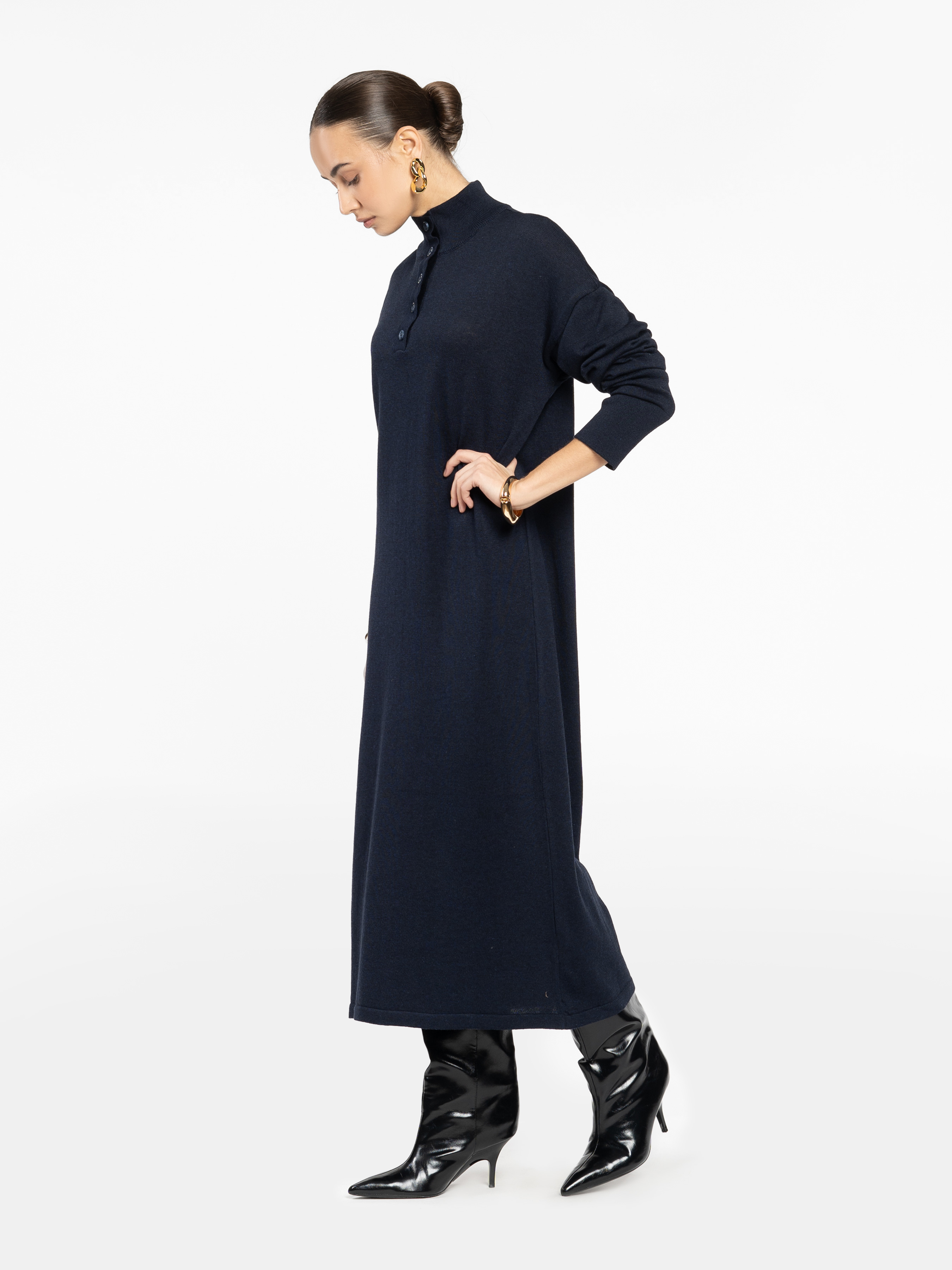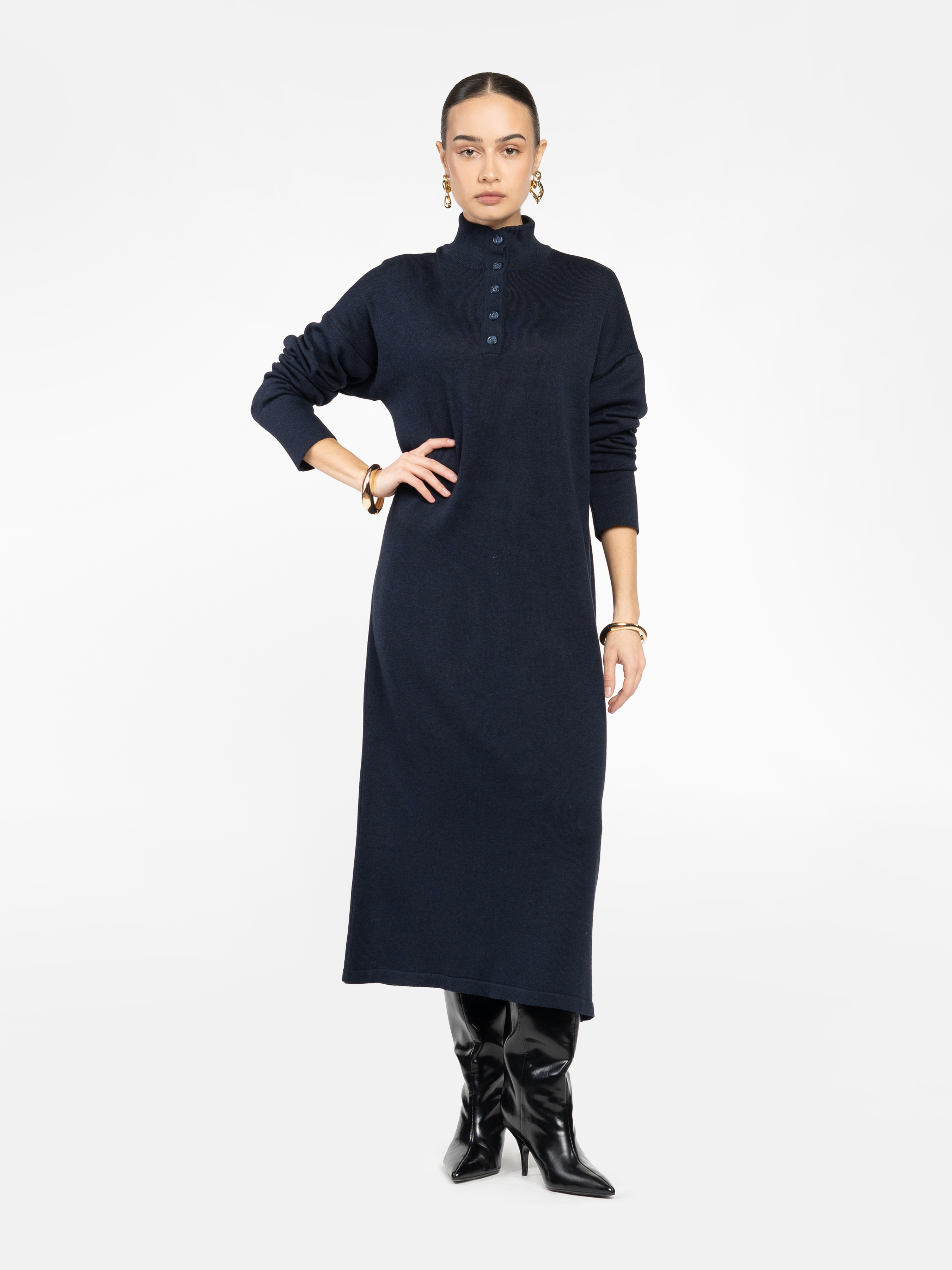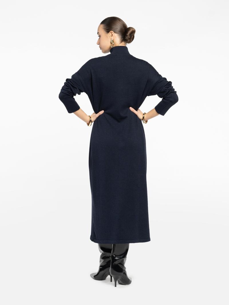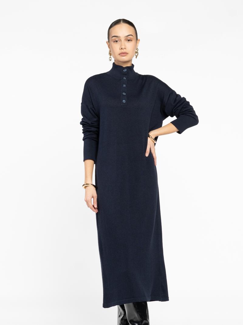 Жіноча сукня Arber синього кольору, довжини міді, прямого силуету. М’який трикотаж з перевагою бавовни комфортний до тіла. Висока горловина на ґудзиках і спущена лінія плеча створюють сучасний, стильний образ. Легко адаптується під будь-який стиль — денний чи вечірній. За бажанням можна доповнити поясом для акценту на талії. Модель на фото: розмір 42, зріст 168 см, параметри 79/60/88.