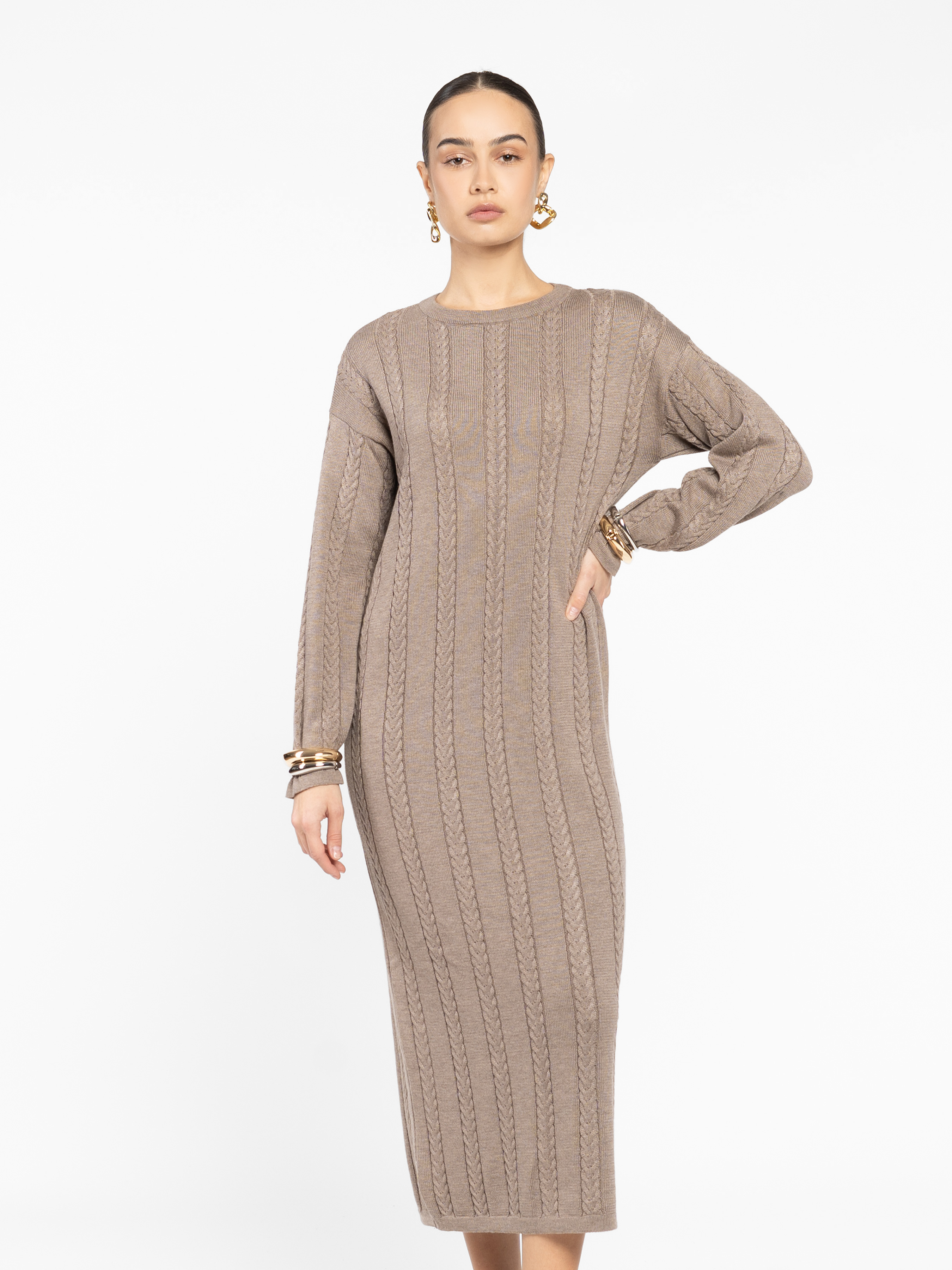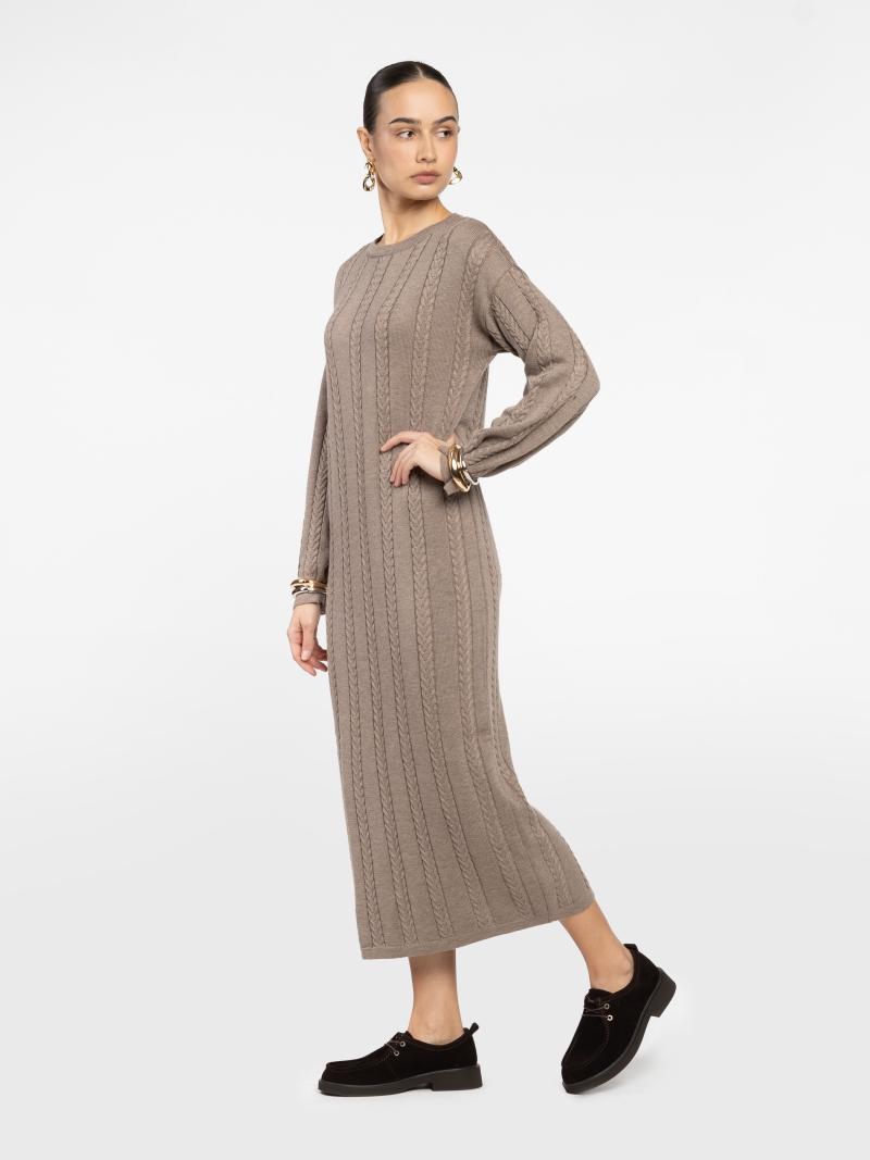 Жіноча сукня Arber бежевого кольору з м’якого трикотажу з натуральними волокнами. Прямий силует елегантно підкреслює фігуру, а текстура «колос» додає об’єму та сучасного шарму. Кругла горловина робить модель універсальною, ідеально поєднується з жакетами, кардиганами або пальто для стильного денного чи вечірнього образу. Модель на фото: розмір 42, зріст 168 см, параметри 79/60/88.