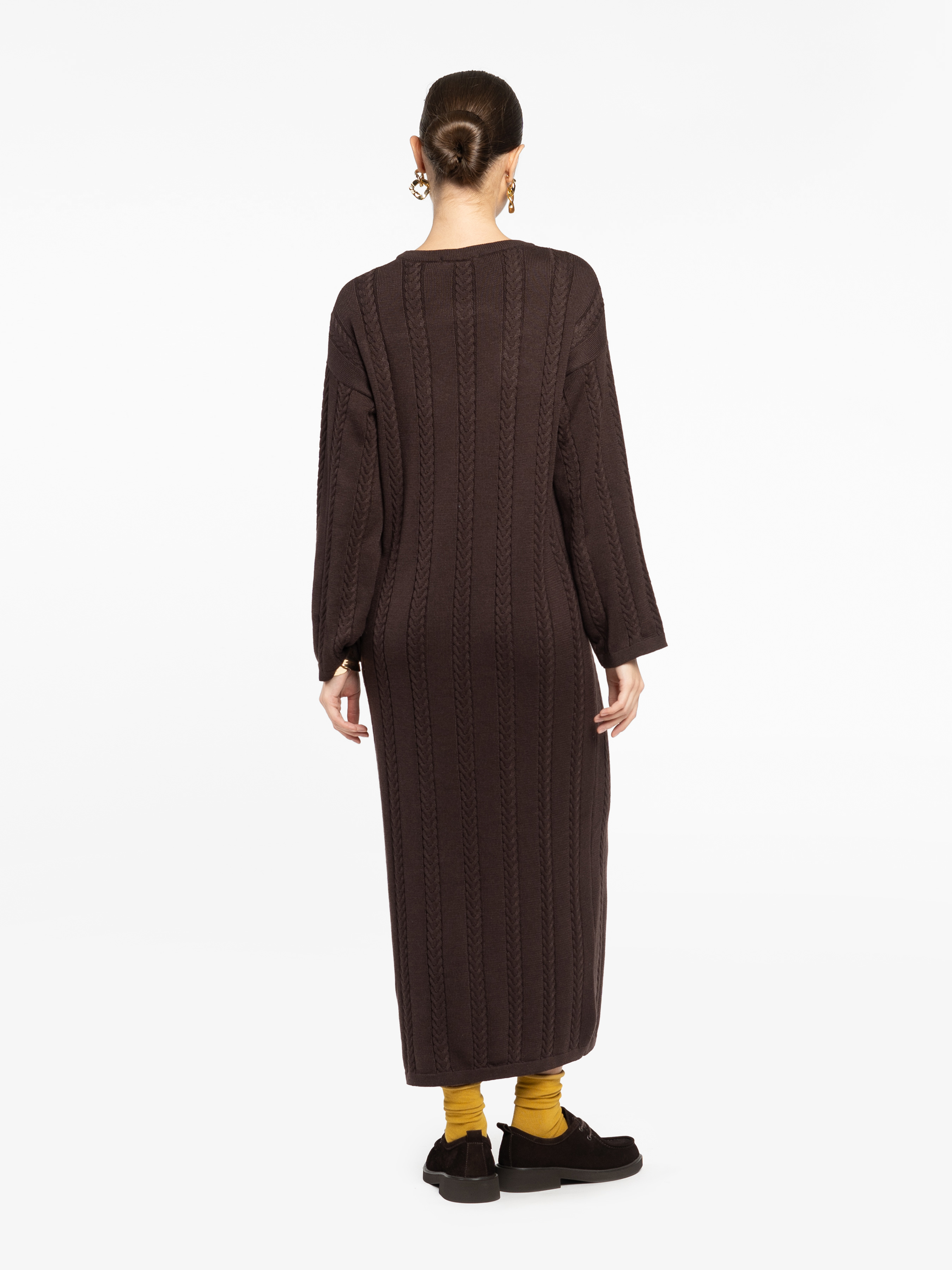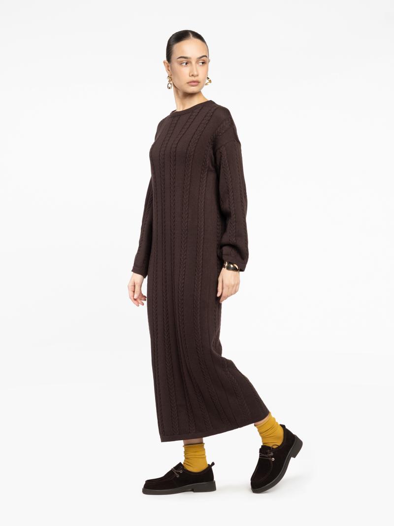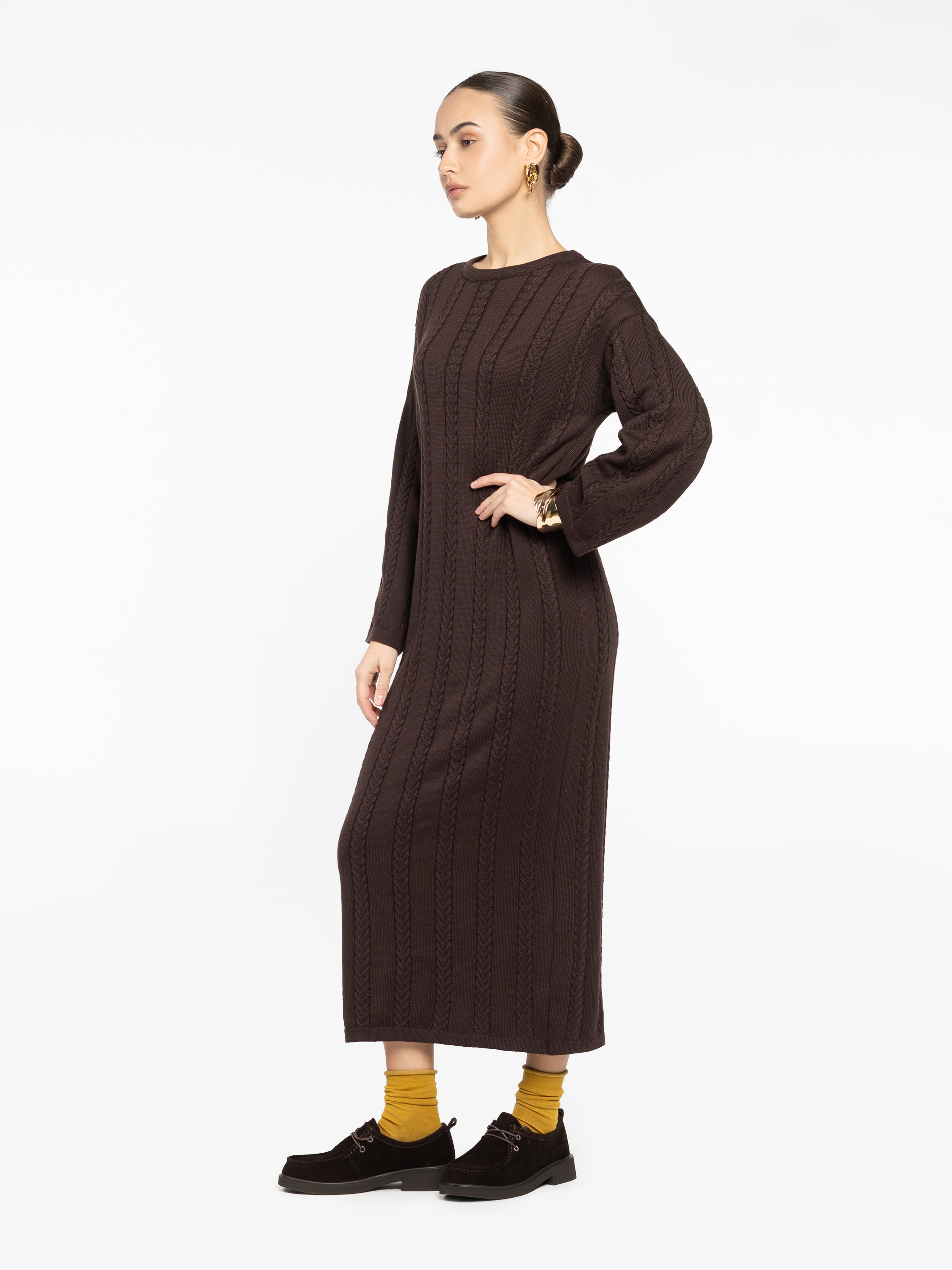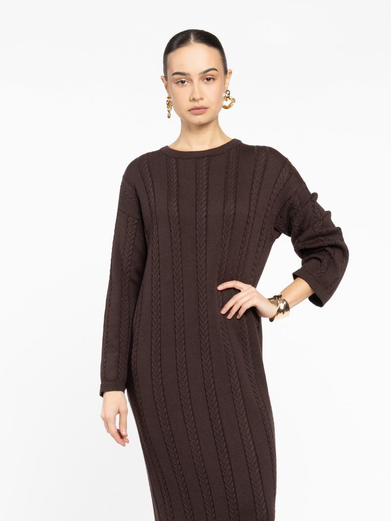 Жіноча сукня Arber коричневого кольору з м’якого трикотажу з натуральними волокнами. Прямий силует елегантно підкреслює фігуру, а текстура «колос» додає об’єму та сучасного шарму. Кругла горловина робить модель універсальною, ідеально поєднується з жакетами, кардиганами або пальто для стильного денного чи вечірнього образу. Модель на фото: розмір 42, зріст 168 см, параметри 79/60/88.