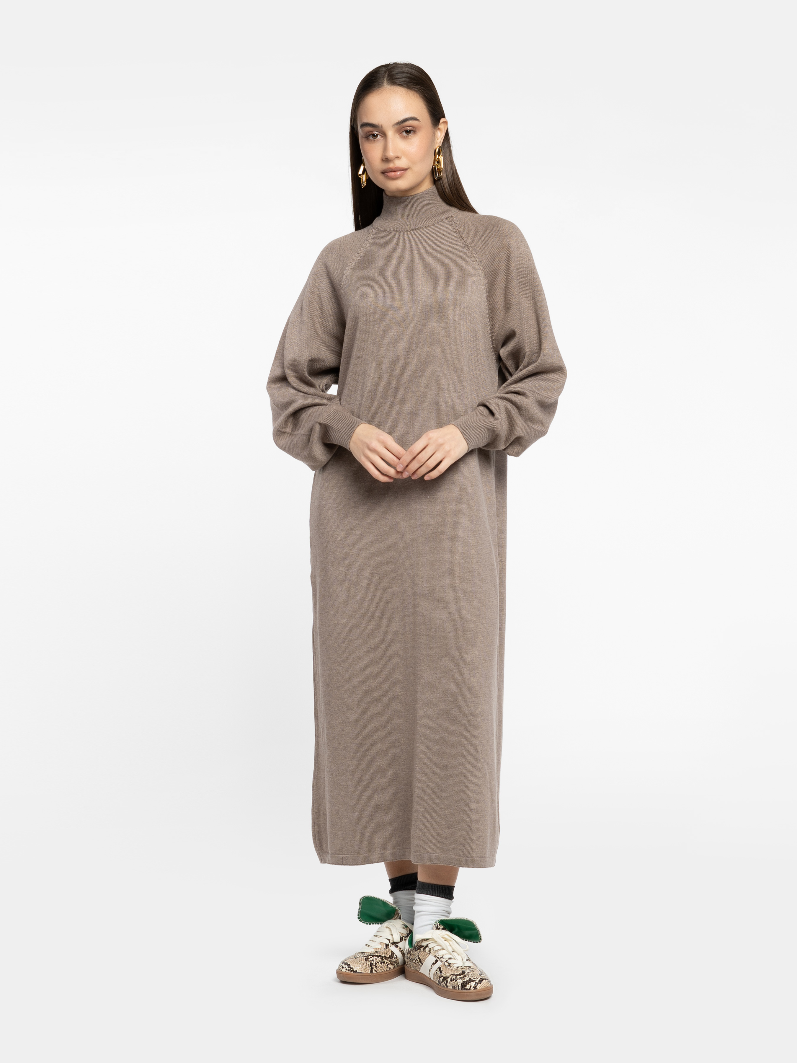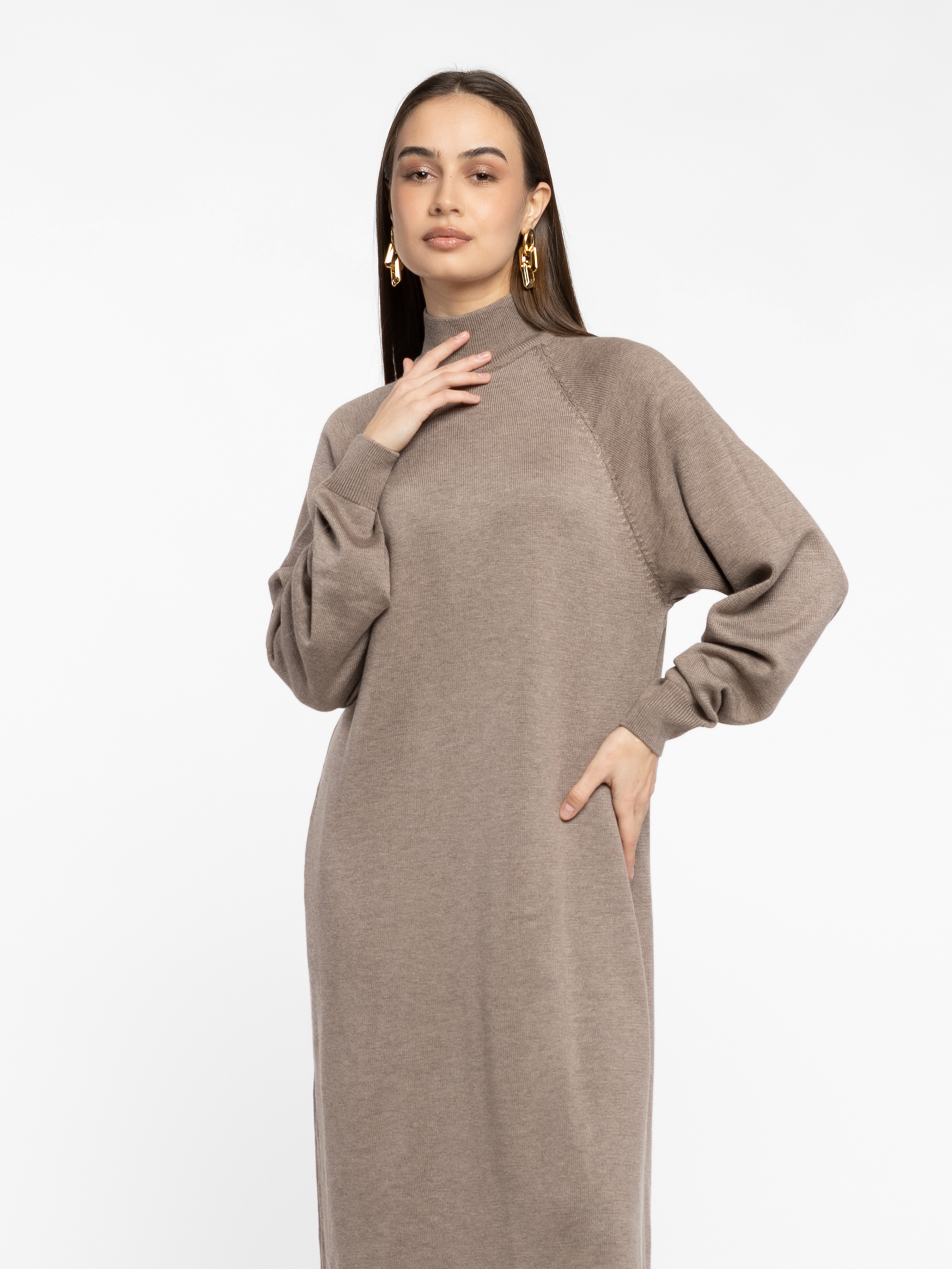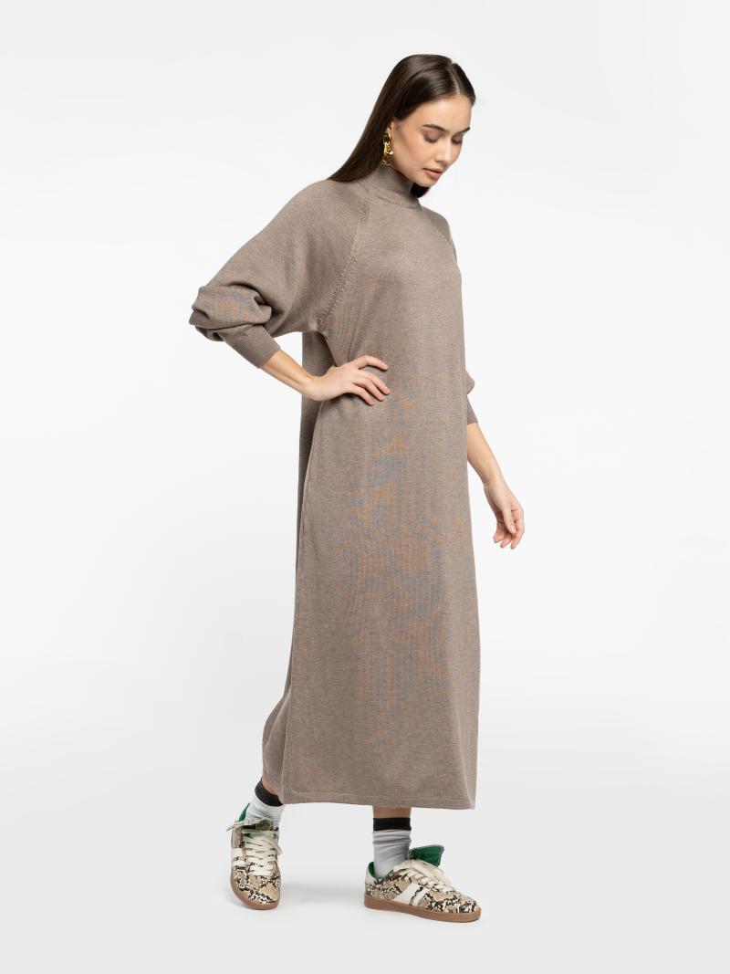 Жіноча сукня Arber бежевого кольору, довжини міді в прямому силуеті. М’який трикотаж з перевагою бавовни, комфортний до тіла. Висока горловина та спущена лінія плеча формують сучасний елегантний образ. Легко адаптується під стиль дня чи вечора. За бажання — можна доповнити поясом для акценту на талії. Модель на фото у розмірі 42. Зріст: 178 см. Параметри: 89/60/90