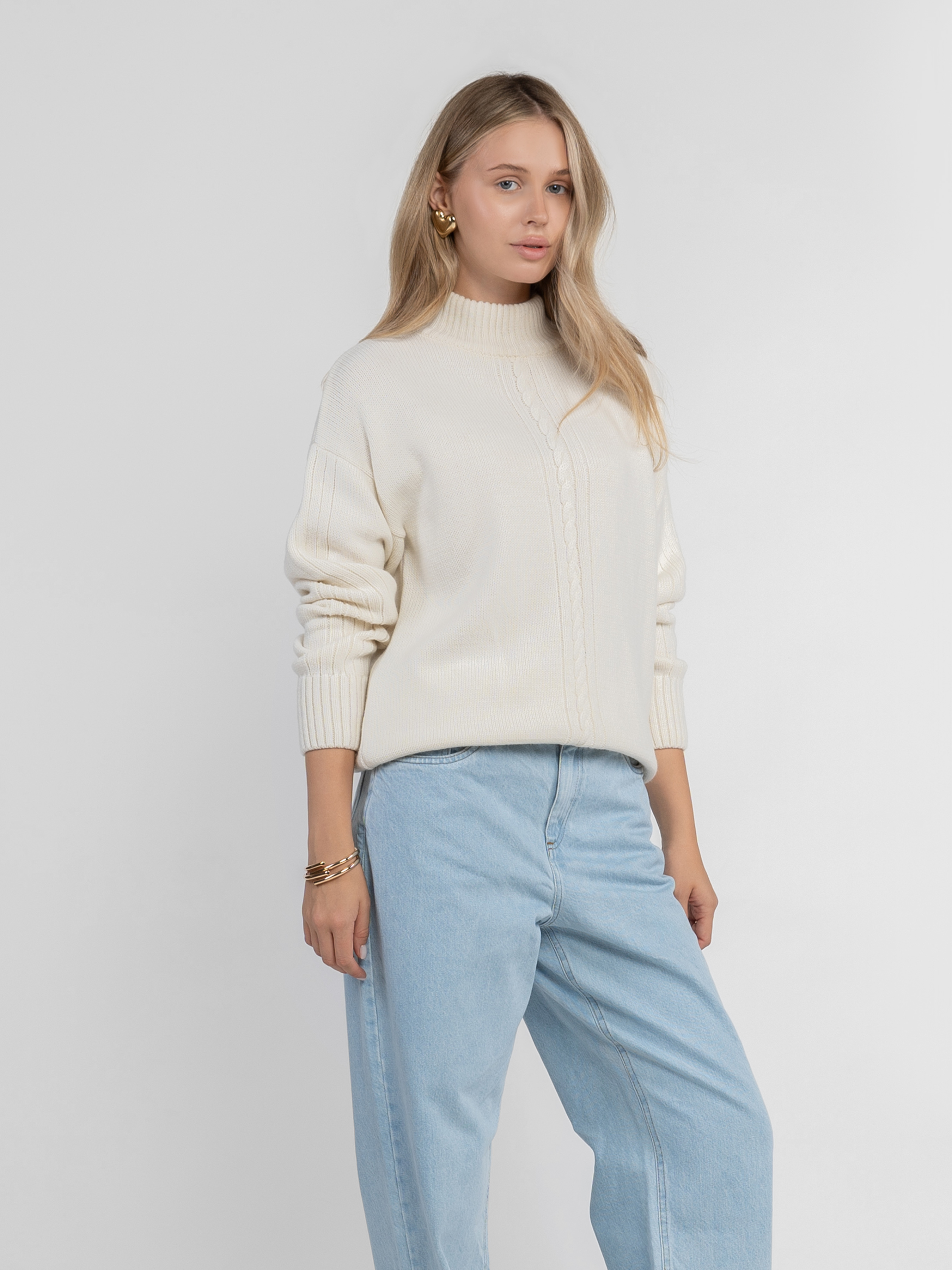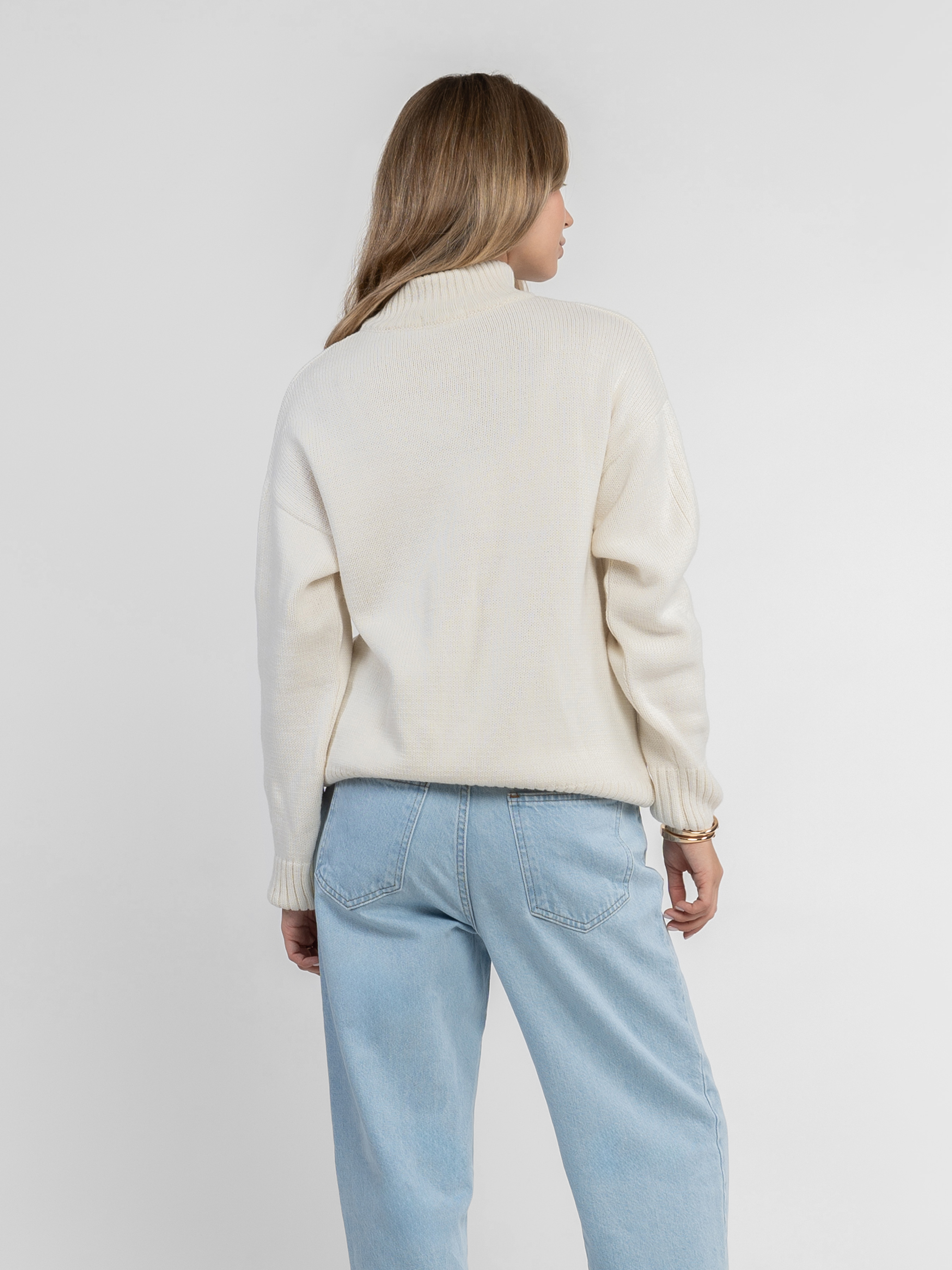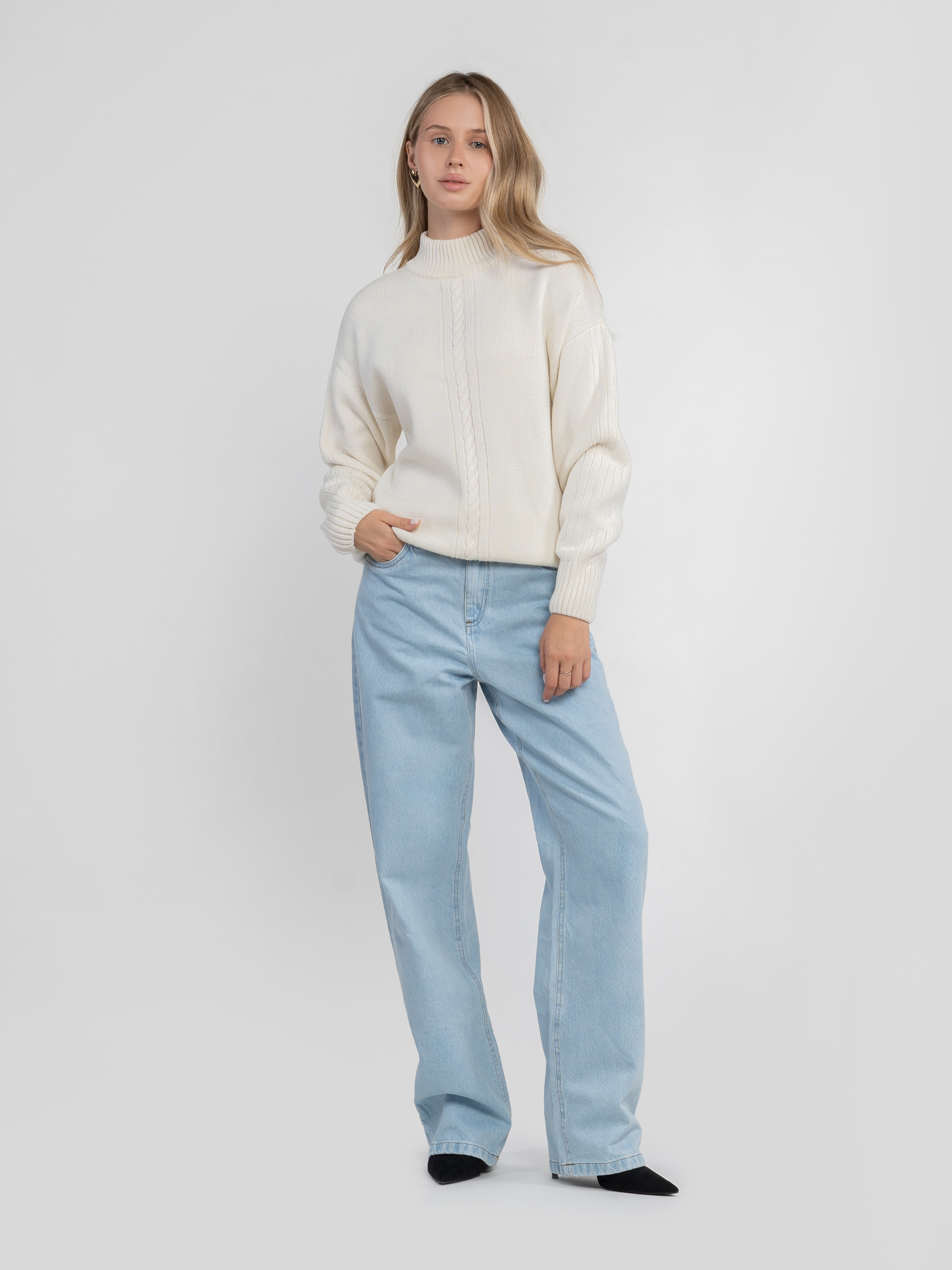 Жіночий светр Arber білого кольору, створений із ніжної вовняної пряжі від престижного італійського бренду Miroglio. М’яке плетіння «рубчик» надає виробу текстурної глибини, а сучасний прямий крій зі широким контрастним коміром та довгими рукавами підкреслює вишуканість силуету. Застібка-блискавка на комірі додає нотку сучасності та практичності. Модель на фото у розмірі 42. Зріст: 168 см. Параметри: 80/62/87