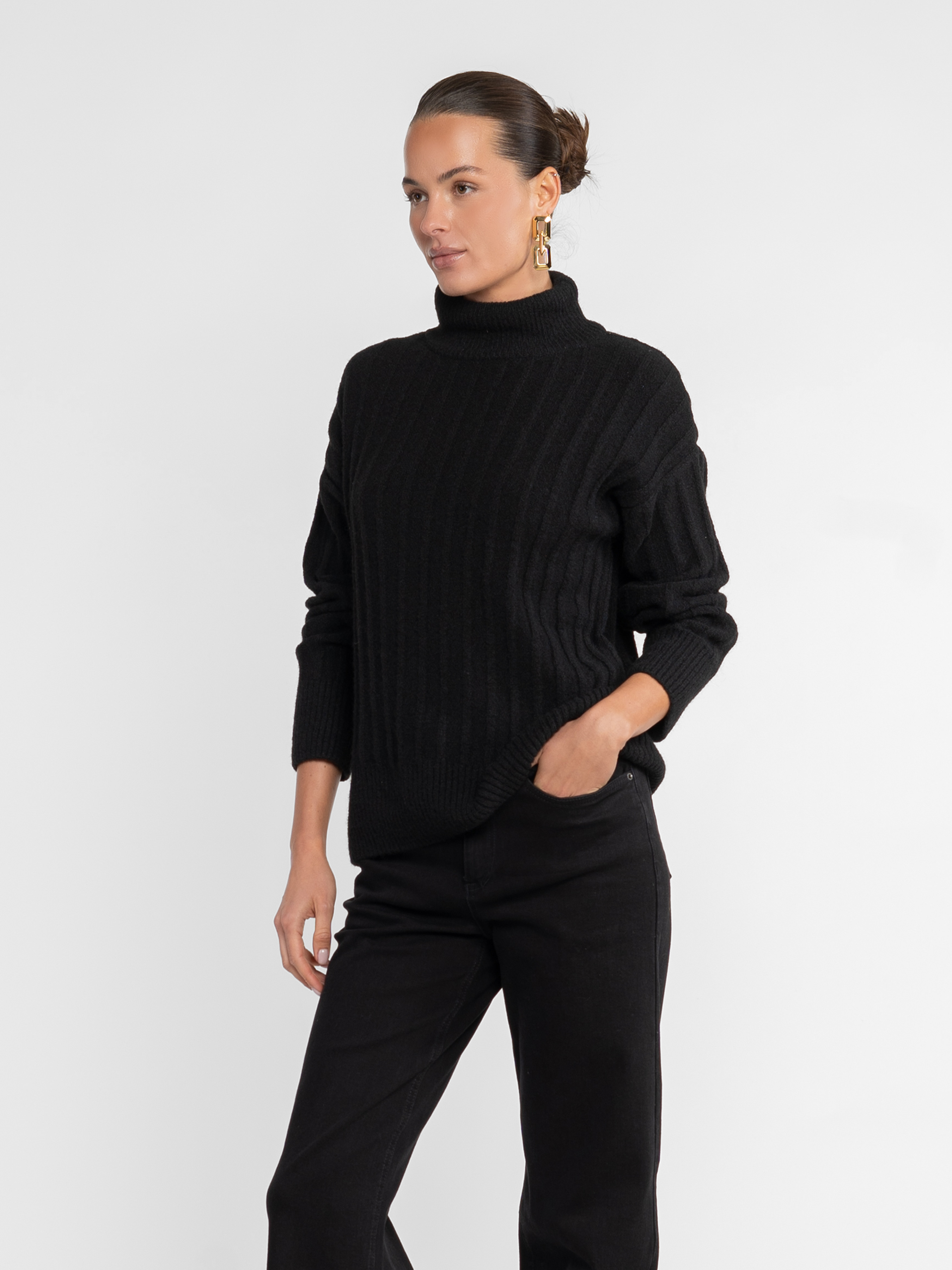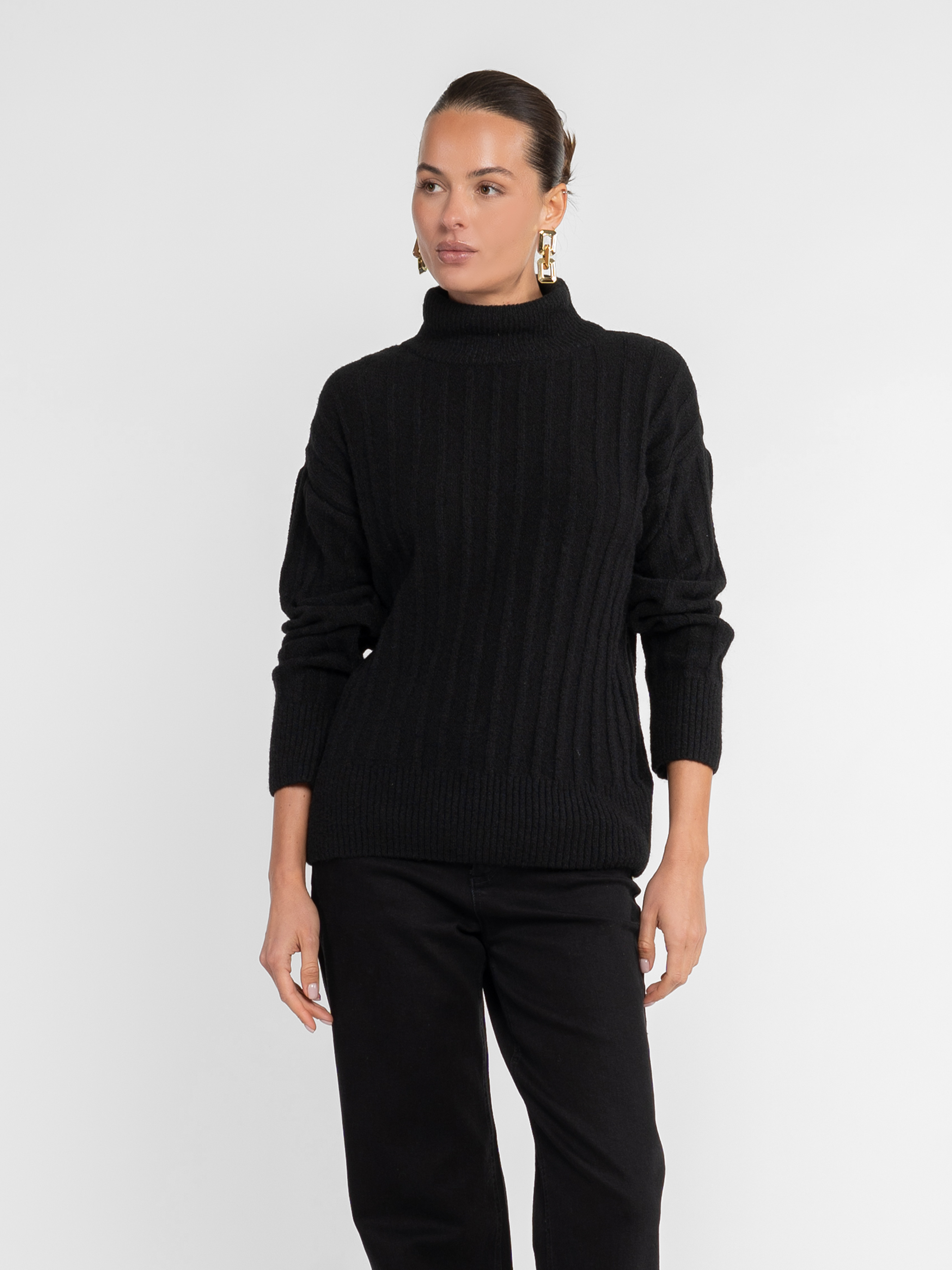 Жіночий светр Arber чорного кольору. Виготовлений із м’якої пряжі з додаванням вовни, з об’ємним фактурним візерунком у вигляді рельєфних смужок. Високий комір додає тепла й сучасного акценту, а лаконічний дизайн робить модель універсальною для щоденних образів. Ідеально поєднується як із джинсами, так і з класичними брюками. Модель на фото у розмірі 42. Зріст: 168 см. Параметри: 86/65/96