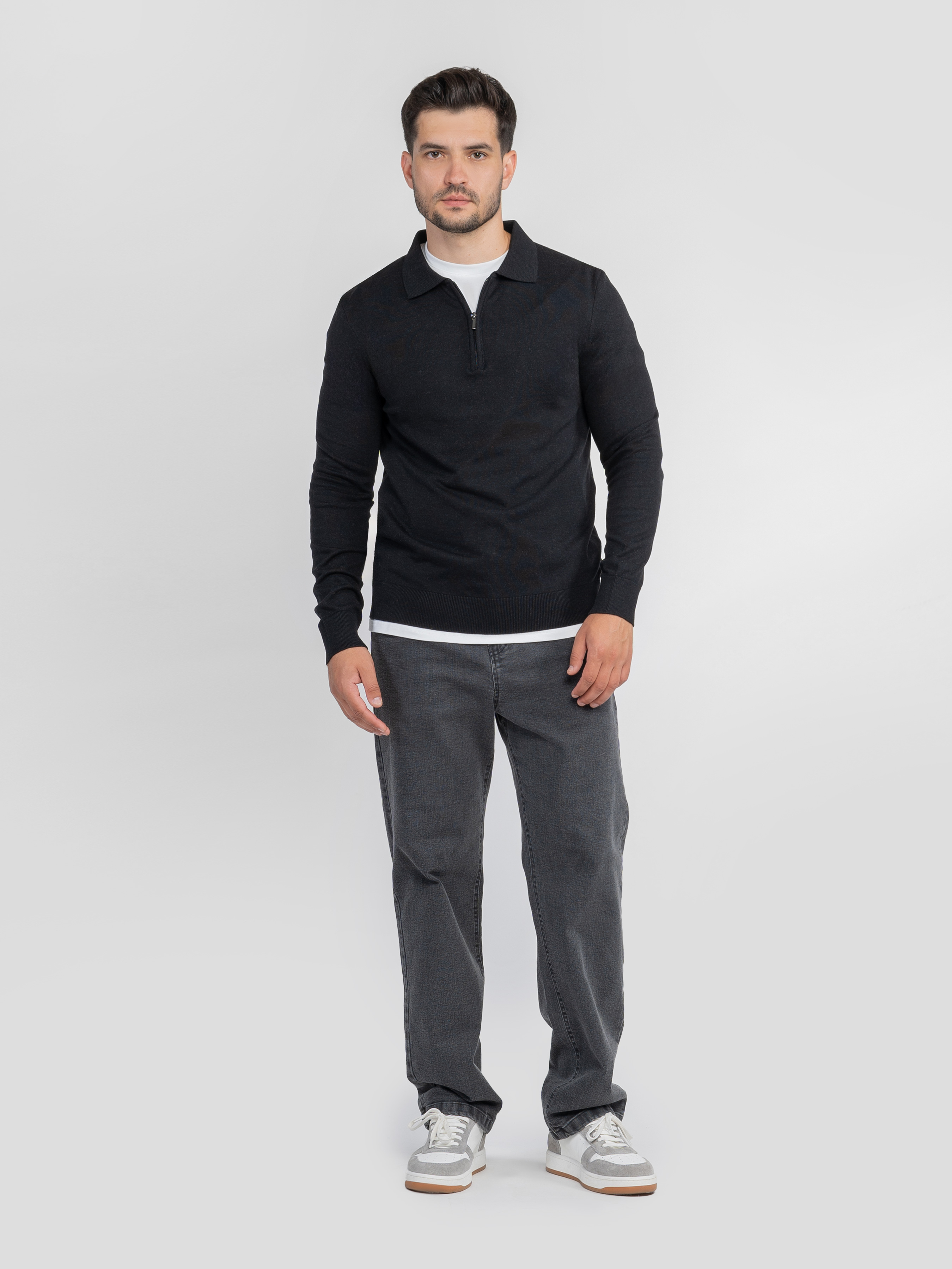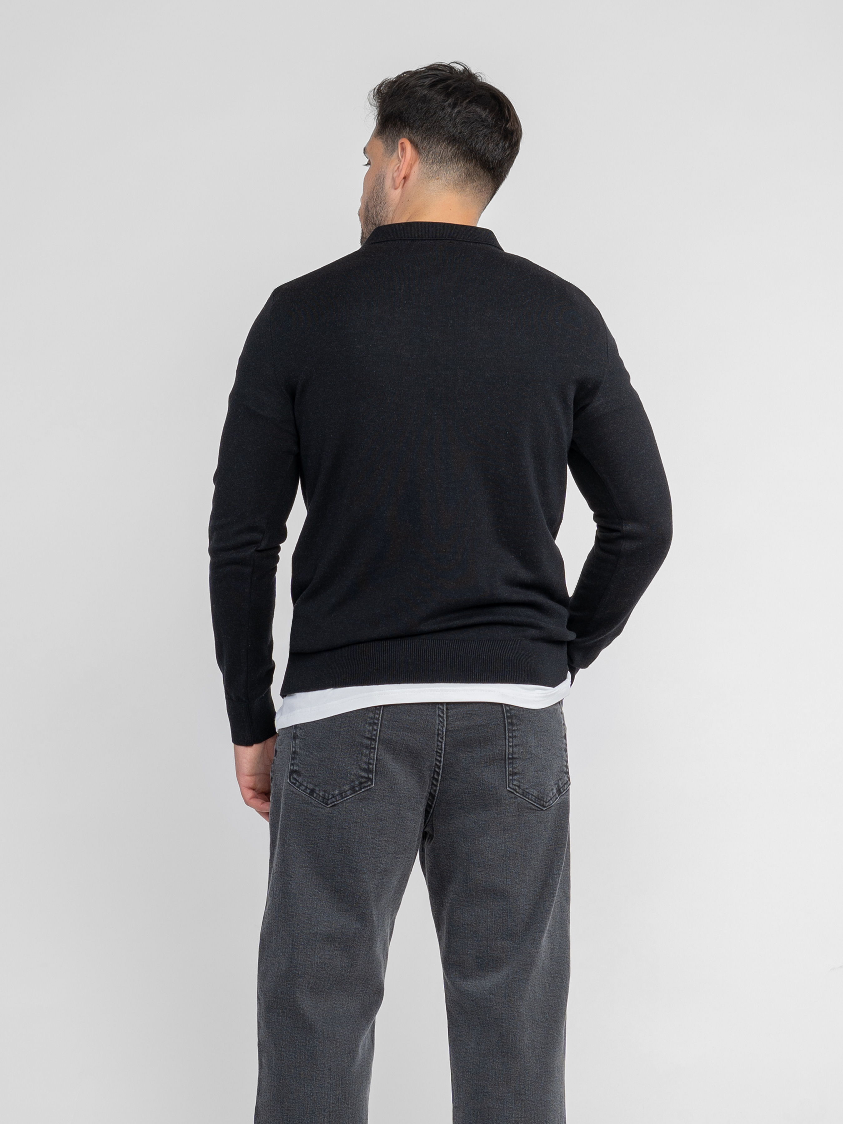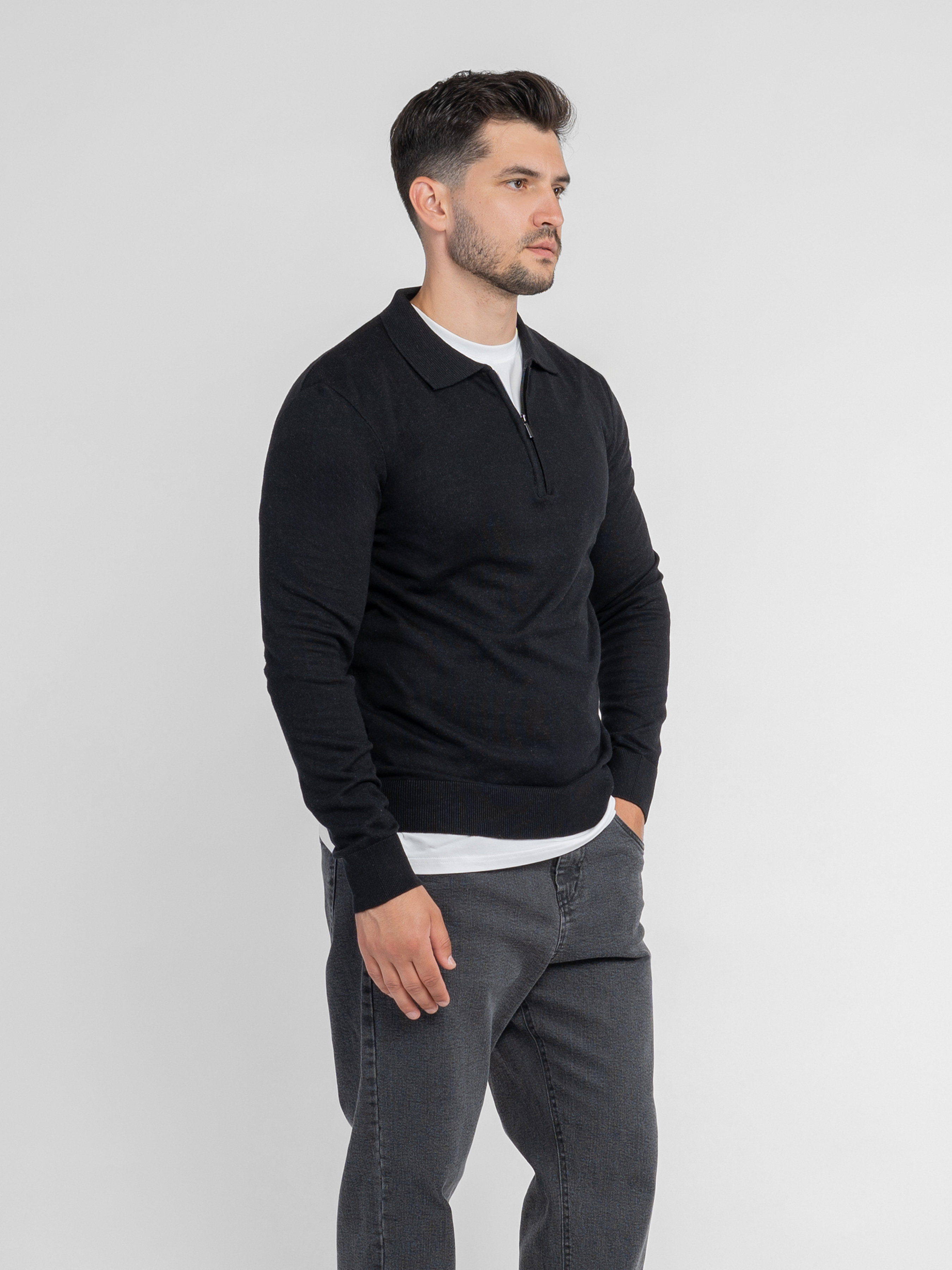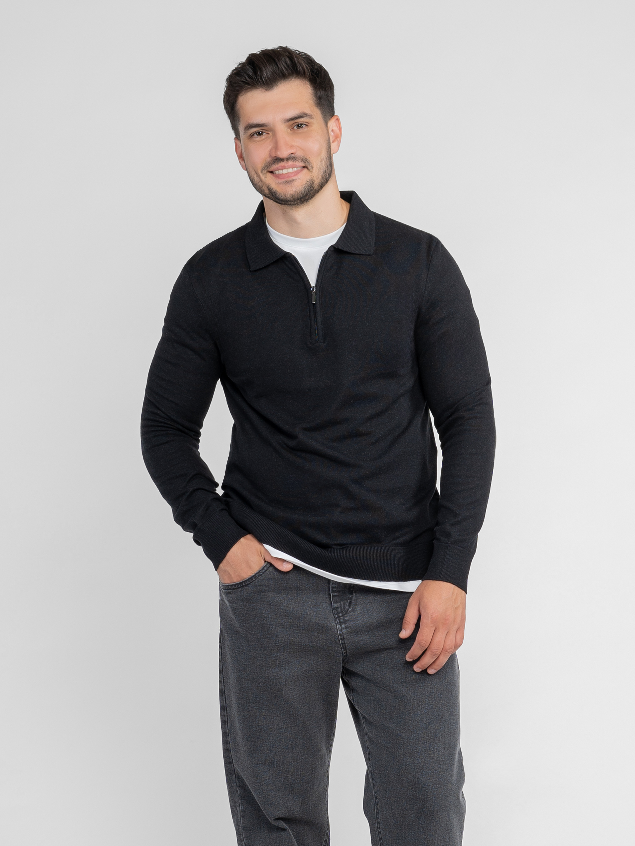 Чоловіче поло Arber чорного кольору з тонкої бавовняної пряжі з додаванням натуральної вовни. М’яка тканина приємна на дотик, забезпечує комфорт і свободу рухів. Модель із довгими рукавами та застібкою на блискавку додає сучасного акценту. Легко поєднується з джинсами або брюками для стильного, лаконічного образу. Модель на фото: розмір 48, зріст 180 см. Параметри: 103/85/97