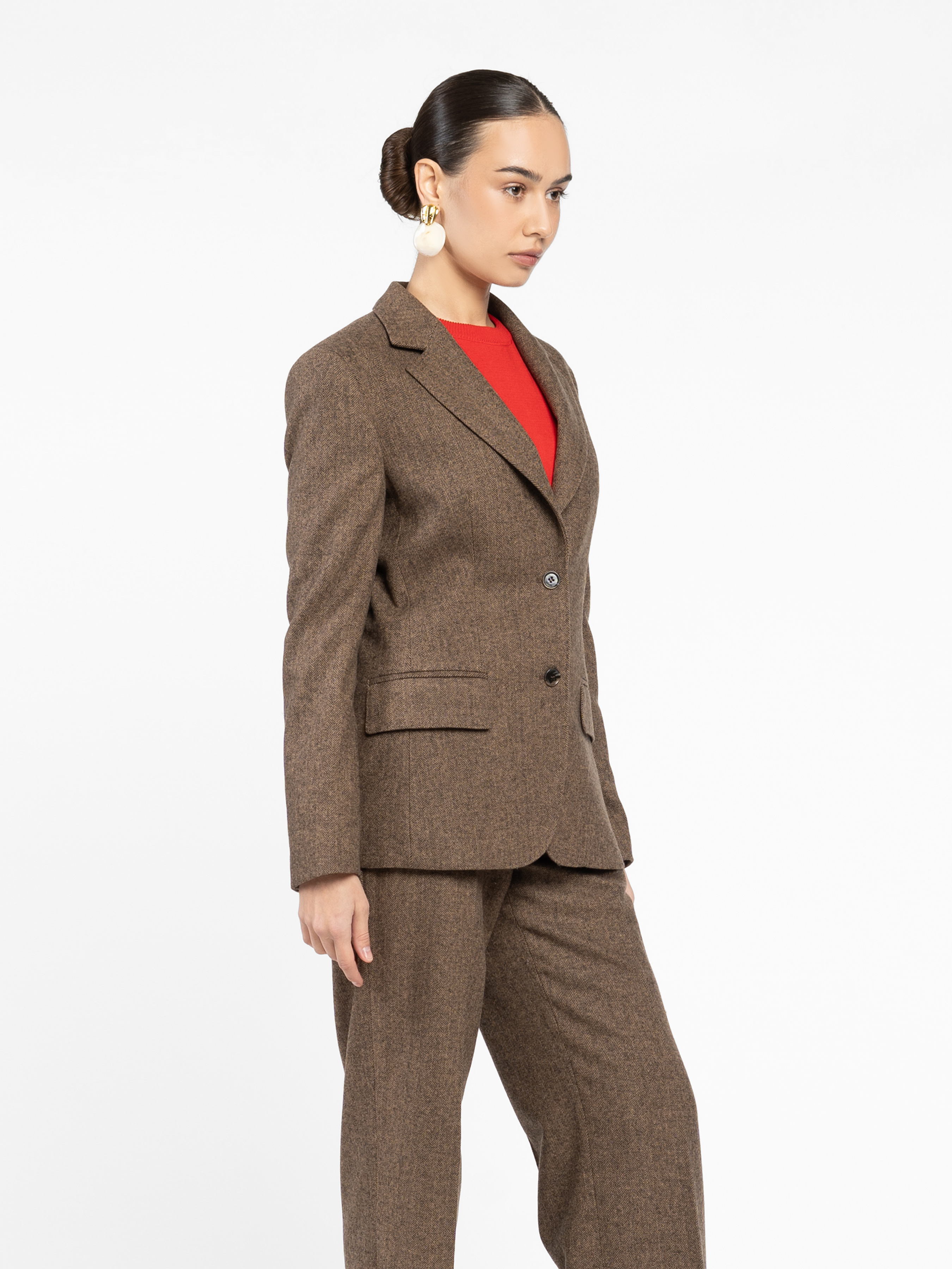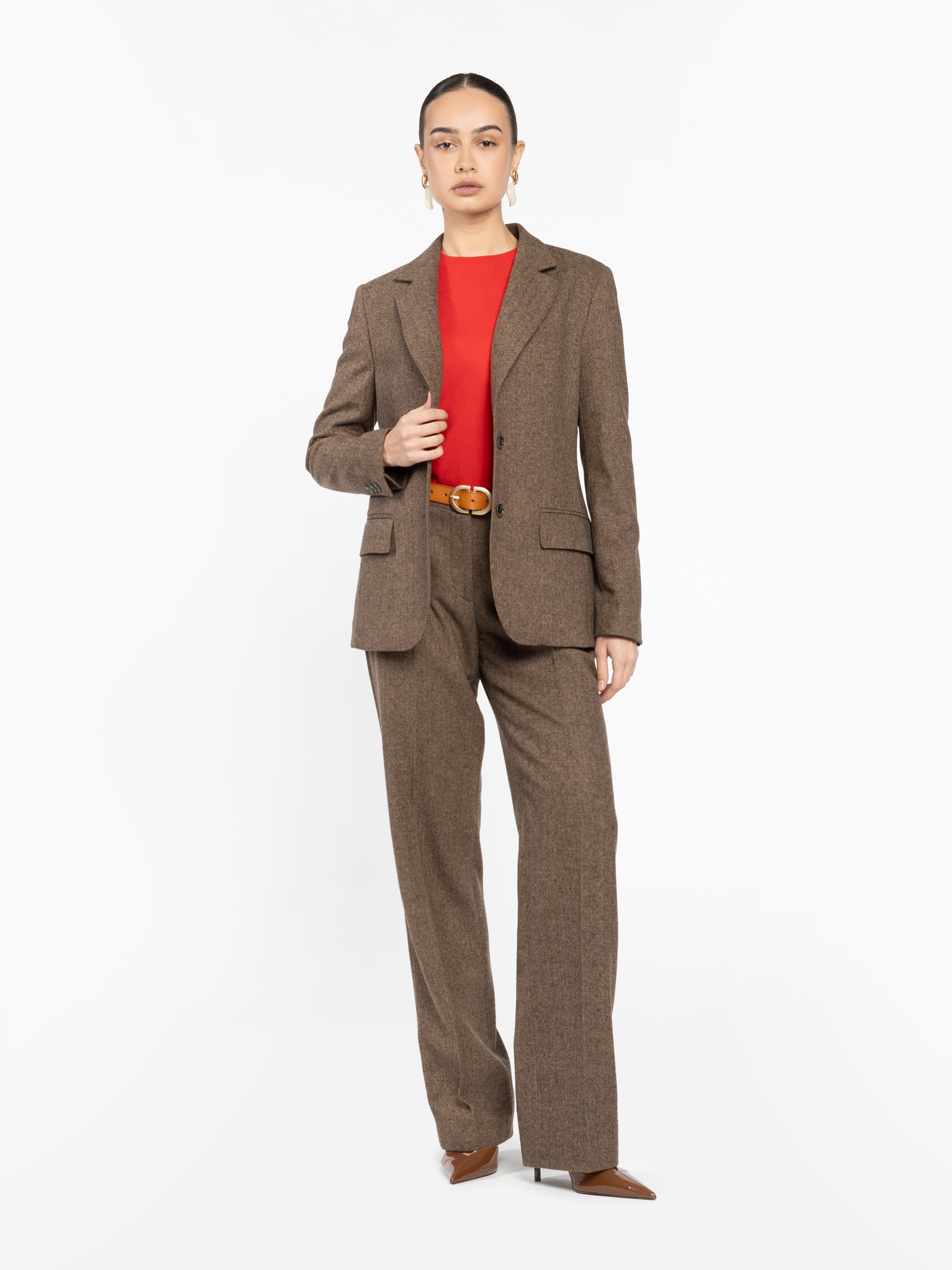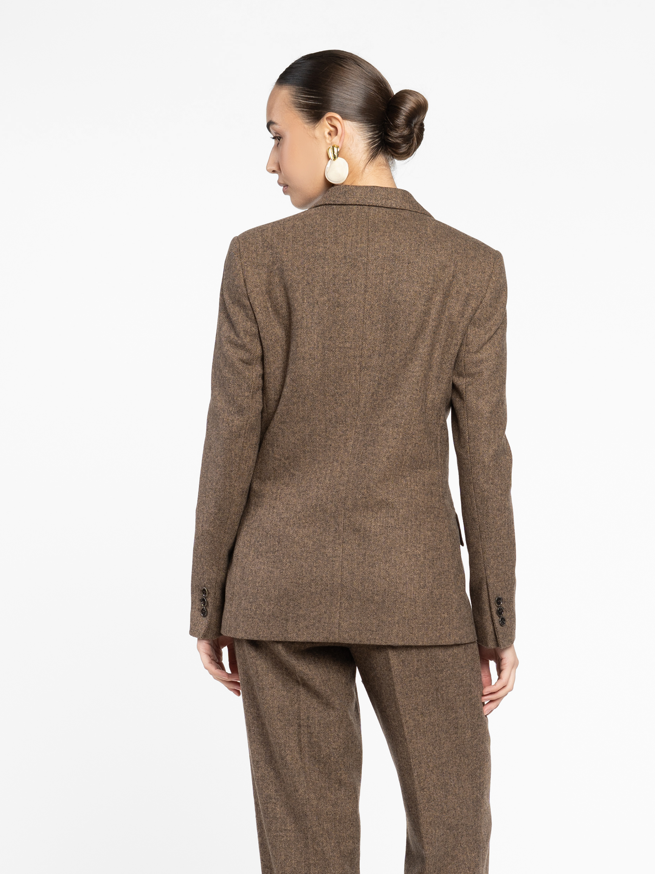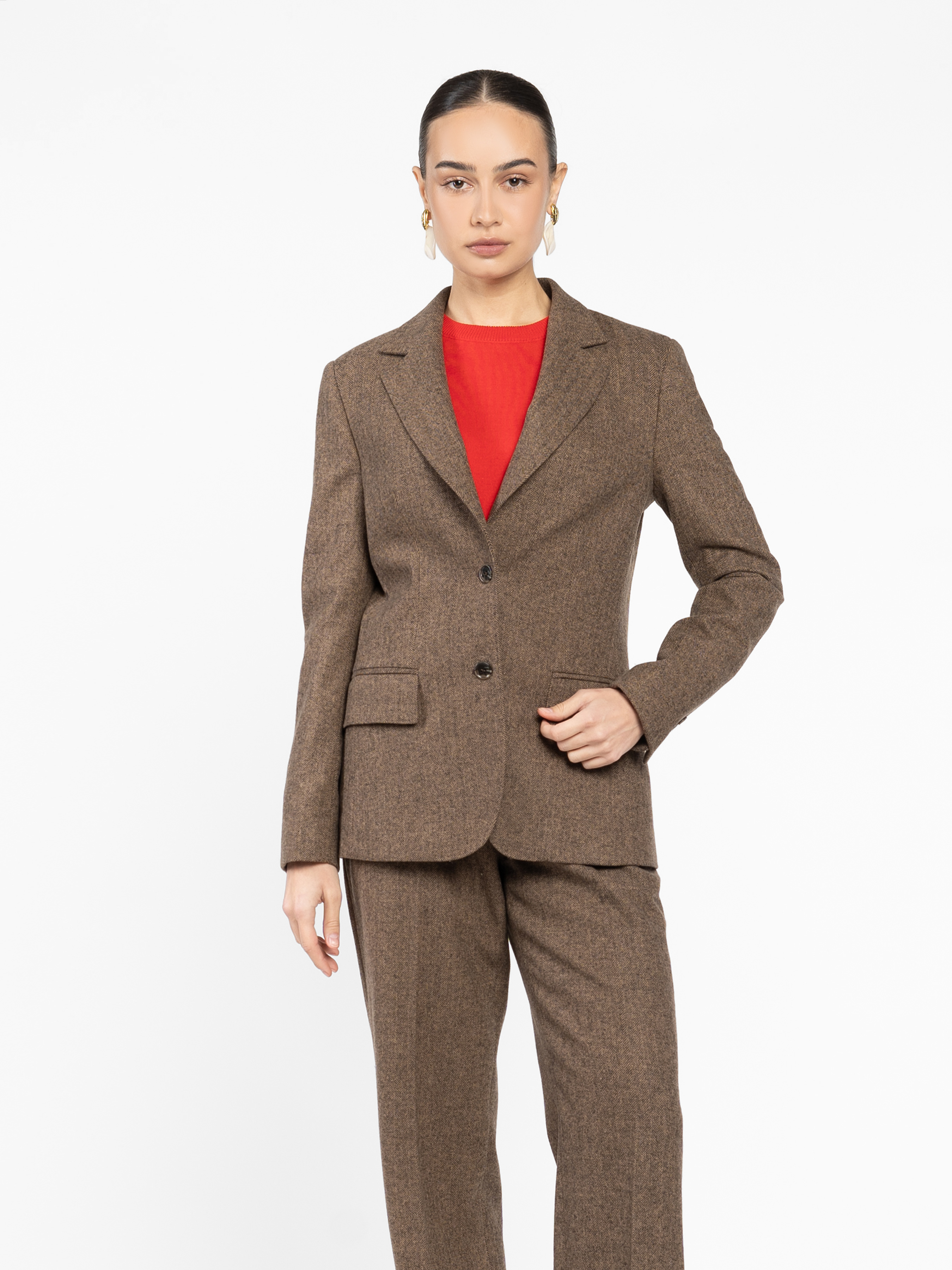 Жіночий жакет Arber коричневого кольору з тонким візерунком “ялинка” — елегантний акцент у сезонному гардеробі. Тканина з додаванням вовни дарує тепло, форму та благородну текстуру. Напівприталений крій формує чіткий силует, підкреслюючи фігуру без надмірної строгості. Однобортна застібка на ґудзики, прямі лацкани й прорізні кишені з клапанами — класичні деталі, що створюють архітектуру образу. Поєднується як із брюками W01.24.39.534 із тієї ж тканини у тон для гармонійного total look, так і зі спідницями. Модель на фото у розмірі 44. Зріст: 168 см. Параметри: 79/60/88