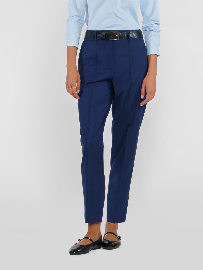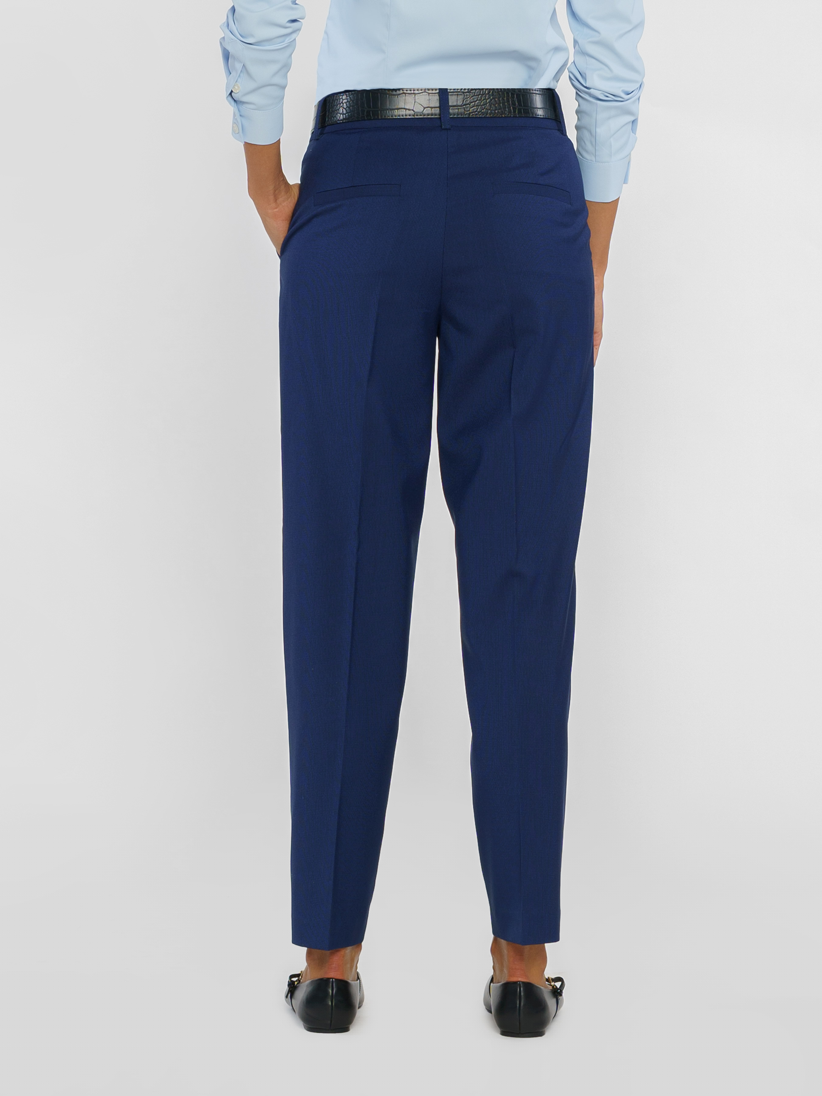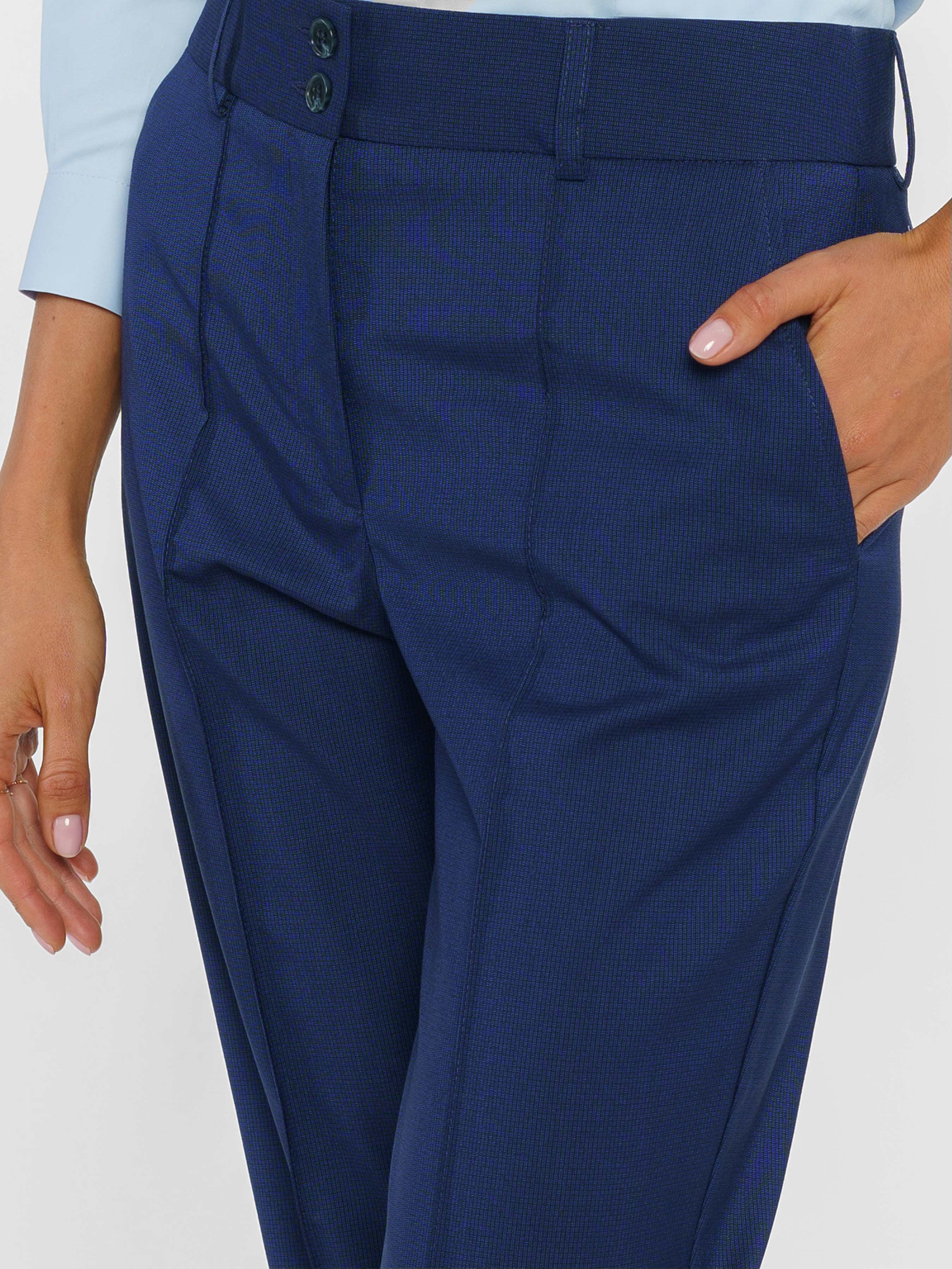 Женские брюки Arber синего цвета из инновационной ткани с добавлением шелковистой вискозы. Модель с высокой посадкой, зауженный крой, два косых боковых кармана и застегиваются на молнию и пуговицу. На передних половинках стрелки закреплены лентой. Модель на фото в размере 42. Рост: 178 см. Параметры: 89/60/90
