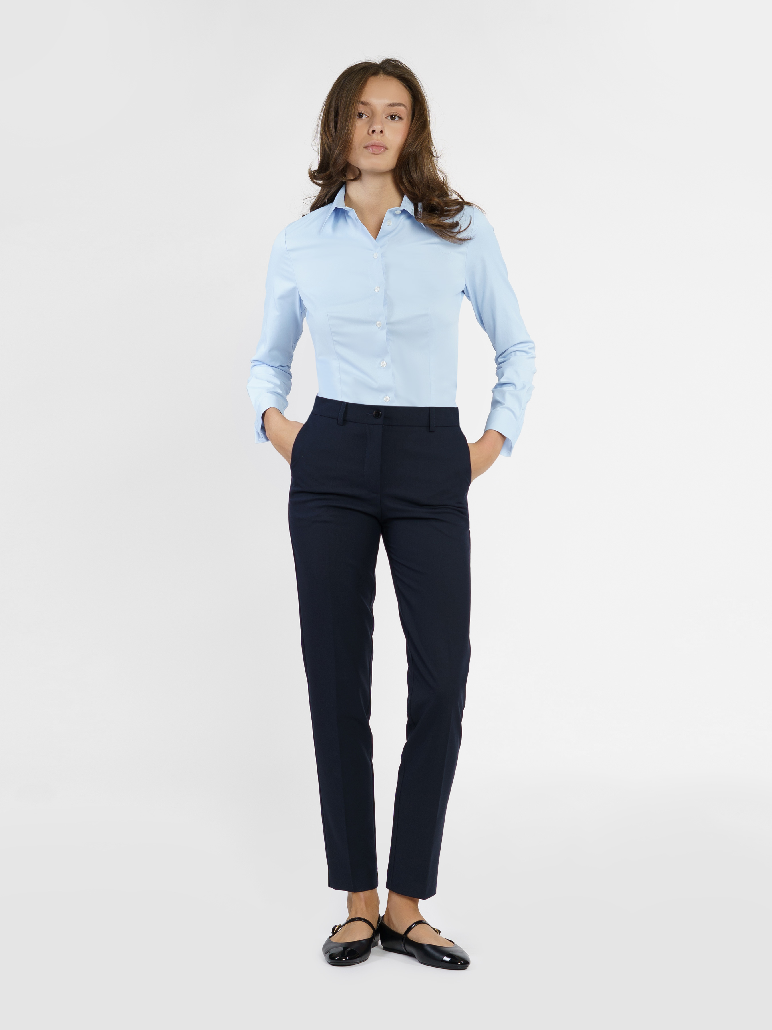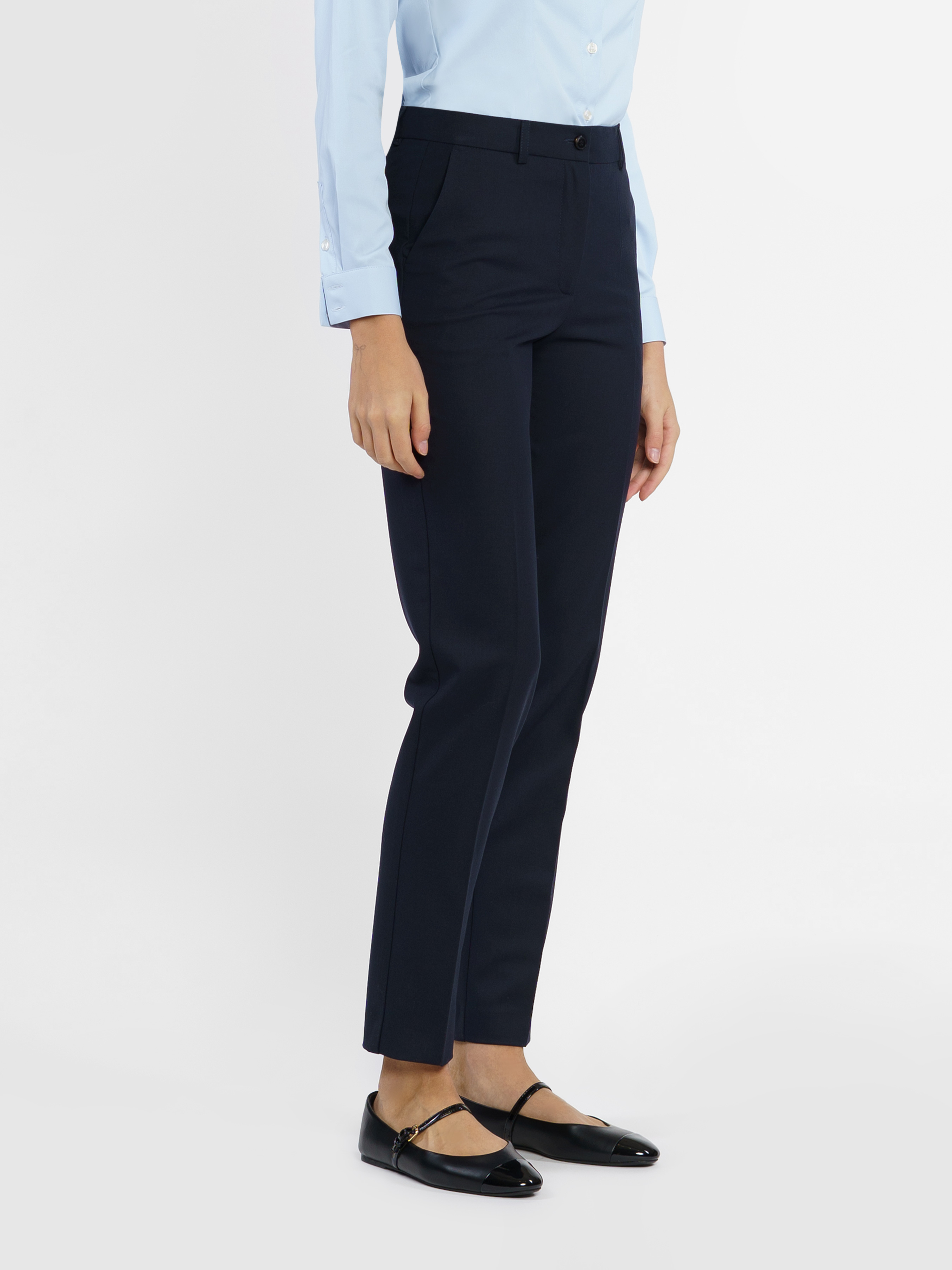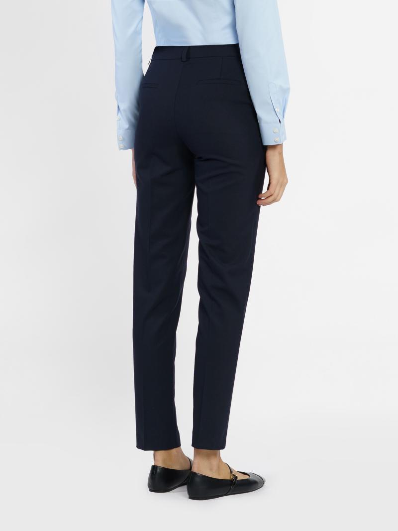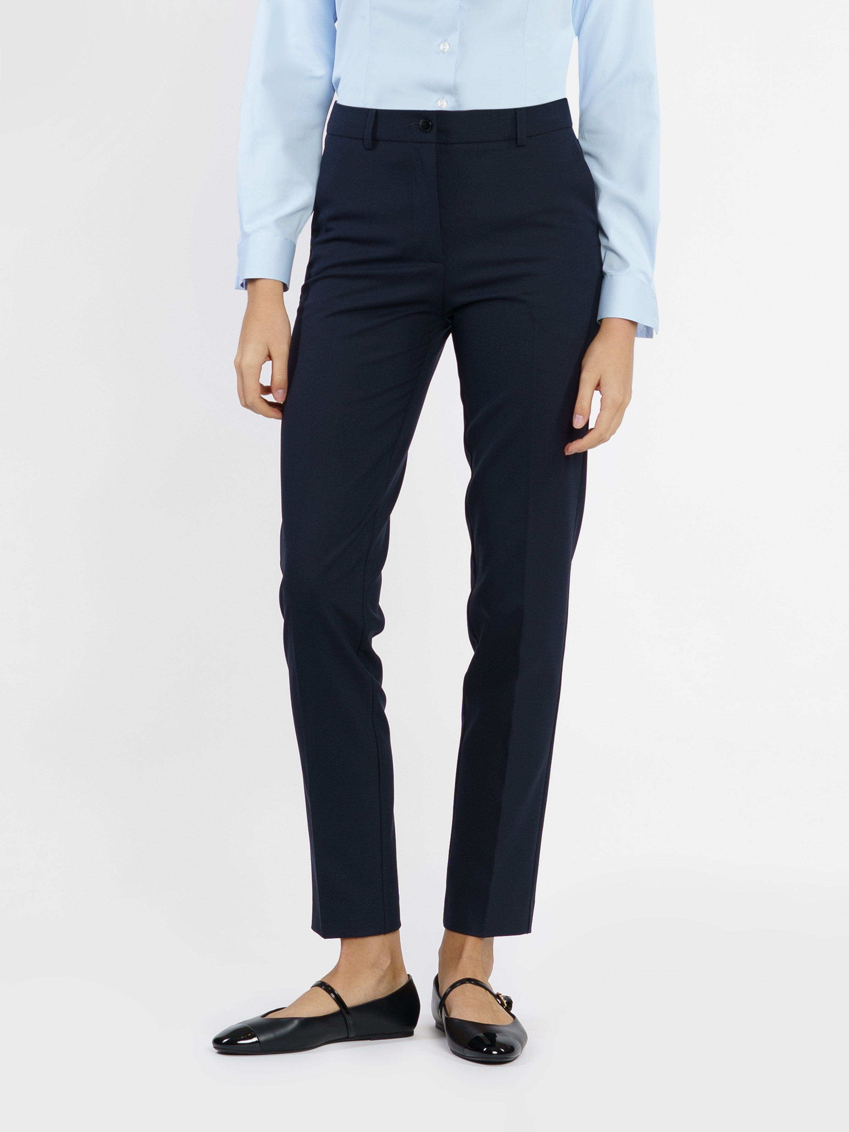 Женские синие брюки Arber из инновационной ткани с добавлением шелковистой вискозы гармонично сочетают удобство и практичность. Они не мнутся и отличаются высокой стойкостью, благодаря чему сохраняют безупречный вид на протяжении всего дня. Брюки имеют среднюю посадку, зауженный крой, два косых боковых кармана и застегиваются на молнию и пуговицу. Идеально подходят для комплектов с жакетами разных цветов, рубашками и трикотажем. Модель на фото в размере 42. Рост: 178 см. Параметры: 90/78/94