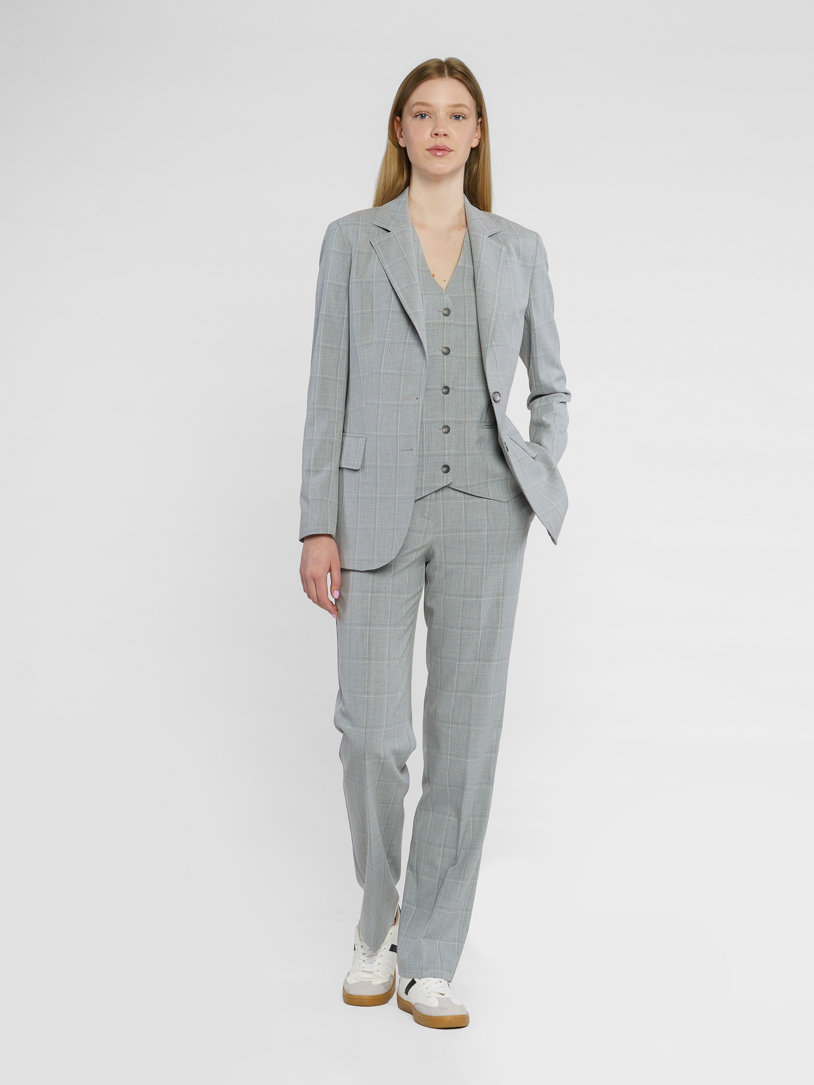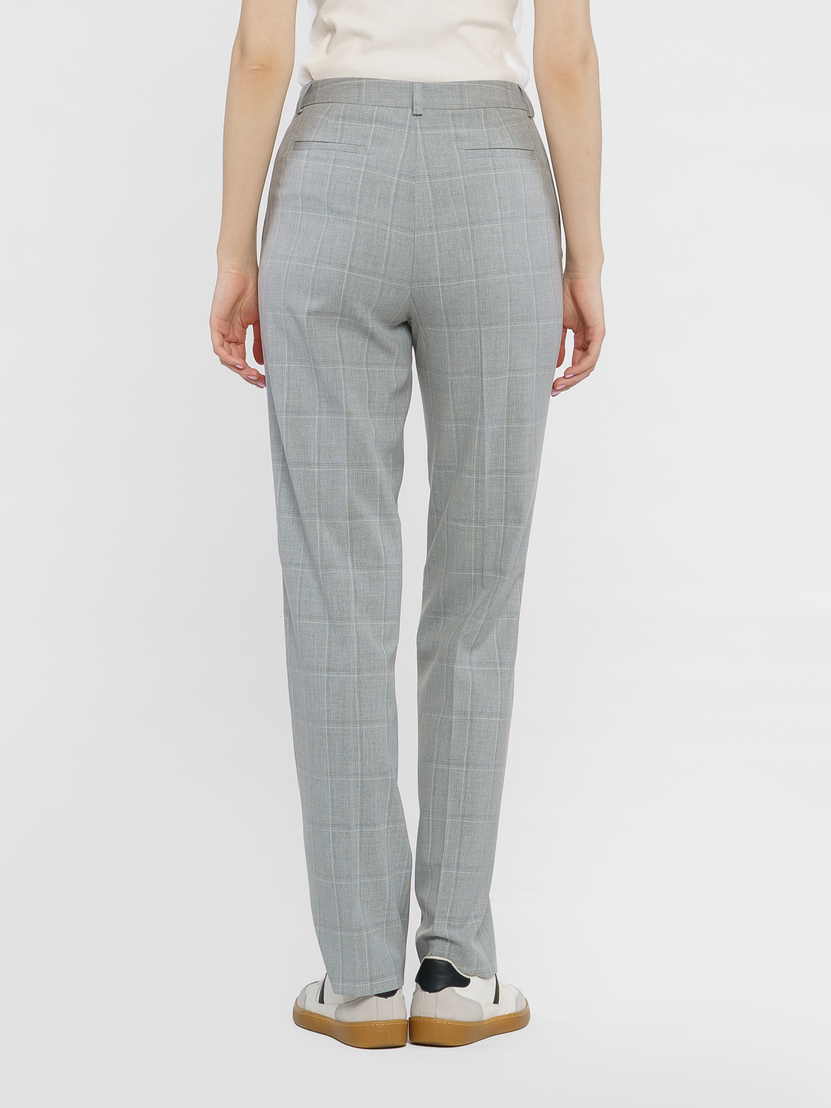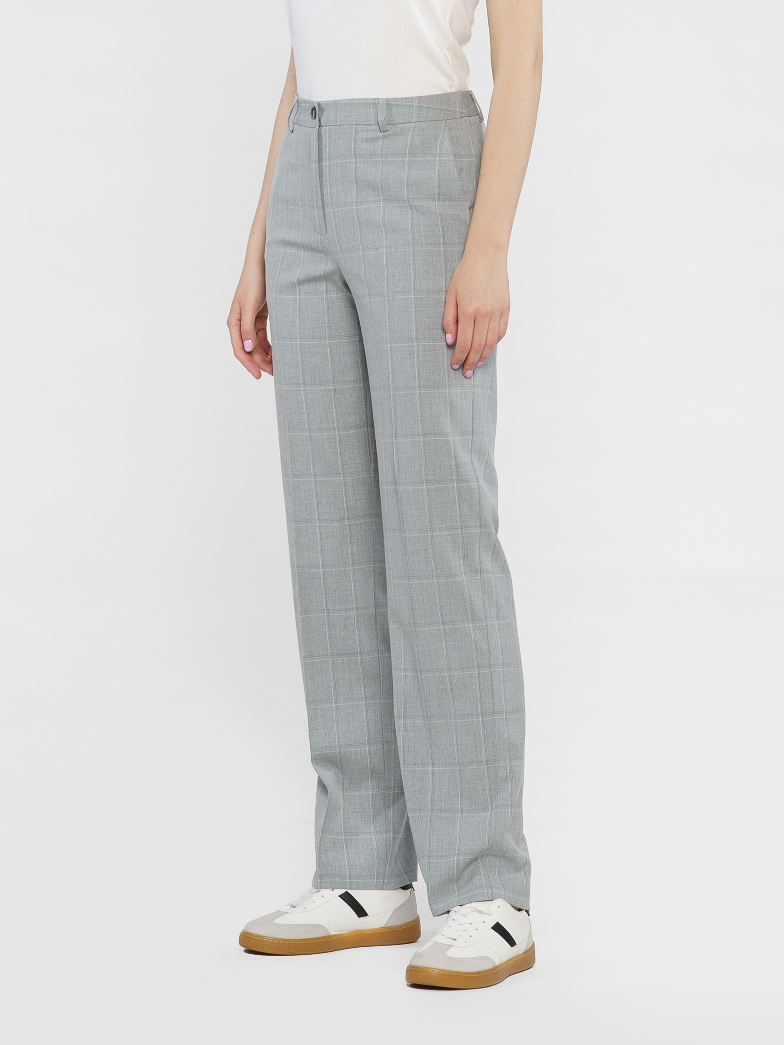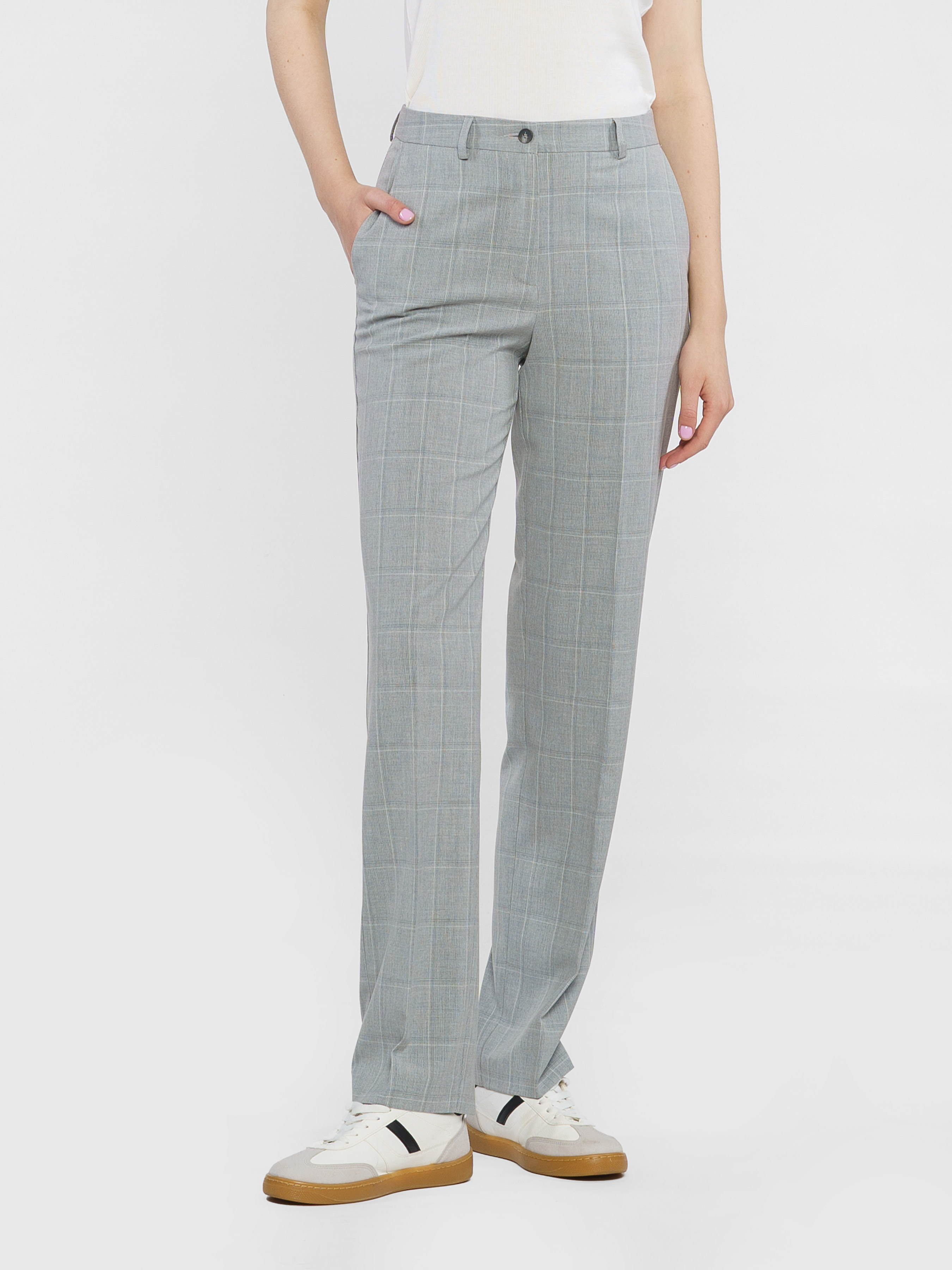 Женские брюки Arber серого цвета в клетку из инновационной ткани с добавлением шелковистой вискозы. Имеют среднюю посадку, зауженный крой, два кармана и застегиваются на пуговицу и молнию. Идеально подходят для комплектов с жакетами разных цветов, рубашками и трикотажем. Модель в размере 42. Рост: 177 см. Параметры: 86/59/90