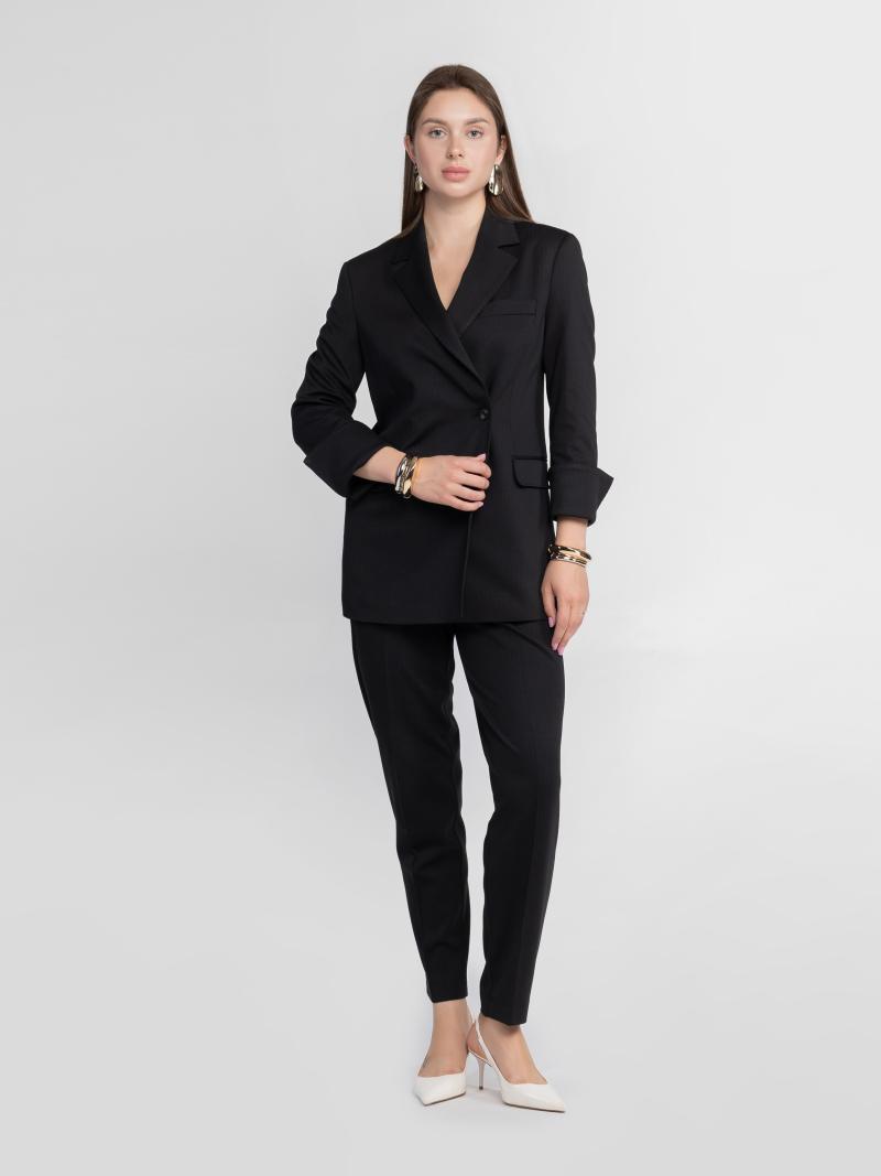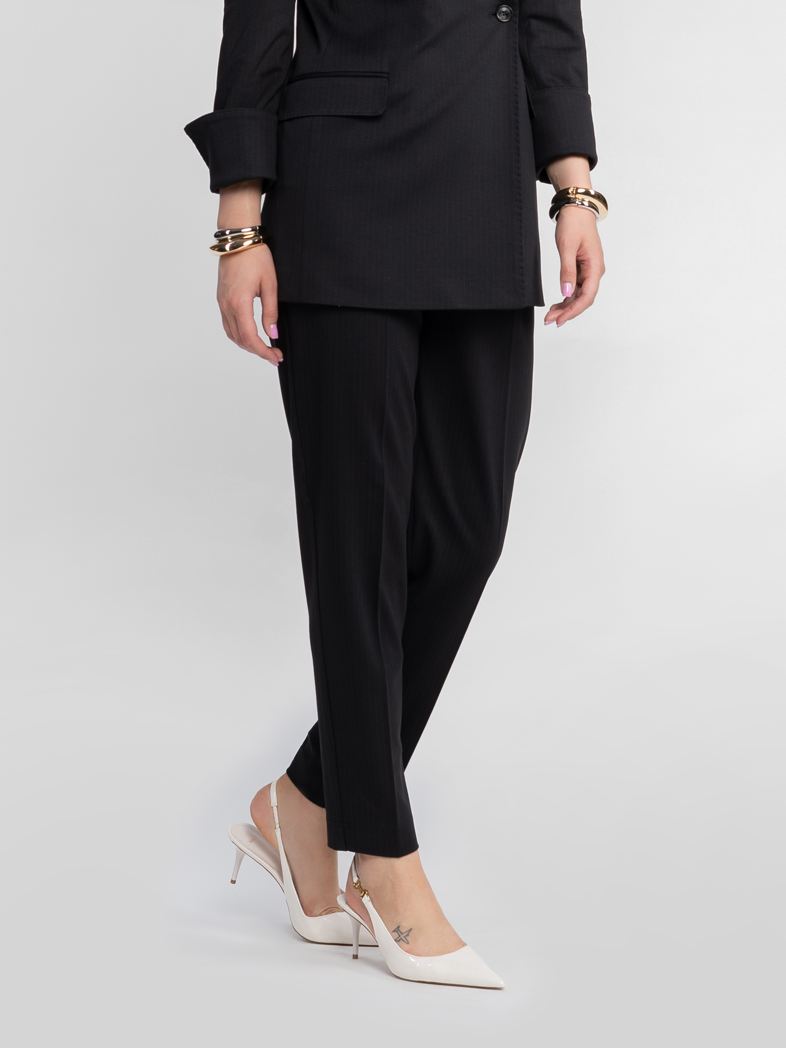 Женские брюки Arber черного цвета в тонкую полоску, созданы из мягкой эластичной ткани с добавлением вискозы. Материал приятный на ощупь, хорошо тянется, держит форму и идеально сидит по фигуре. Высокая посадка, зауженный крой, пояс на резинке и два наклонных боковых кармана обеспечивают комфорт в течение дня. Идеально сочетаются с жакетом W02.09.03.535 из той же ткани. Модель на фото в размере 42. Рост: 168 см. Параметры: 86/65/96