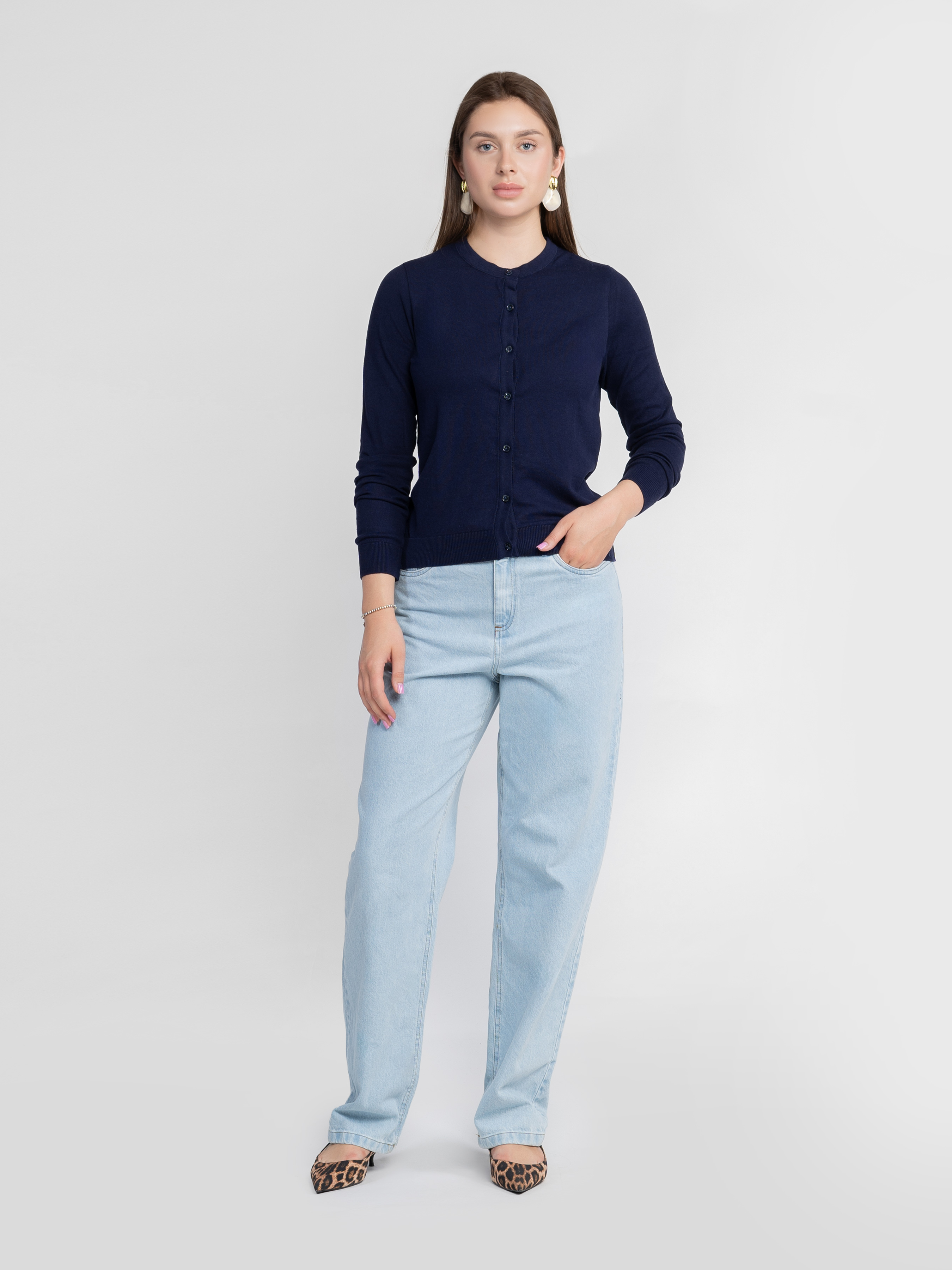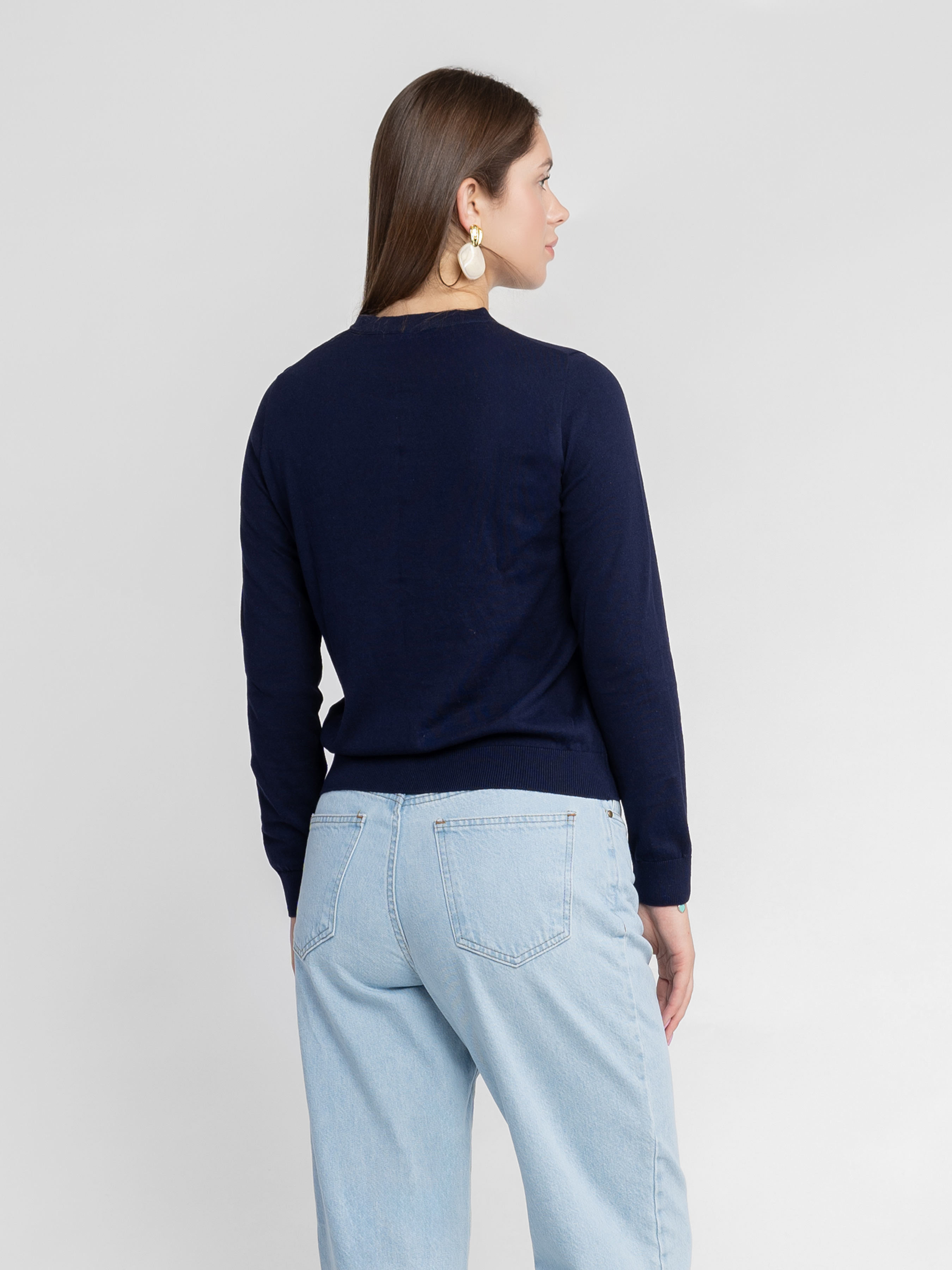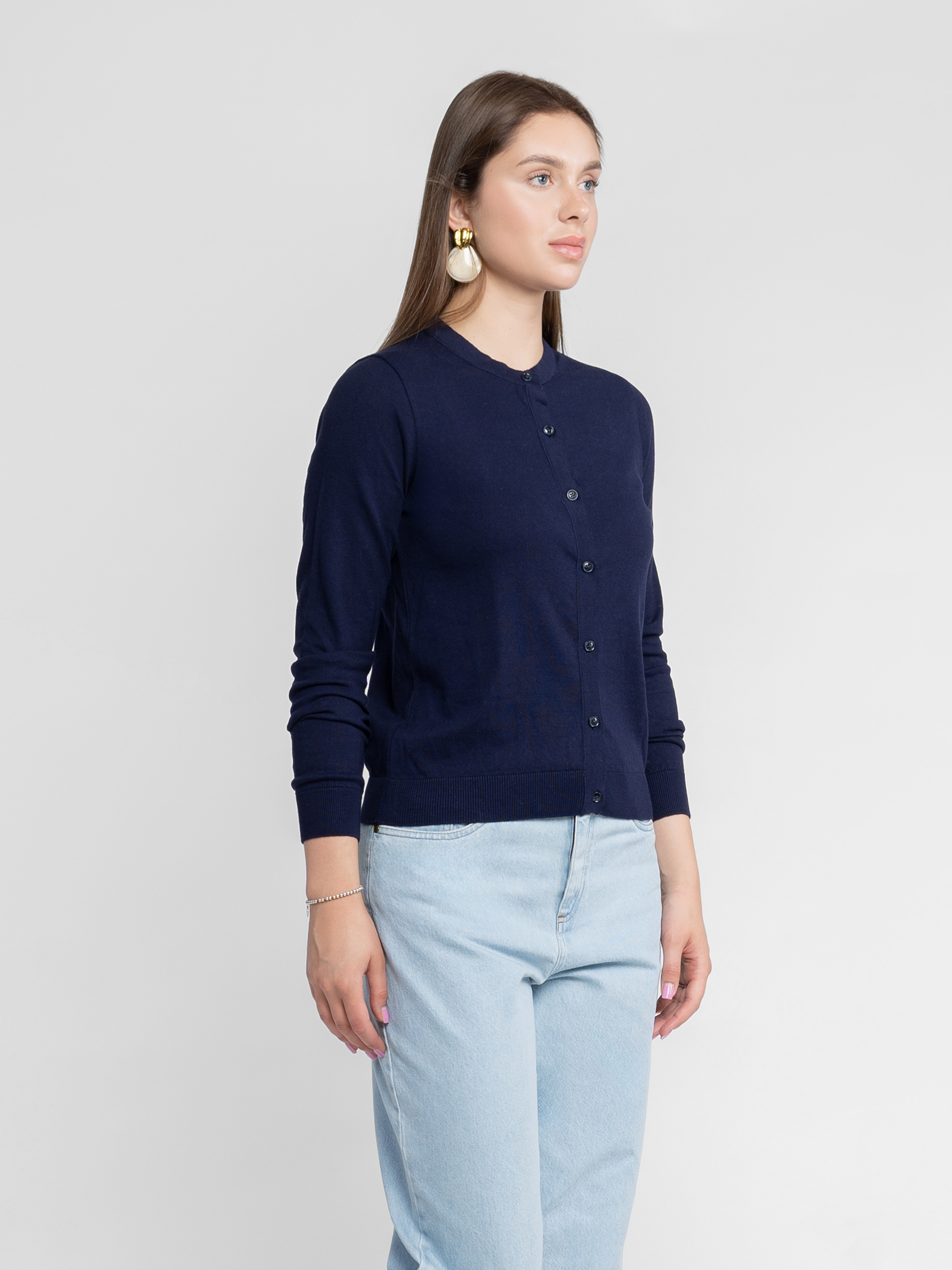 Женский базовый кардиган Arber темно-синего цвета.Мягкий хлопковый трикотаж не сковывает движений и дарит комфорт в течение дня. Прямой крой и гладкая поверхность создают современный силуэт, а застежка на пуговицах добавляет элегантный акцент. Идеален для джинсов, брюк и casual-образов. Модель на фото в размере XS Рост: 176 см. Параметры: 86/64/96