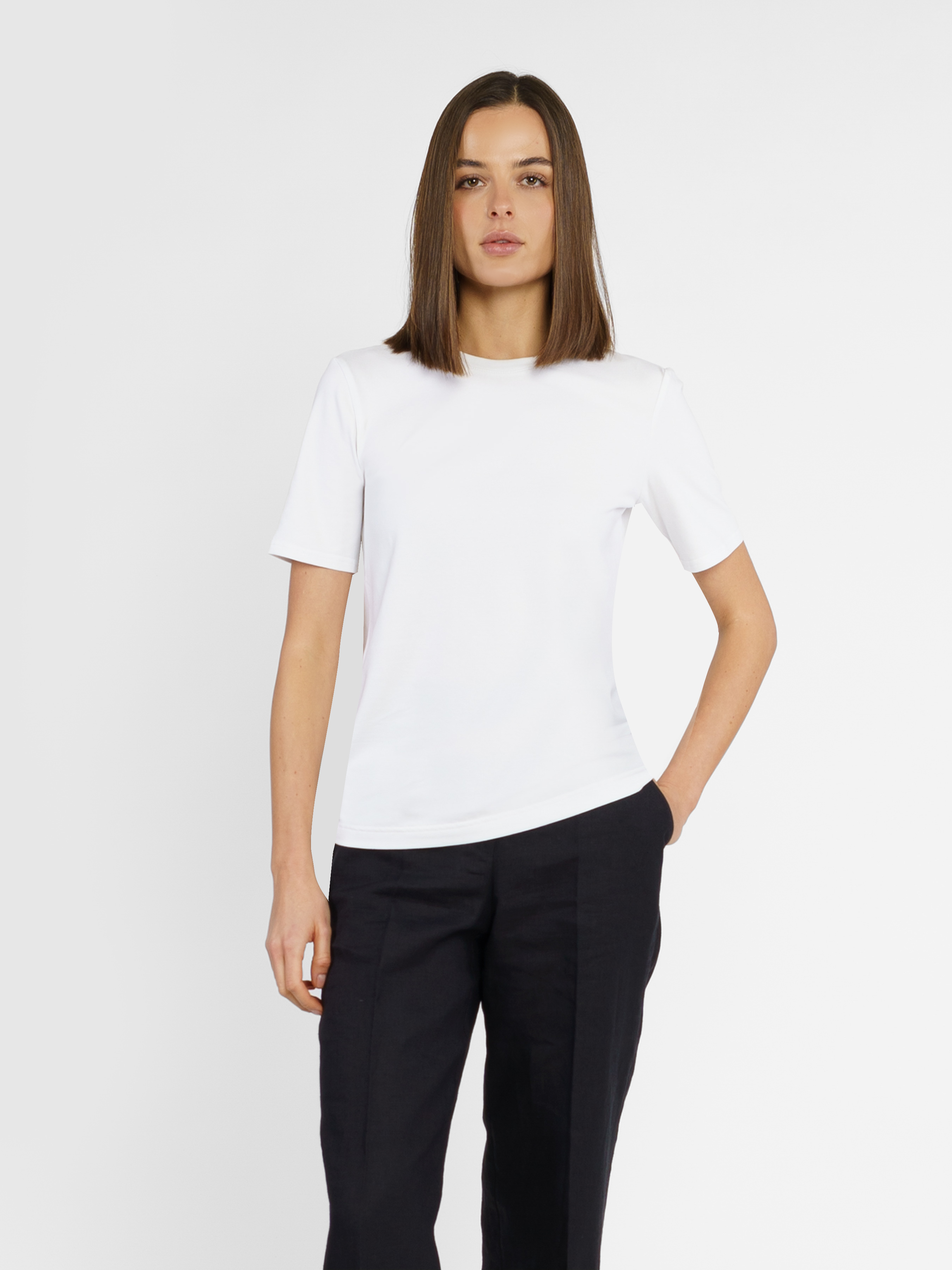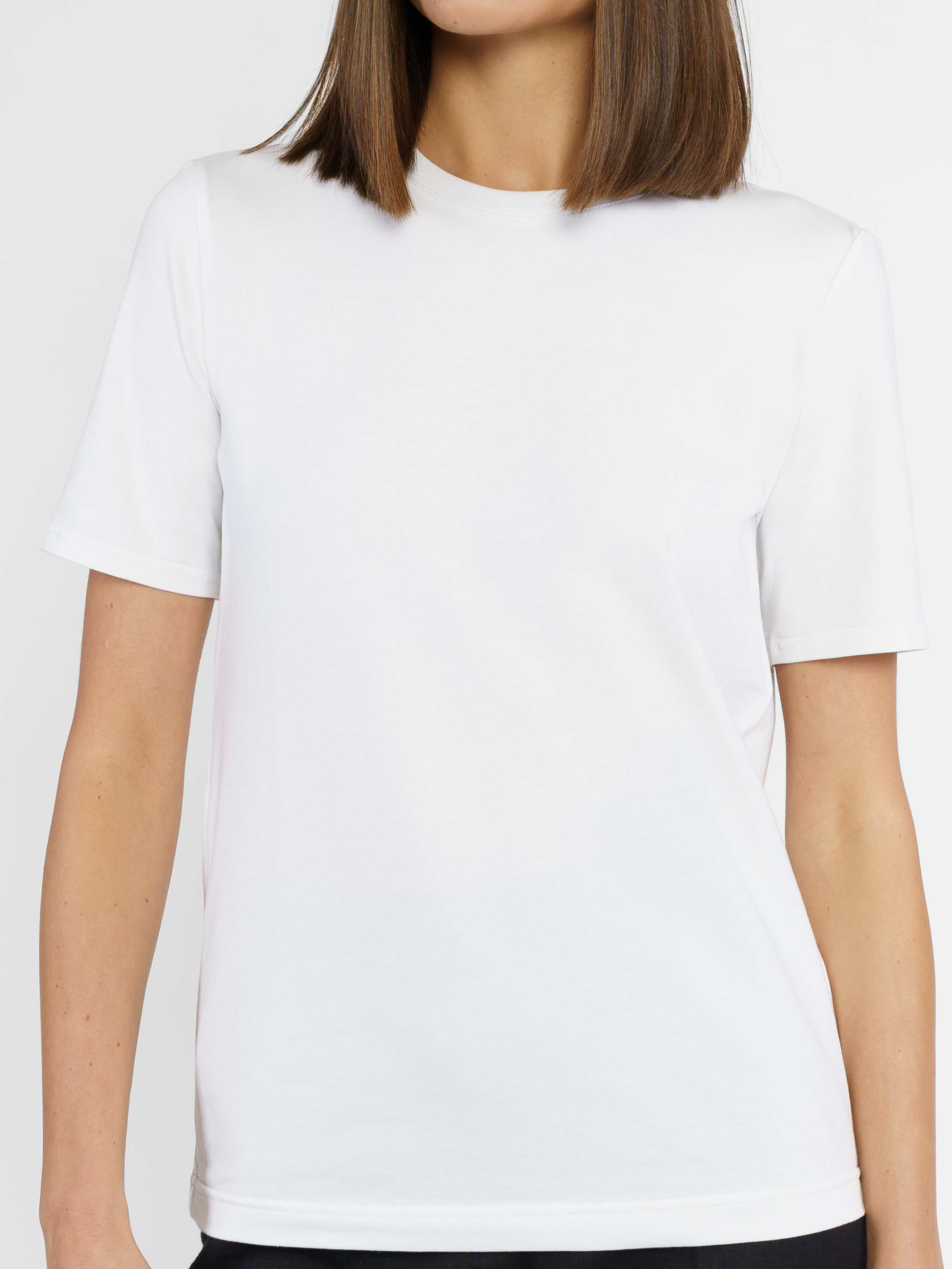 Белая женская футболка Arber, прямого силуэта. Изготовлена из тонкого хлопкового джерси с добавлением эластана, что обеспечивает максимальный комфорт и отличную посадку. Базовая футболка - незаменимая в женском гардеробе в стиле casual. Модель на фото в размере 42. Рост: 178 см. Параметры: 89/60/90