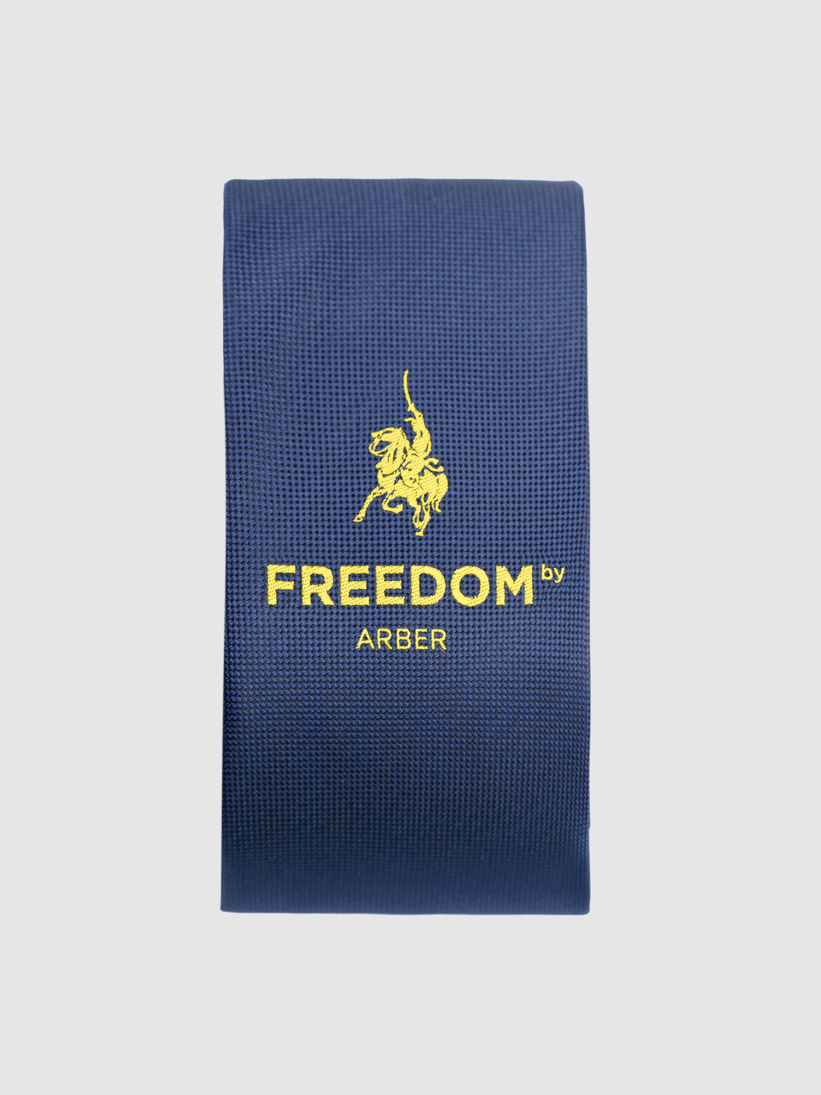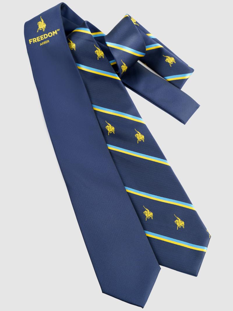 Патриотический галстук Arber темно-синего цвета, изготовлен из шелковистой на ощупь ткани и сшит вручную. Декорирован изображением логотипа Freedom – казак на коне, как символ борьбы за свободу и независимость Украины.