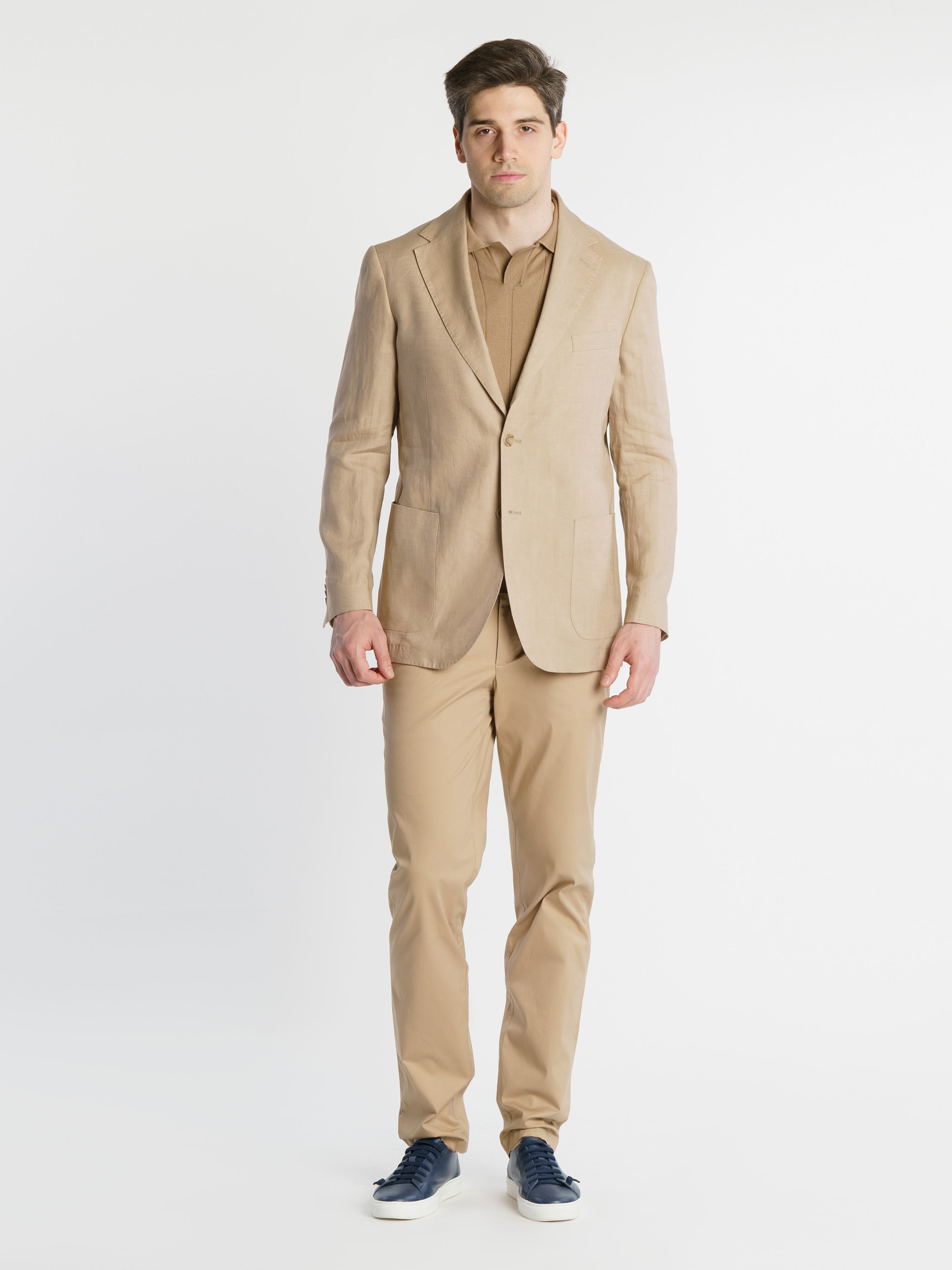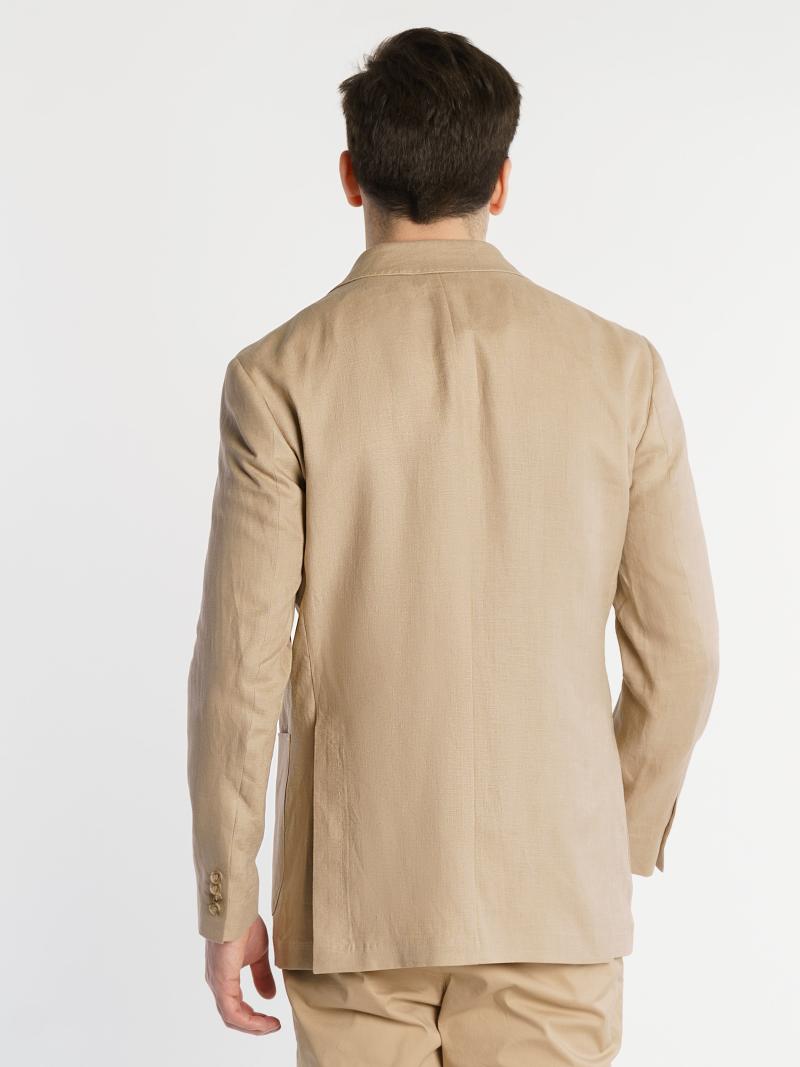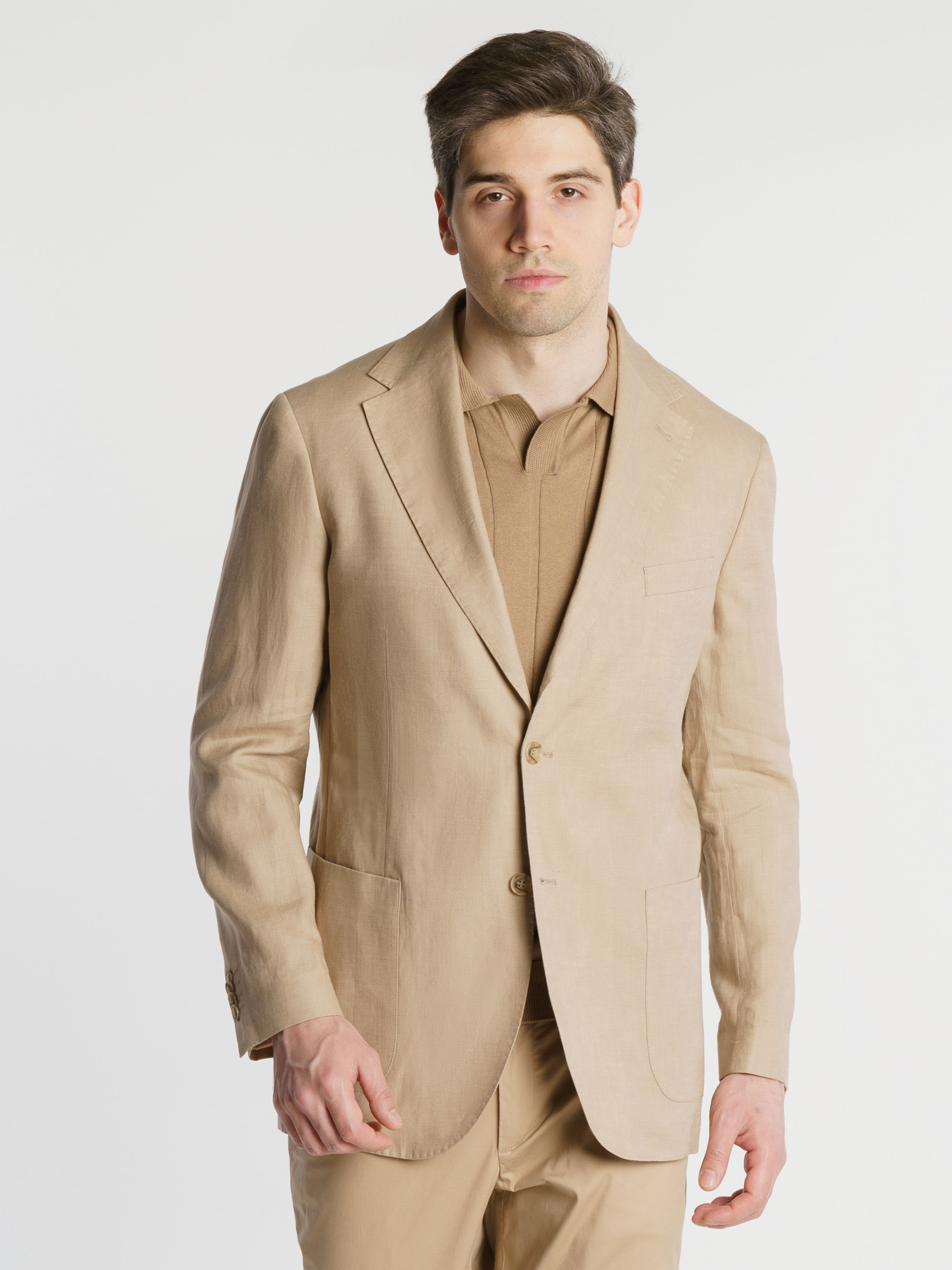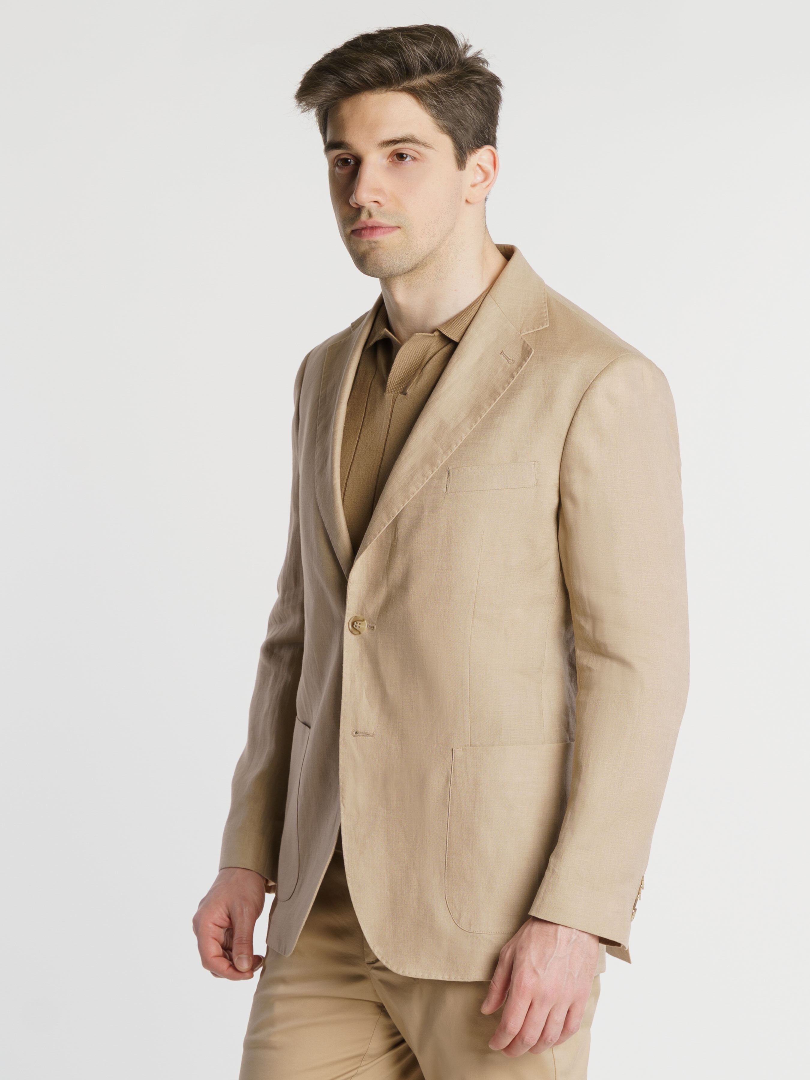 Льняной мужской пиджак Arber бежевого цвета. Созданный из натуральной ткани на основе волокон льна, укороченная подкладка делает его максимально подходящим для теплых солнечных дней. Модель с безупречными пропорциями имеет полуприлегающий силуэт, накладные карманы, прямой лацкан и две шлицы. Пиджак прекрасно сочетается с льняными брюками или хлопком, дополнить образ можно тонким трикотажем, рубашкой casual и неформальной обувью.
