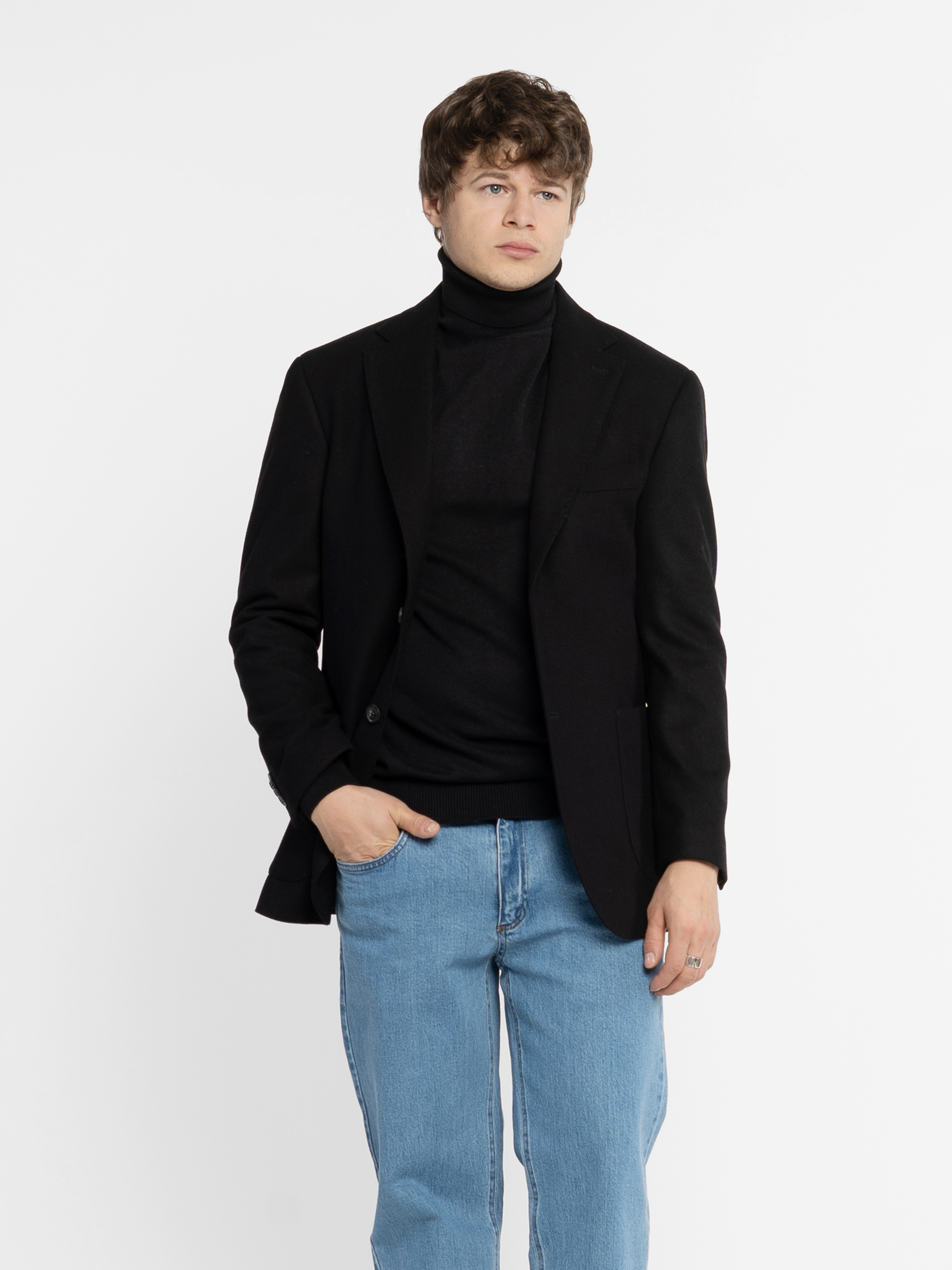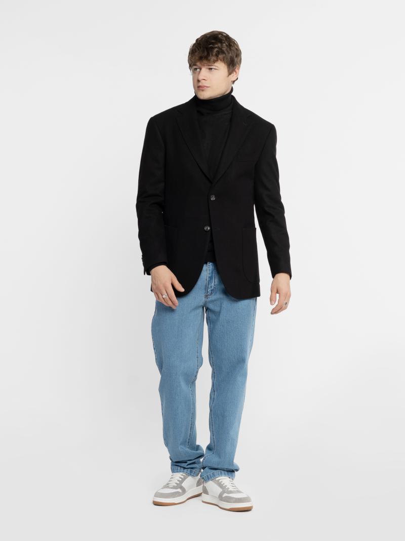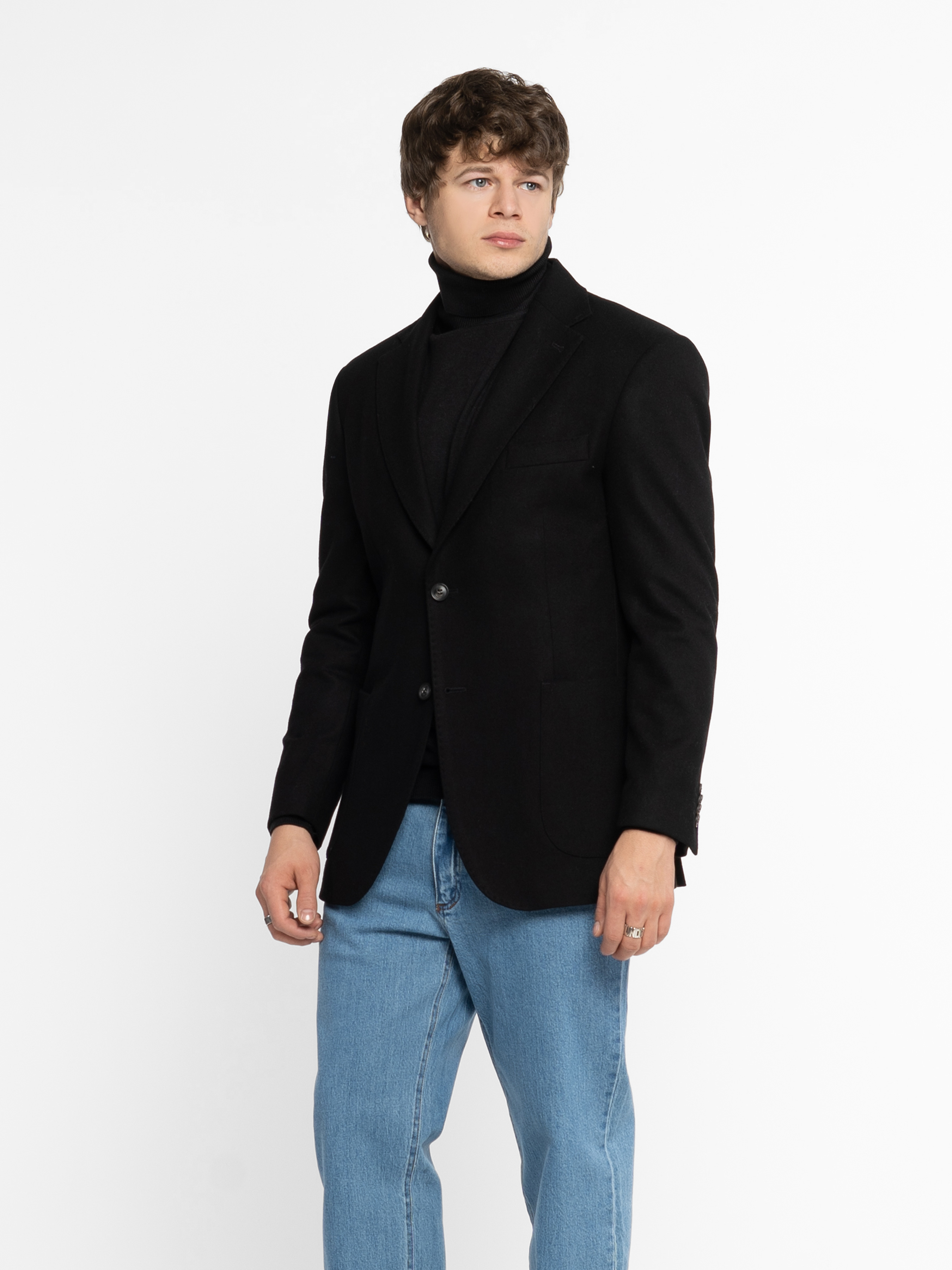 Мужской пиджак Arber черного цвета из тонкой шерстяной ткани с добавками. Классический крой с застежкой на 2 пуговицы, прямые лацканы и два накладных кармана формируют чистый современный силуэт. Модель универсальна — легко комбинируется с джинсами или брюками, подходит для smart-casual и повседневных образов, добавляя стиль и комфорт в прохладное время года. Модель на фото: размер 48, рост 188 см, параметры 97/78/96.