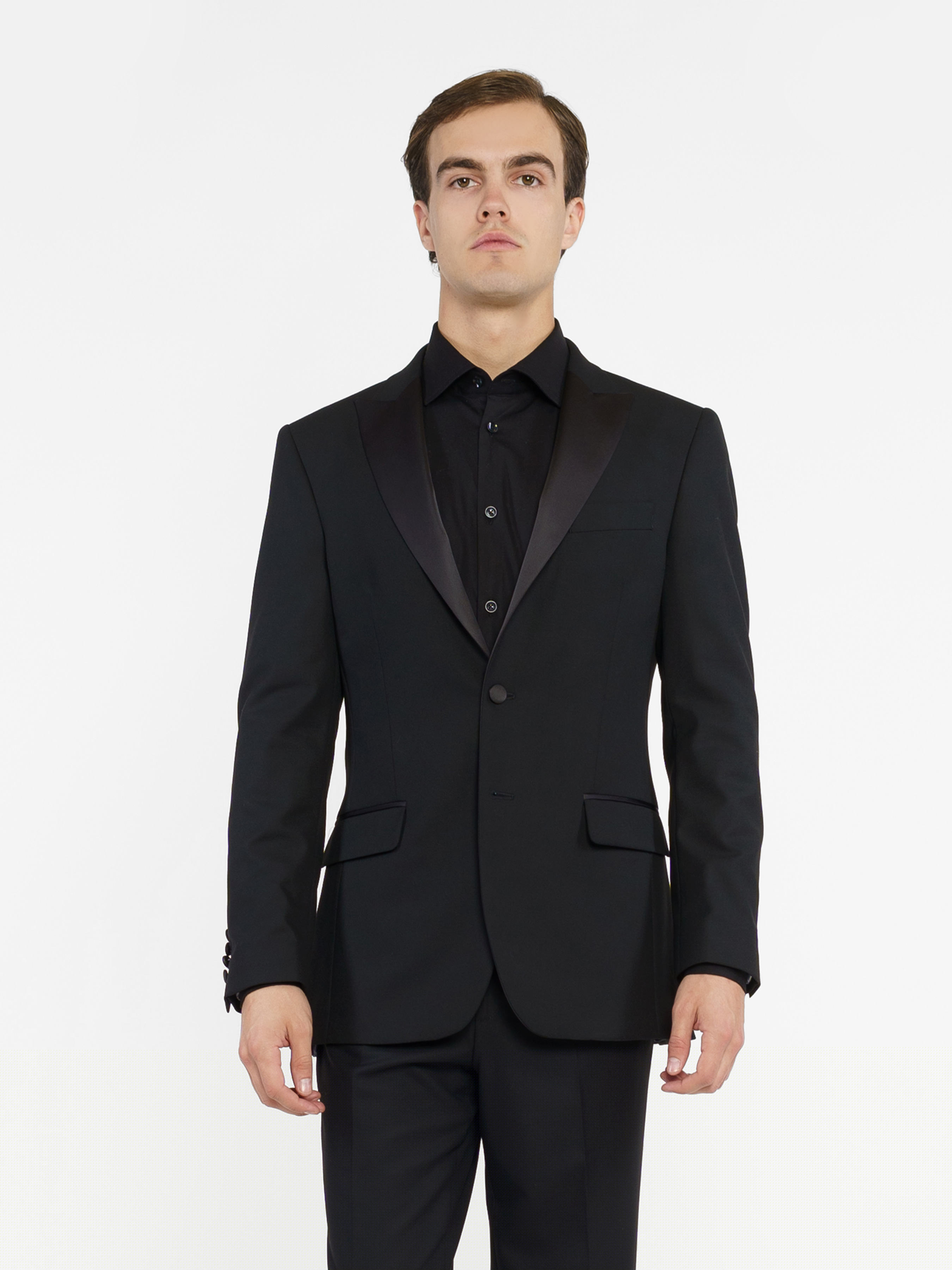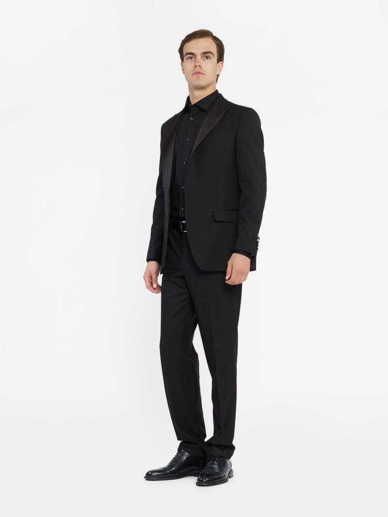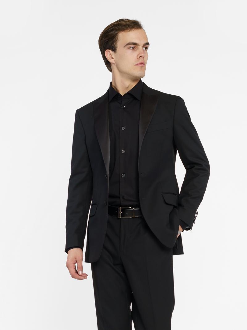 Изысканный вечерний мужской пиджак - смокинг, от Arber. Модель пиджака имеет приталенный крой с острыми лацканами из атласа, однобортный на 2 пуговицы, с двумя карманами с клапаном и двумя высокими шлицами, что обеспечивает свободу движения. Пиджак изготовлен из инновационной ткани на основе вискозы, ткань практичная, не мнется. Пиджак прекрасно сочетается с брюками MB01.02.02.02.00 и белой рубашкой, создавая безупречный образ для официальных мероприятий и торжественных событий. Модель на фото в размере 48. Рост: 185 см. Параметры: 92/71/89