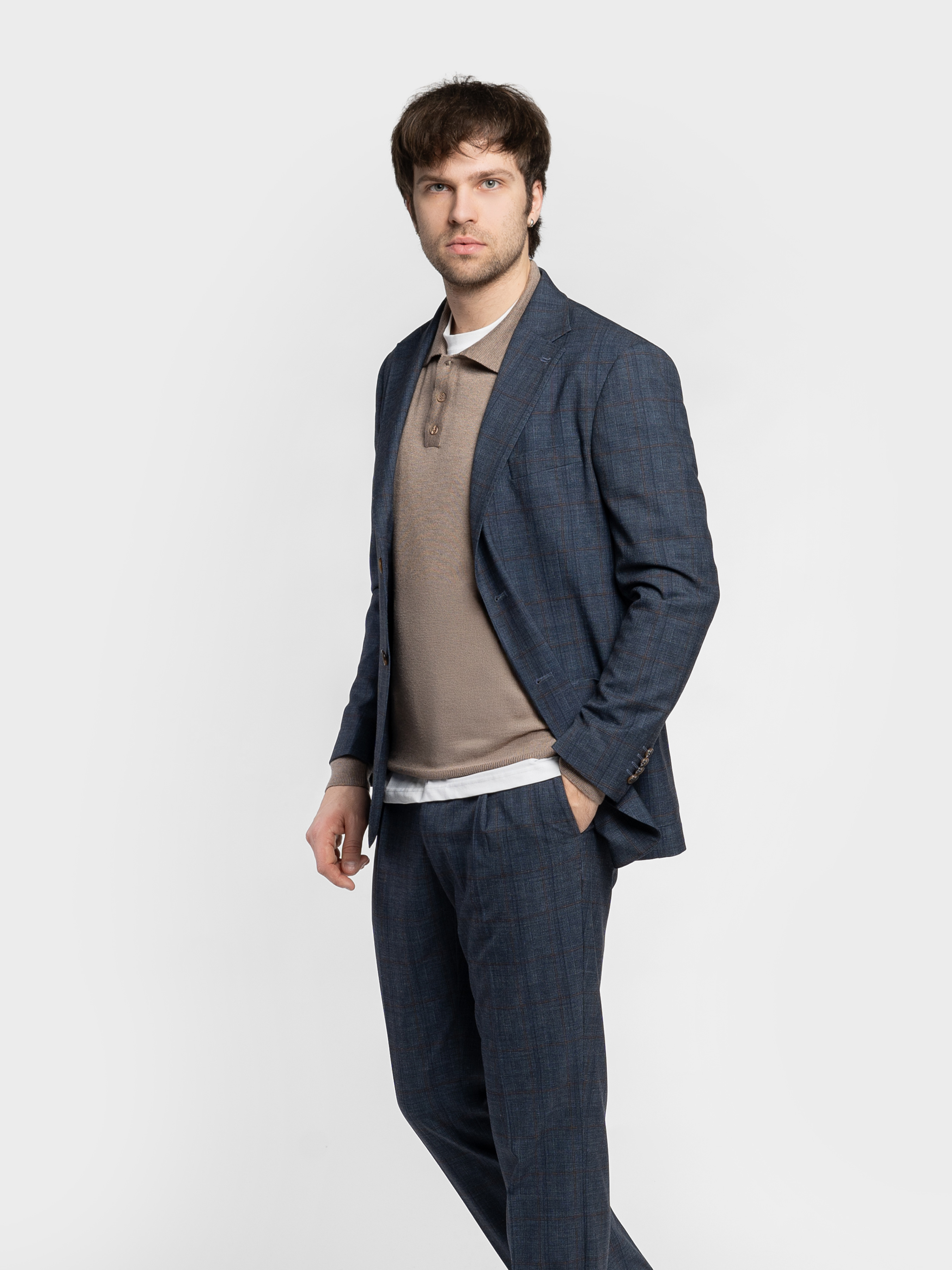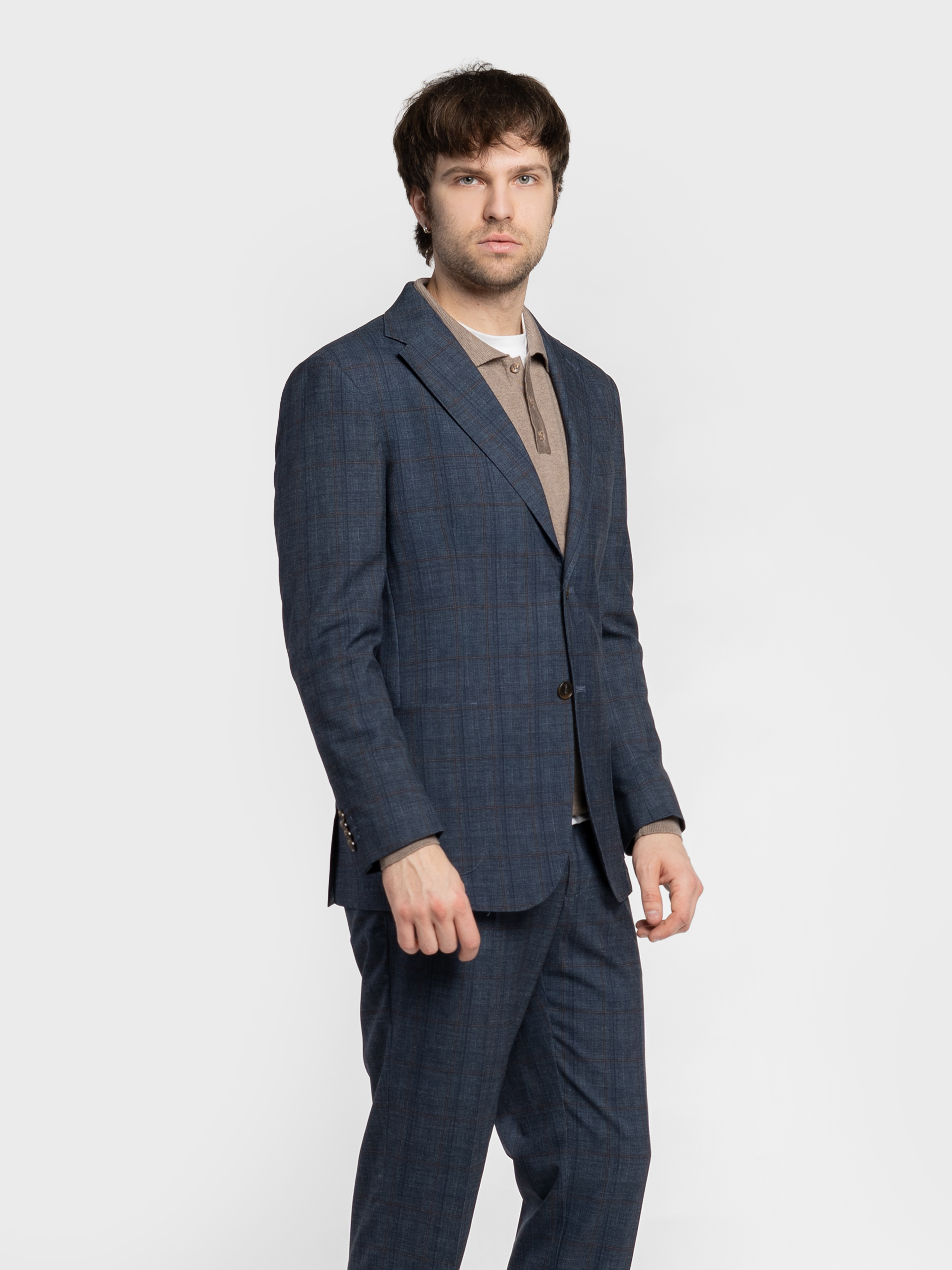 Мужской пиджак Arber синего цвета в клетку, созданный из мягкой ткани на основе шелковистой вискозы с добавлением эластана. Материал тянется, не мнется и сохраняет форму даже при активном ритме дня. Модель имеет классический крой, аккуратные лацканы и продуманную посадку. Оснащена двумя накладными карманами и одним нагрудным. Идеально сочетается с брюками M01.03.09.611 из той же ткани, для стильных офисных образов, встреч с друзьями или вечерних выходов — легко сочетается с брюками, джинсами. Модель на фото в размере 48. Рост: 185 см. Параметры: 103/78/100