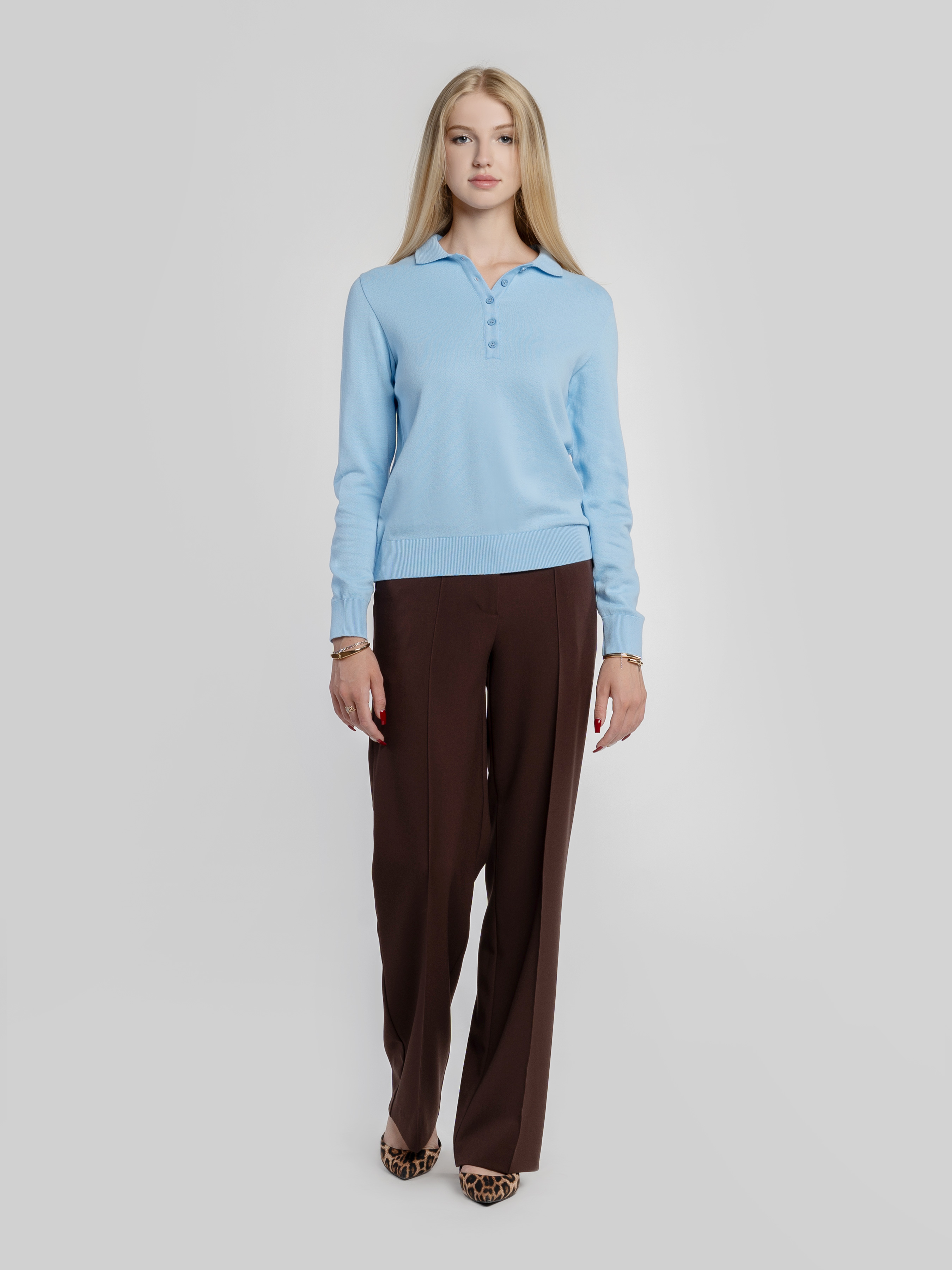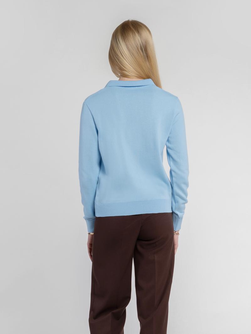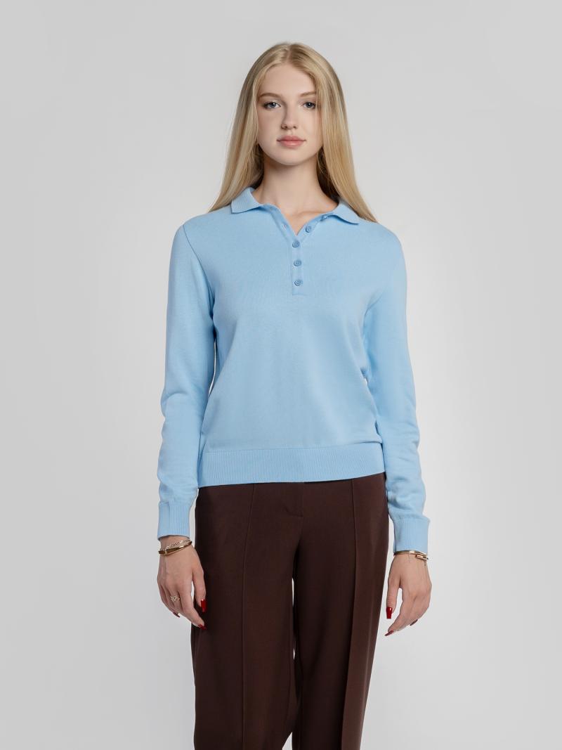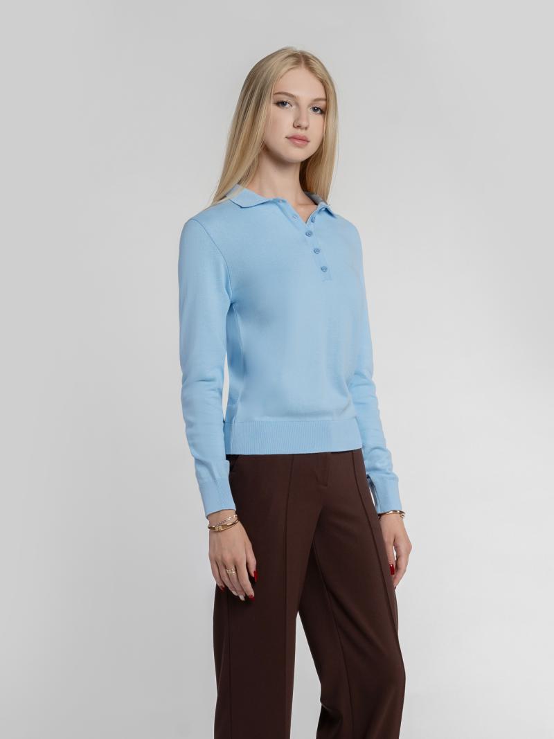 Женское поло Arber голубого цвета, связанное из тонкой пряжи высококачественного хлопка. Модель с длинным рукавом и застежкой на пять пуговиц. Легкая, мягкая на ощупь ткань дарит комфорт и изящество в ежедневных образах. Модель на фото в размере 42. Рост: 173 см. Параметры: 80/65/90