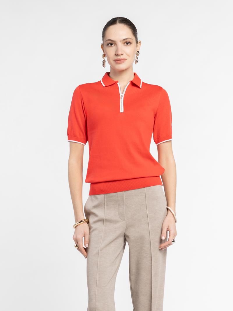 Женское поло Arber красного цвета, связанное из тонкой пряжи из 100% высококачественного хлопка. Легкая вязка из натурального волокна приятна на ощупь и обеспечивает комфорт в течение всего дня. Благодаря тонкой текстуре модель хорошо пропускает воздух и дарит ощущение свежести. Застежка на молнию придает образу современную сдержанную элегантность. Поло легко сочетается с брюками, джинсами или юбками, создавая уверенный и утонченный повседневный стиль. Модель на фото в размере S. Рост: 175 см. Параметры: 84/61/91