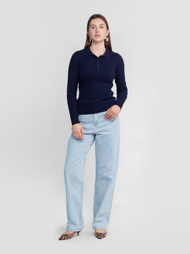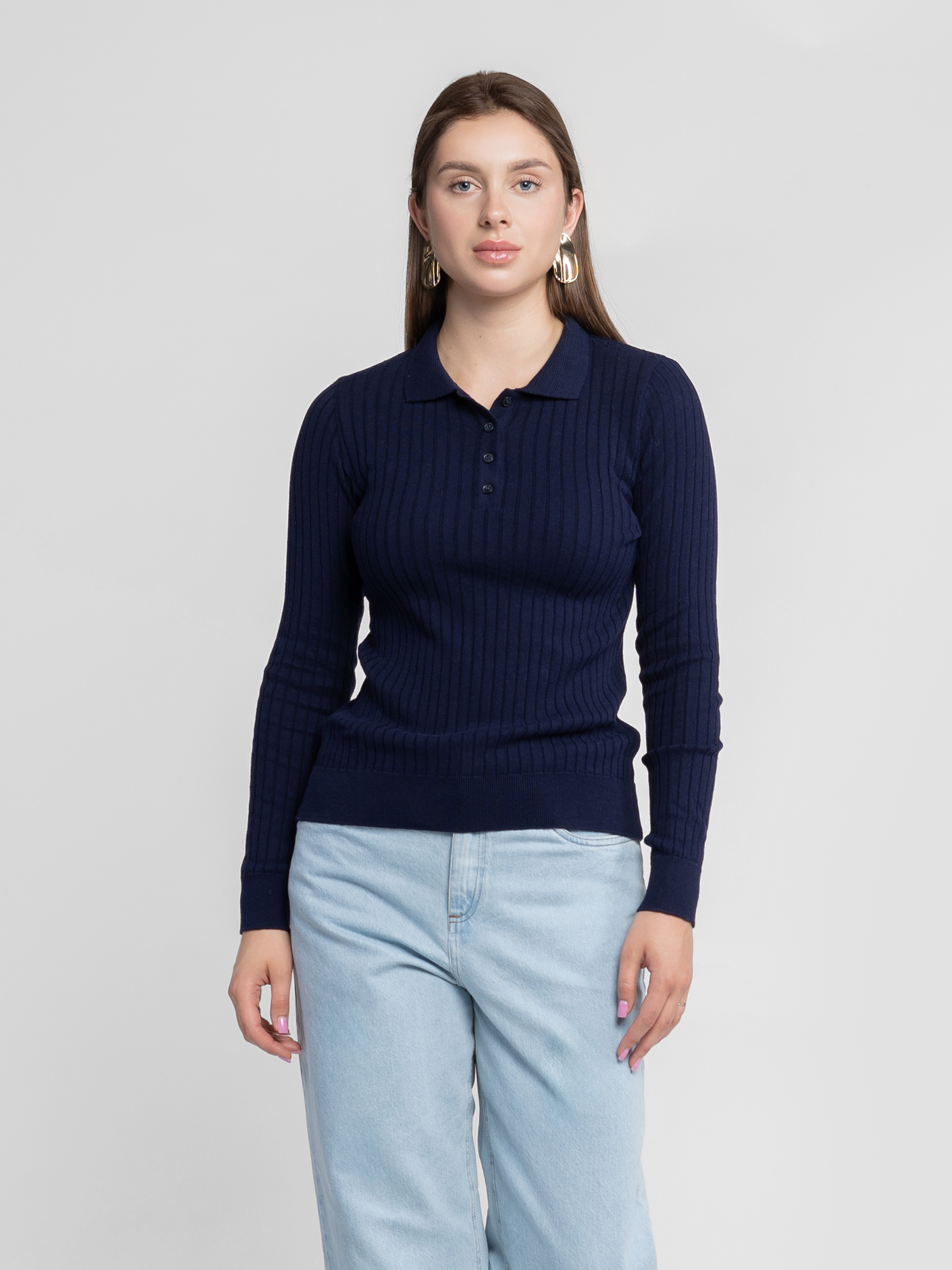 Женское поло Arber, темно-синего цвета в рубчик.100% натуральный хлопок, мягкий трикотаж нежно облегает фигуру и не сковывает движений. Застежка на пять пуговиц и длинный рукав создают лаконичный крой и делают модель универсальной для ежедневных casual-луков или layering-комбинаций. Модель на фото в размере 42. Рост: 168 см. Параметры: 86/65/96