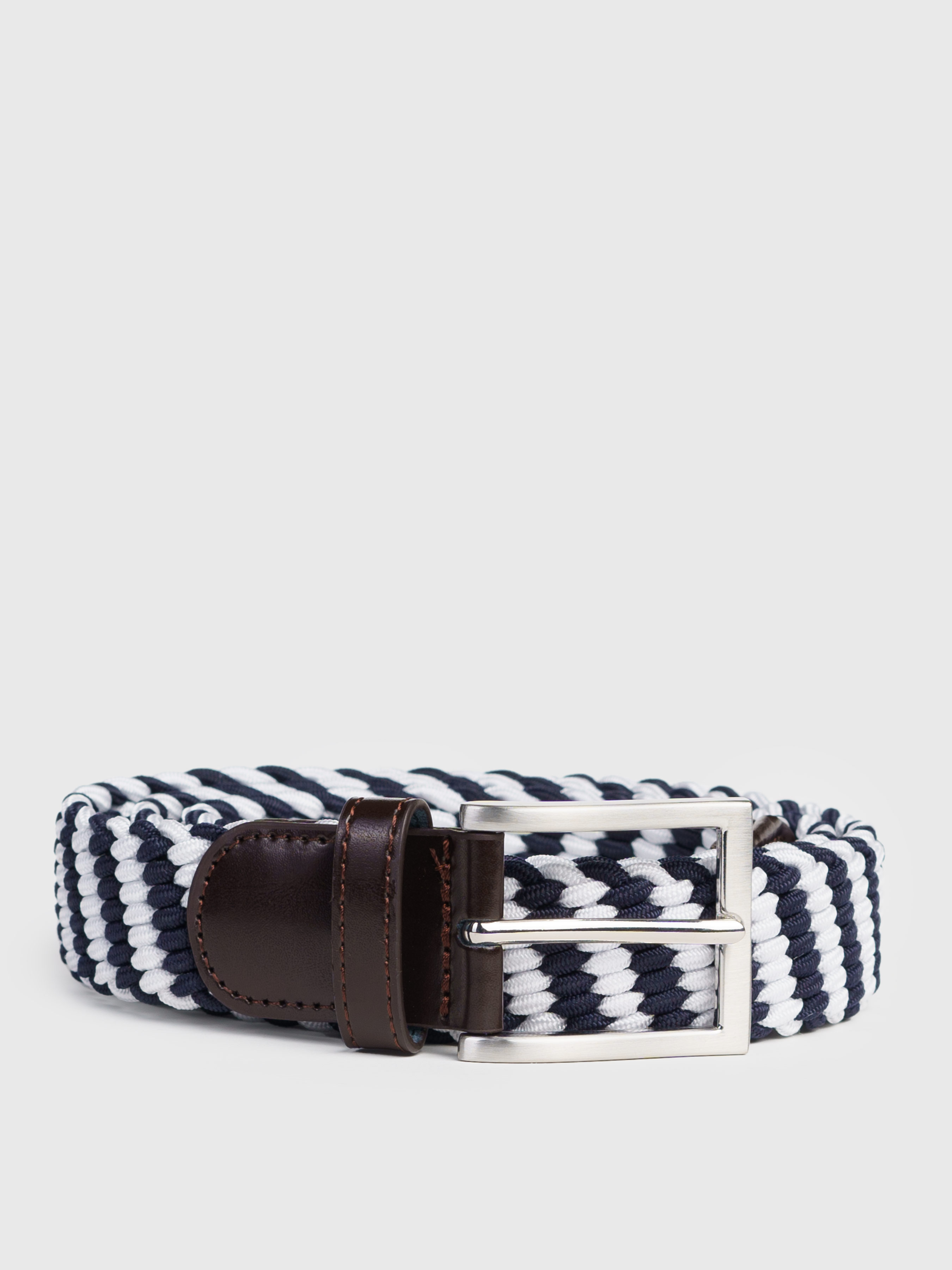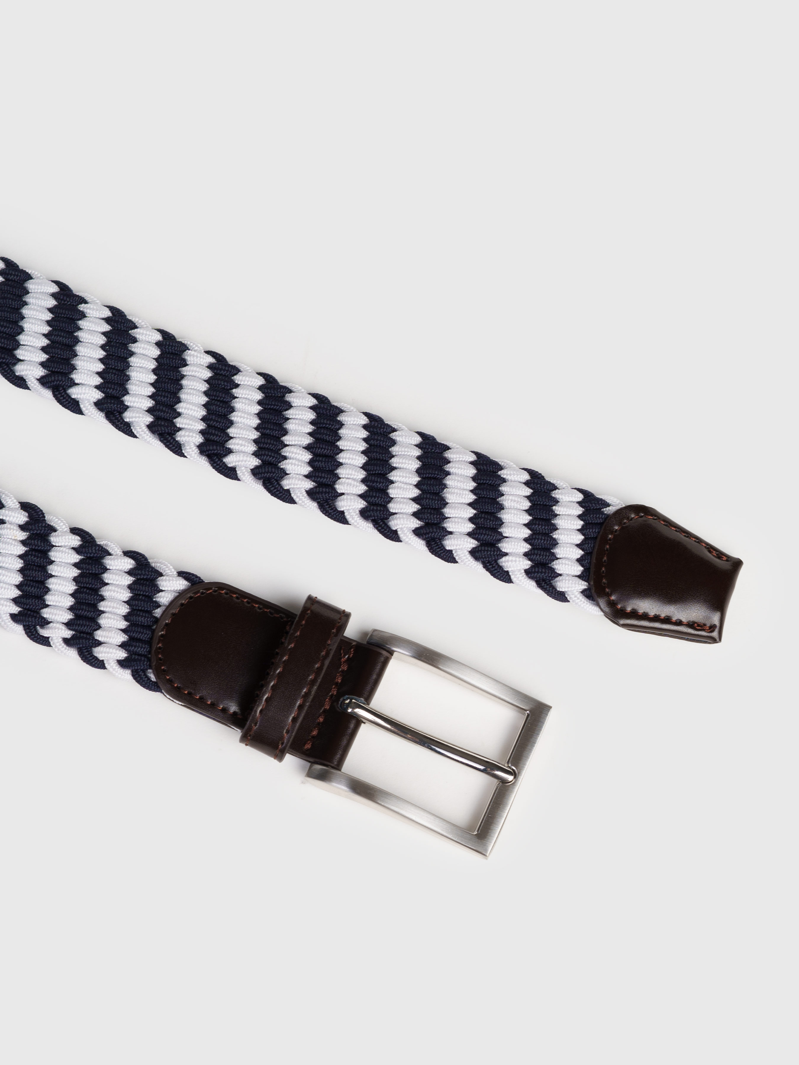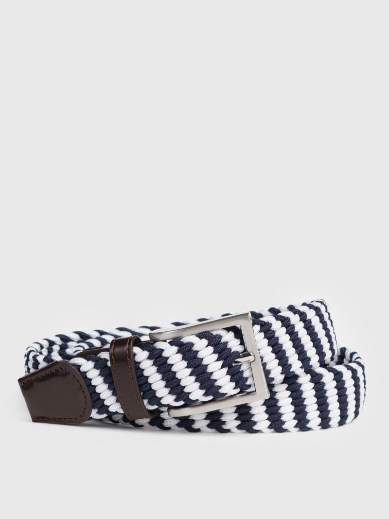 Мужской ремень Arber сплетенный узором меланж из прочного эластичного материала двух цветов: синий и белый. Ремень добавляет текстуры вашей одежде с помощью плетеного дизайна, причем контрастные детали создают интригующее соседство с гладкой кожаной отделкой и удачно сочетается с образом в стиле casual.