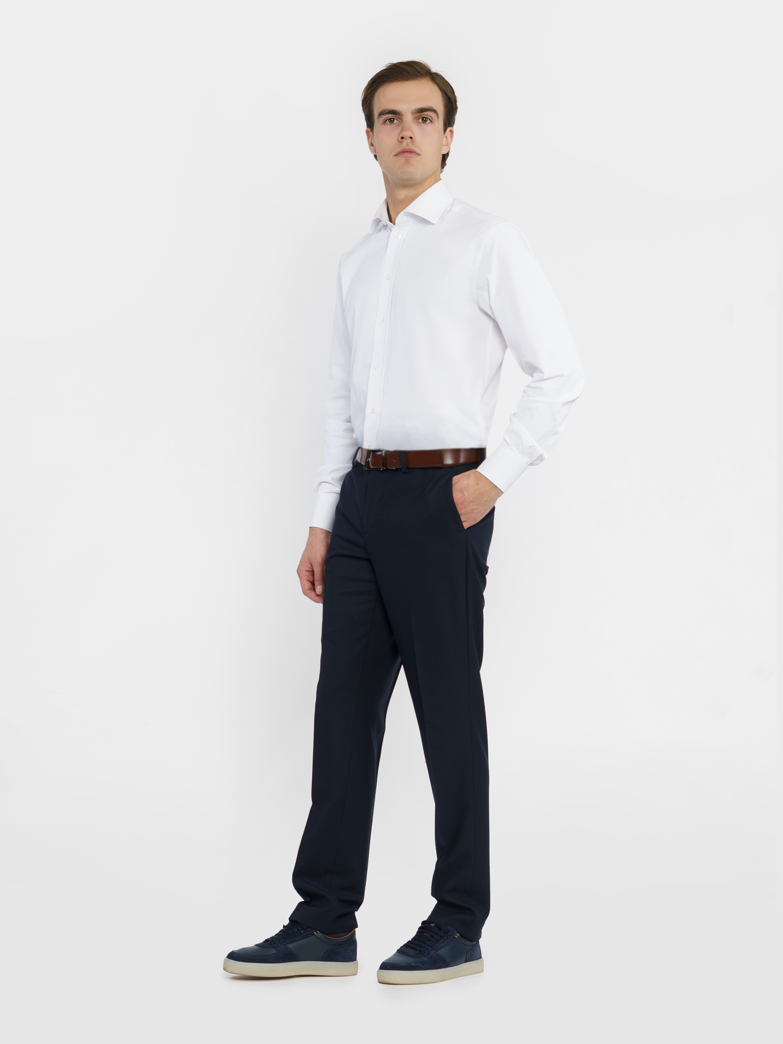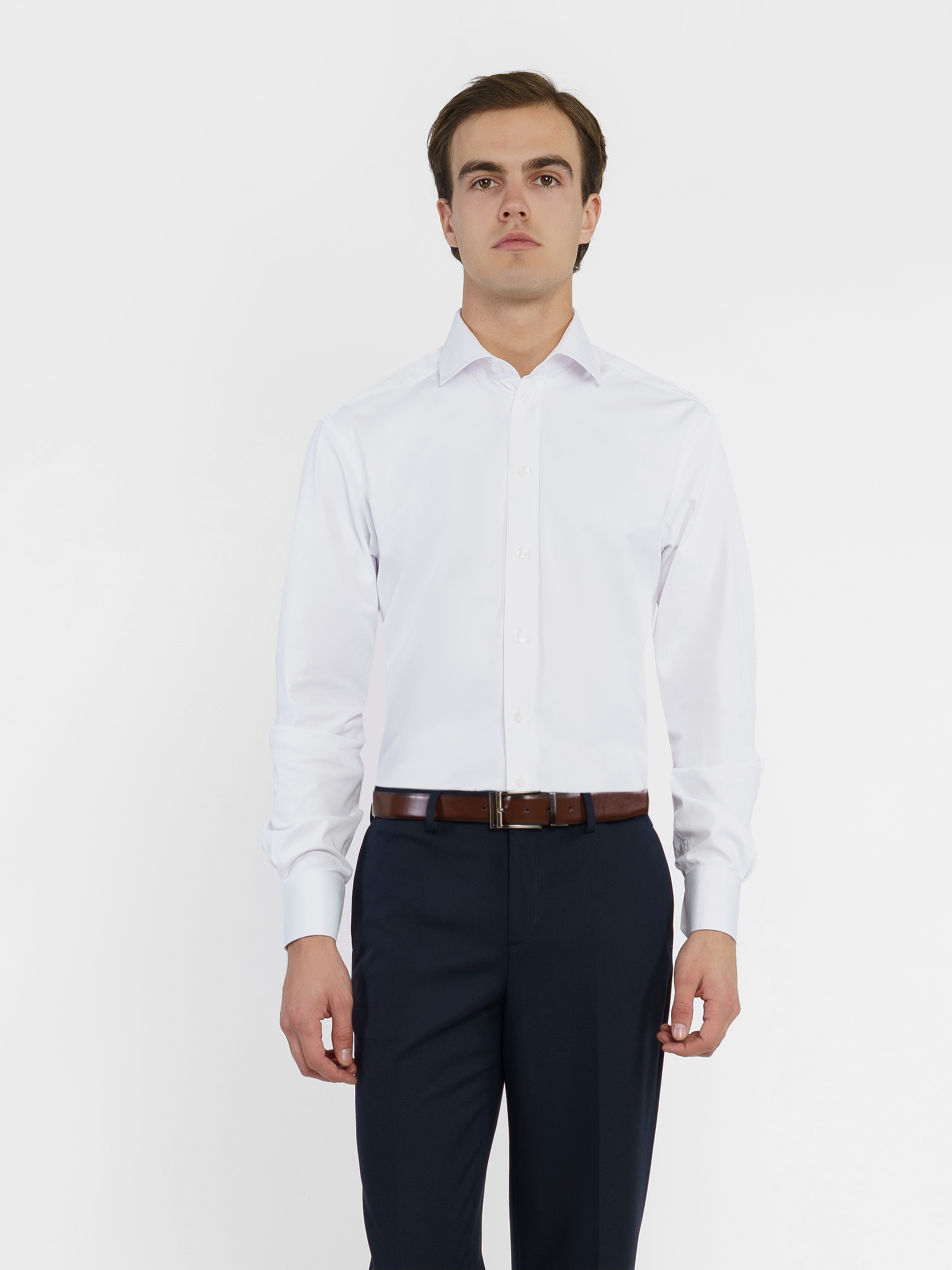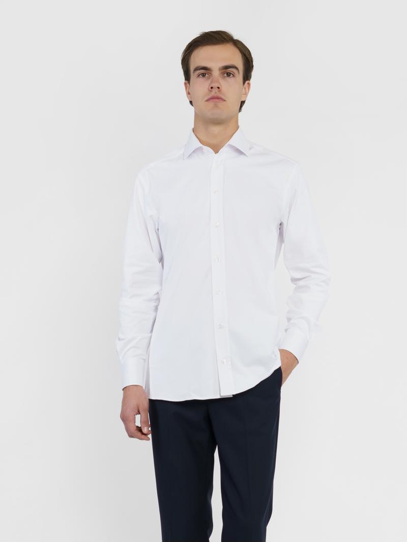 Белая мужская рубашка Arber - основа базового гардероба делового мужчины. Модель полуприлегающего силуэта создана из легкой ткани на основе хлопка с эластаном. Модель с отложным воротником и регулируемыми манжетами которые застегиваются на пуговицу, на спинке обработана двойная притачная кокетка, линия низа фигурной формы. Эта элегантная рубашка хорошо подойдет к любому костюму, пиджаку или деловым брюкам. Модель на фото в размере 48. Рост: 185 см. Параметры: 92/71/89
