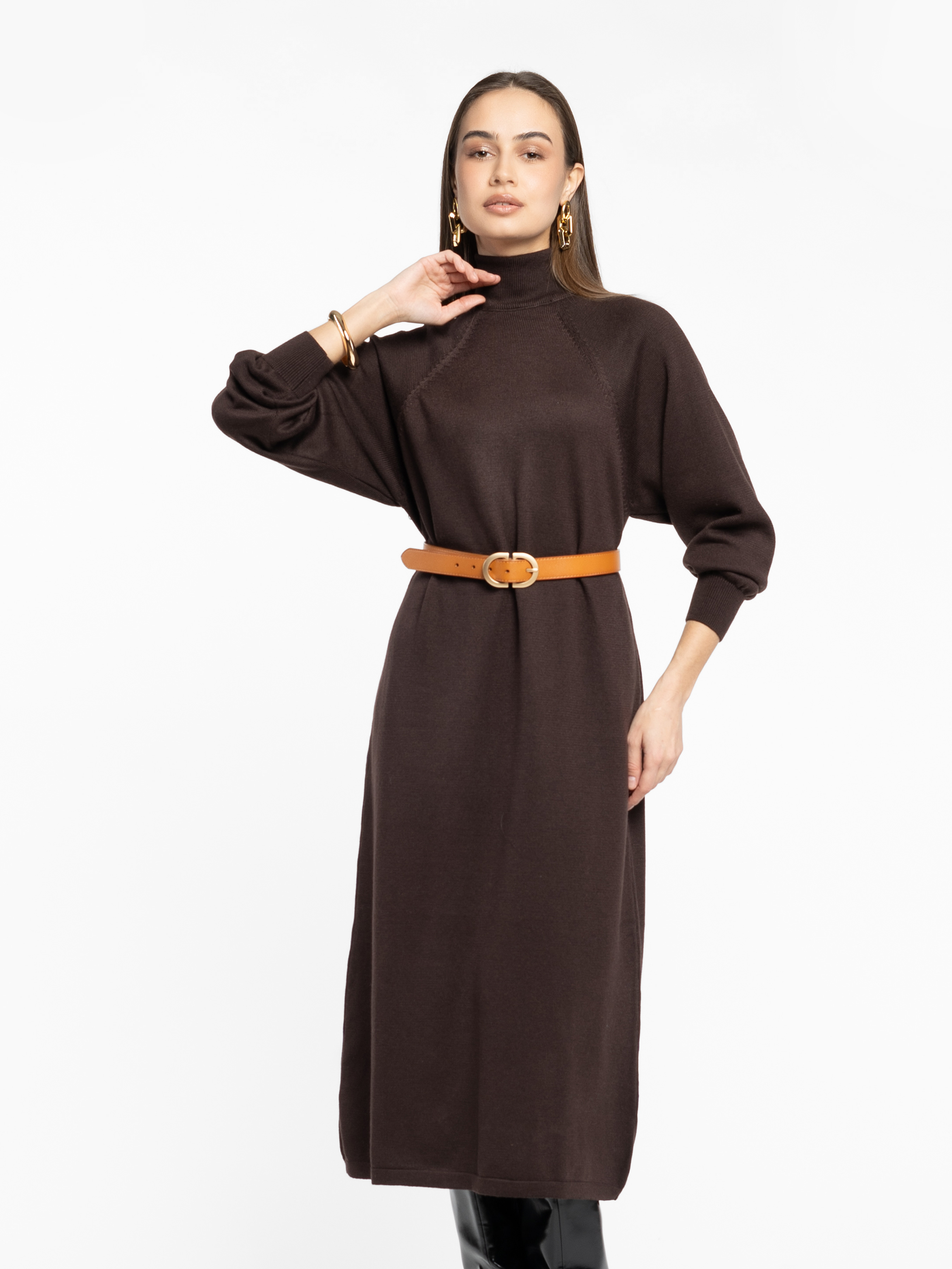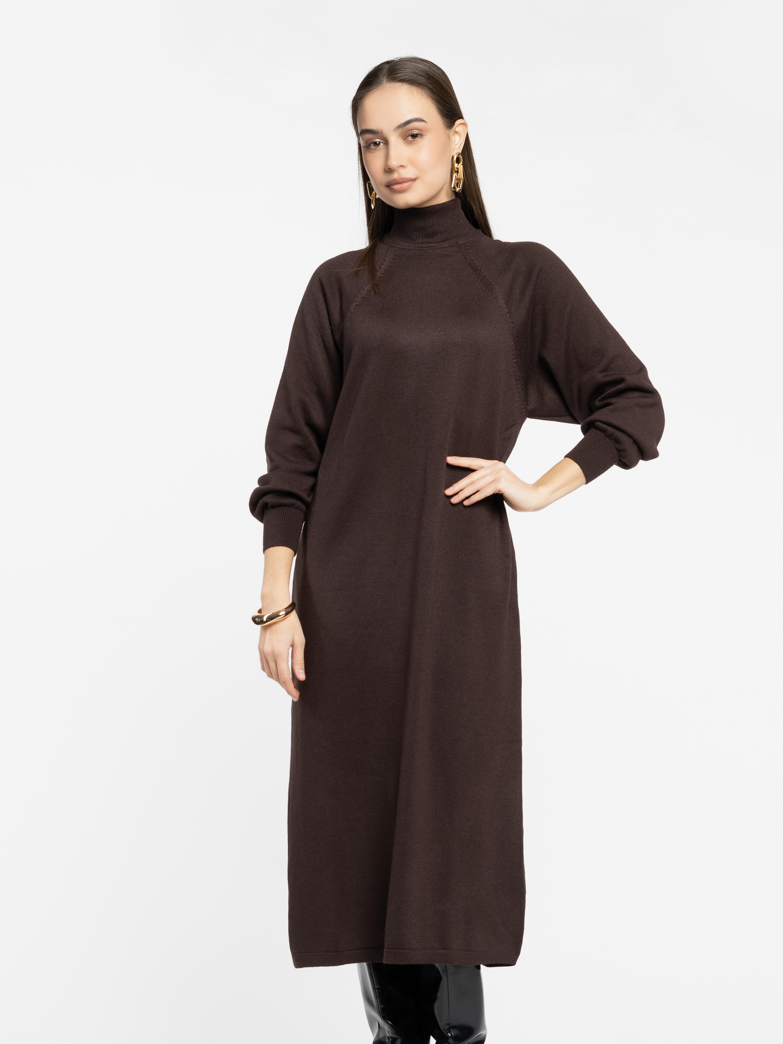 Женское платье Arber коричневого цвета, длины миди в прямом силуэте. Мягкий трикотаж с преобладанием хлопка, комфортный к телу. Высокая горловина и спущенная линия плеча формируют современный элегантный образ. Легко адаптируется под стиль дня или вечера. При желании — можно дополнить поясом для акцента на талии. Модель на фото в размере 42. Рост: 178 см. Параметры: 89/60/90