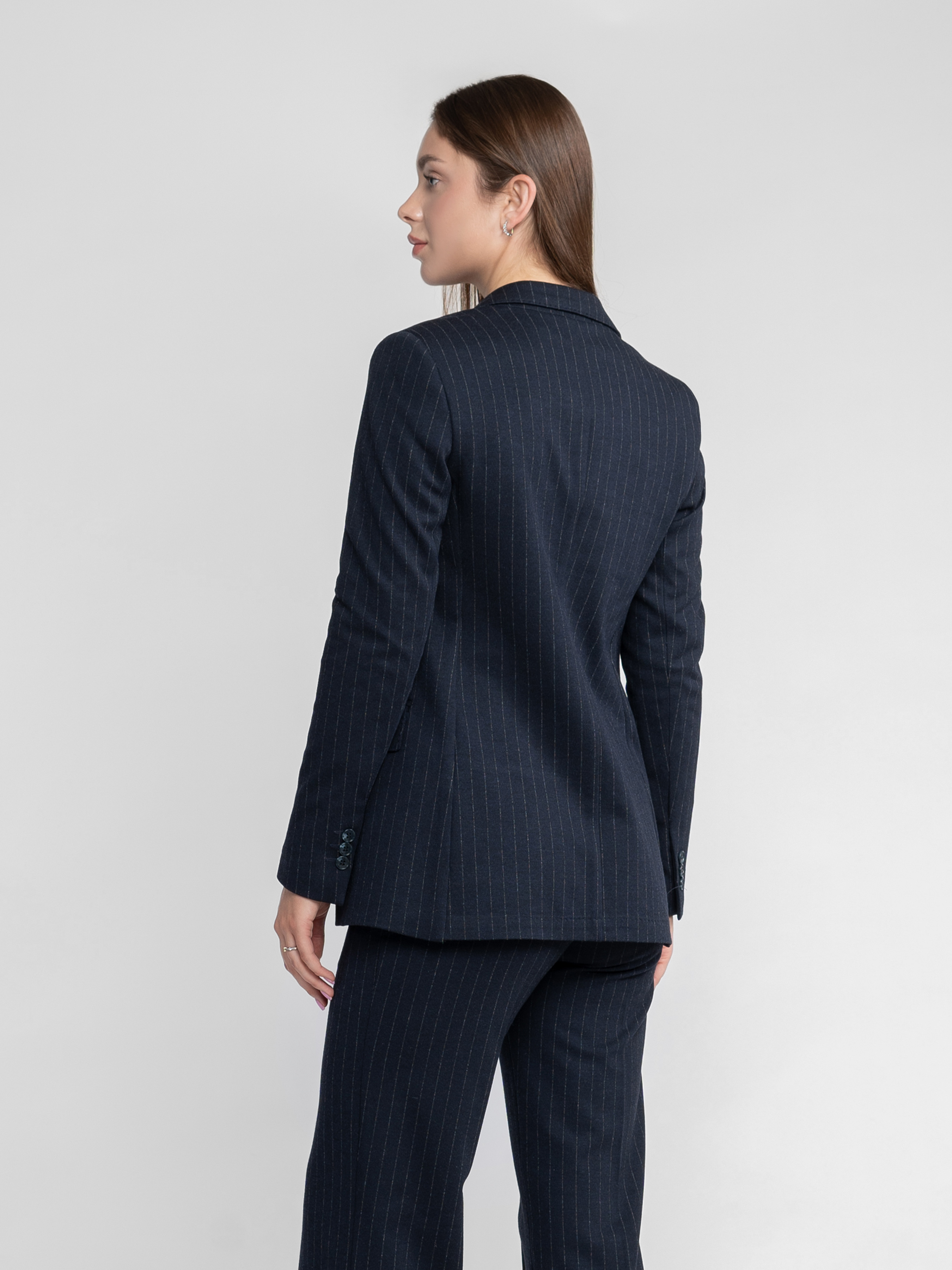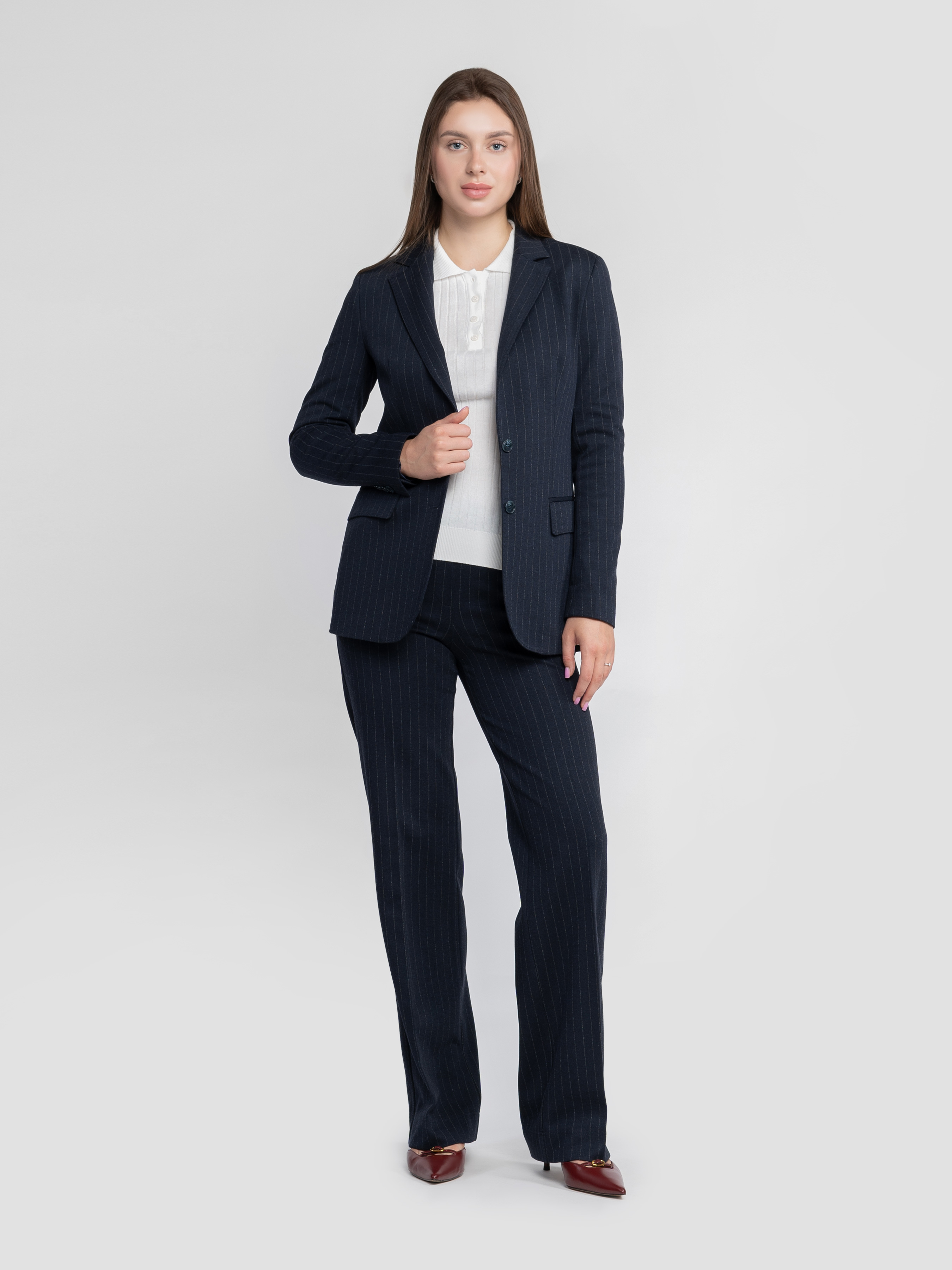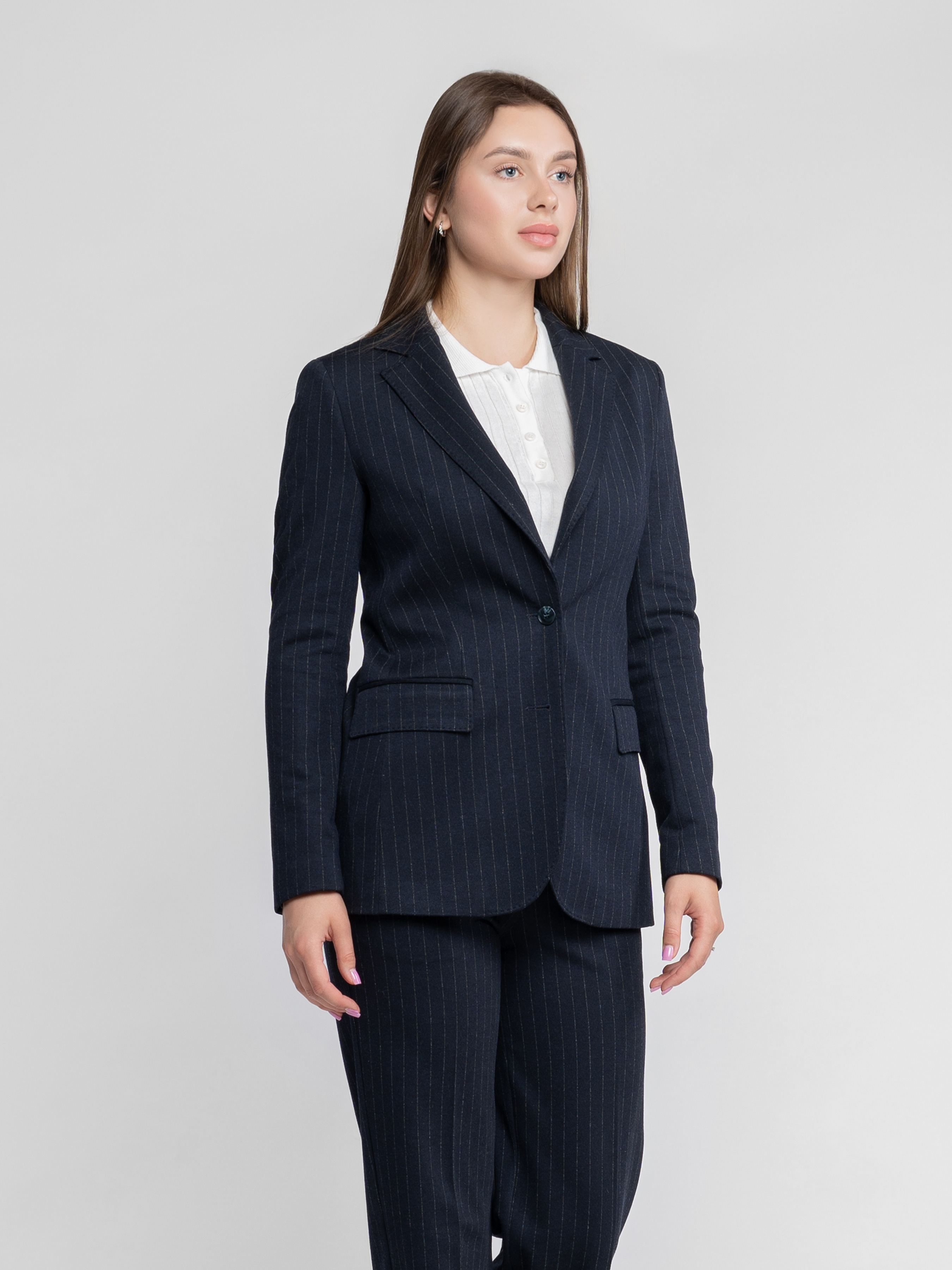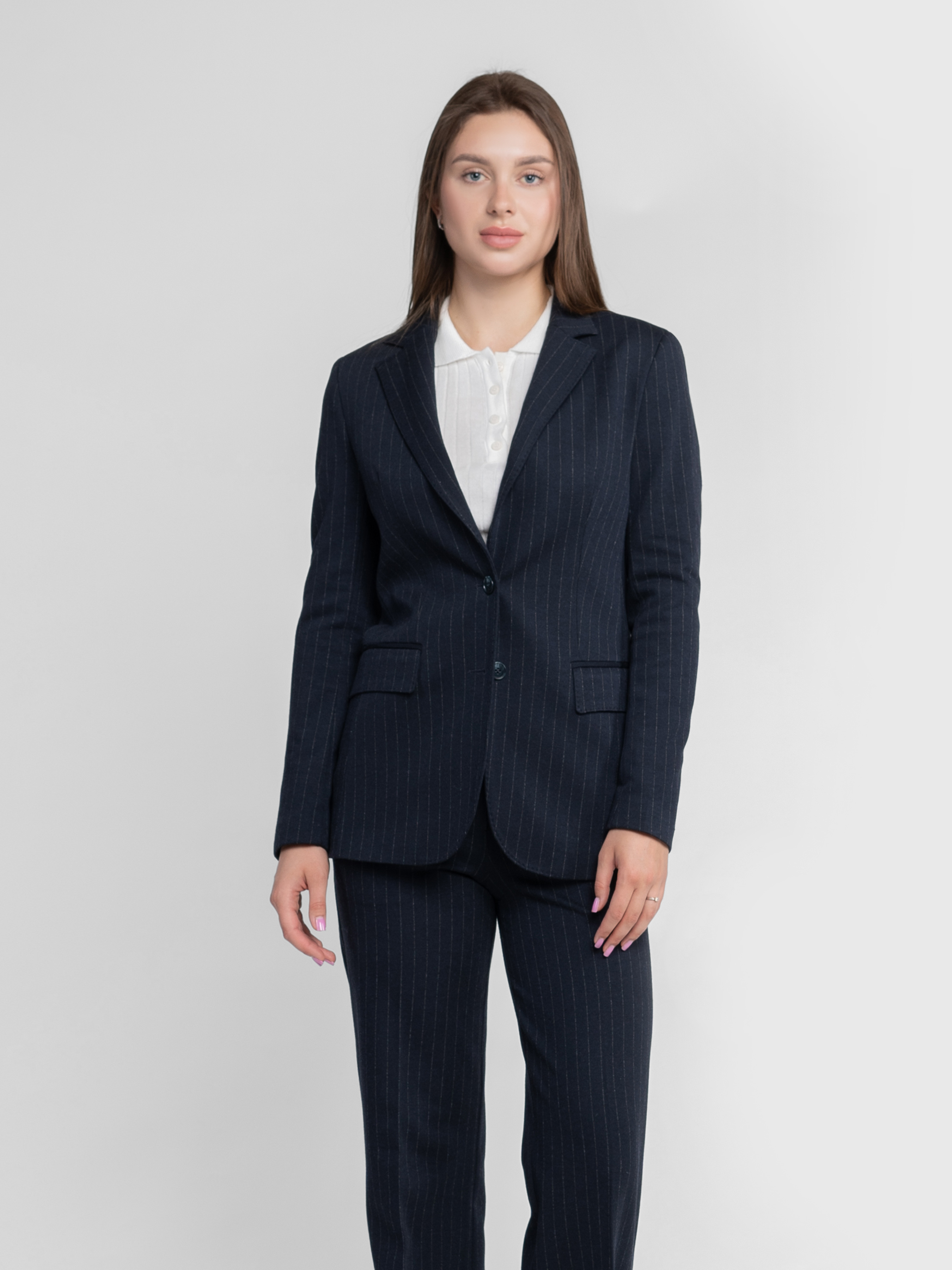 Женский трикотажный жакет Arber темно-синего цвета в тонкую полоску. Приталенный силуэт выразительно подчеркивает фигуру, а мягкая эластичная ткань с вискозой обеспечивает комфортную посадку и свободу движений. Однобортная застежка, прямые лацканы и прорезные карманы с клапанами формируют лаконичный, современный образ. Создает стильный total look с брюками W01.05.09.532 или W01.06.09.532 из той же ткани. Модель на фото в размере 42. Рост: 168 см. Параметры: 86/65/96